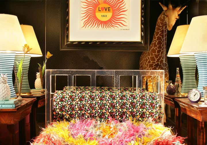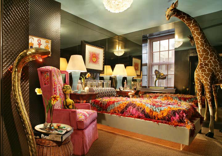 The Kips Bay Showhouse in 2011 was our first important one. The house that year was a beautiful townhouse once belonging to the Whitney family and we decided to name our room Kate s Hideaway . Bare of any architectural detail and with only one window, the room was mainly covered in smoke colored mirror panels laid out to fit the walls and even provide a mirror crown molding . We developed a custom colored version of a wall covering with Phillip Jeffries called Harry s Chocolate which was carried in their line for a while to cover the rest of the walls. The carpet came from Stark, a sadly discontinued pixilated cheetah pattern. A Charles Hollis Jones floating (on plexiglass-glass) and lit bed with an amazing acrylic headboard came from R Company, we selected a Tulu rug from Double Knot Gallery as a covering, the bolster pillow is covered in an haute couture jeweled material from Jakob Schlaepfer in Switzerland. Two antique side tables from Florian Papp, Chris Spitzmiller ceramic lamps, Yves Saint Laurent Love poster from 1972, which was framed by J.Pocker, a custom wing chair from Baron upholstered in a raspberry colored velvet from Scalamandre and an outline quilted Lilly Pulitzer fabric (taken from a vintage caftan), a huge toy giraffe presiding in a corner and a rock-crystal flush ceiling fixture from CL Sterling Son to complete the picture....
