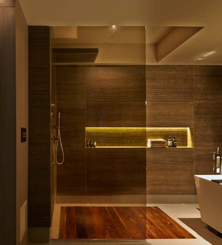 A patina metal still kitchen cabinetry was custom made by a vendor in Salem, Oregon and shipped in pieces to Puerto Rico where it was assembled and finished. The two slabs of walnut wood are united by brass bows what give the dining table an amazing feel of luxury. The wood selected for the table was a diligent process of looking at over 150 slabs of wood. The master bathroom inspiration is based on the owners experience of living in Asia. The use of teak wood for the rain shower and the oversized brown slabs of marble create a feeling of zen blend with luxury.