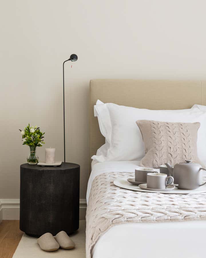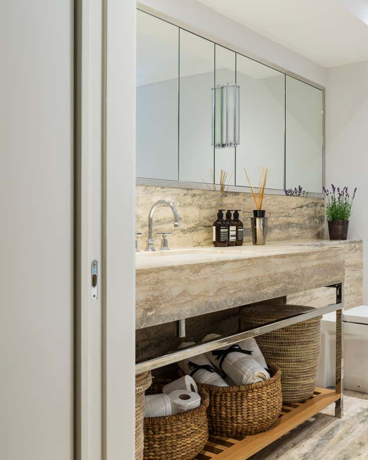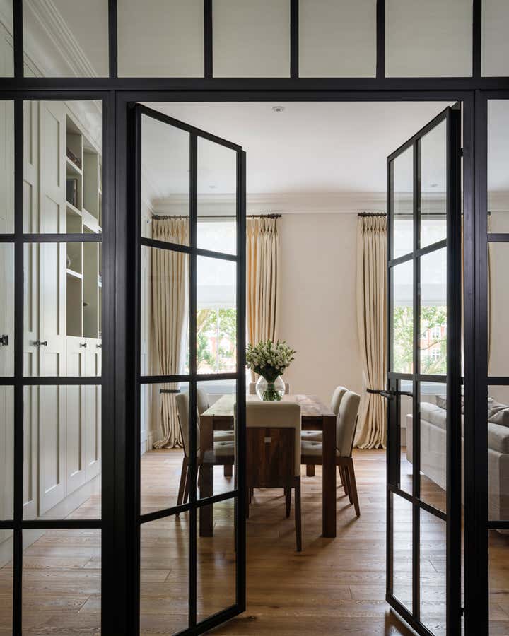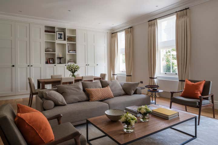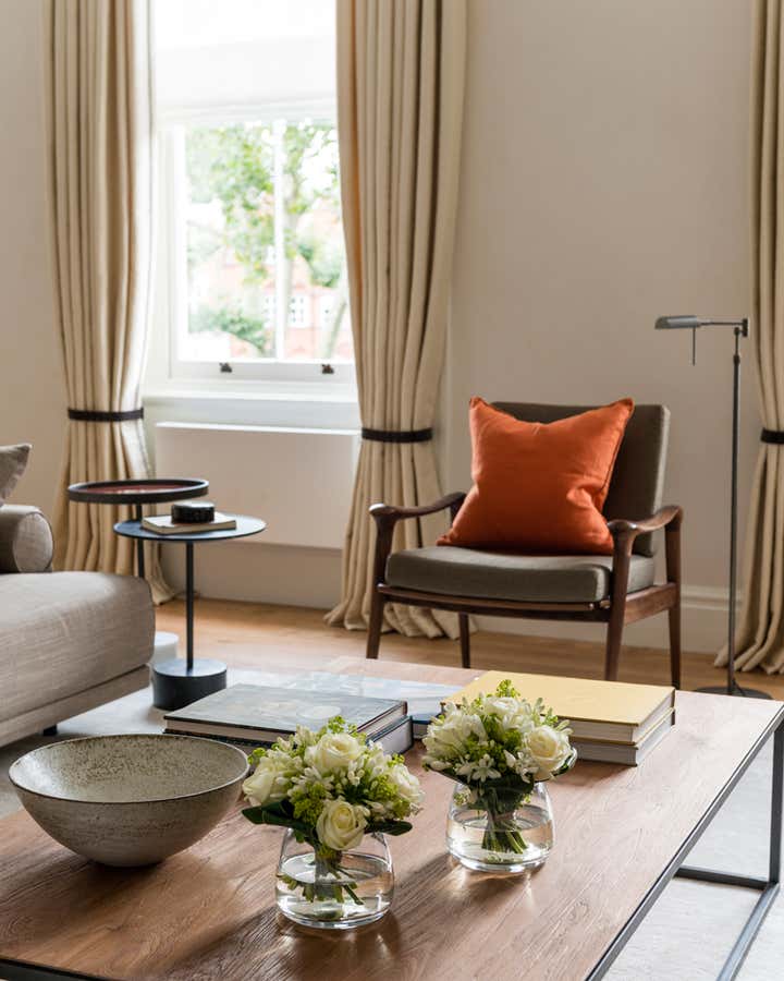 This hip bachelor pad in Knightsbridge was completely remodelled and furnished. Here we created an atmosphere that is decidedly mid century but fits seamlessly into the originally Georgian space. The calm, masculine lines and luxurious finishes, along with the neutral colours and layered textures attest to our young client’s aesthetic.