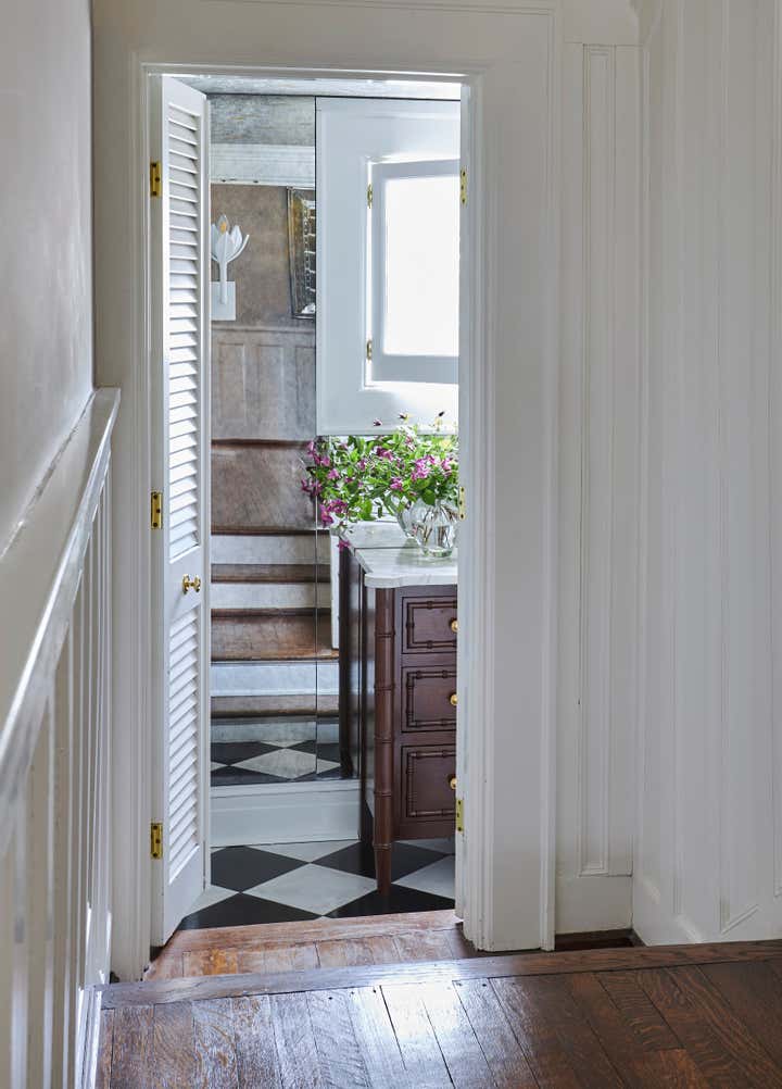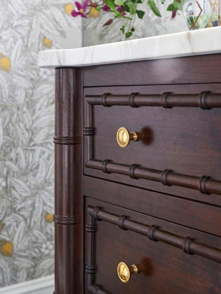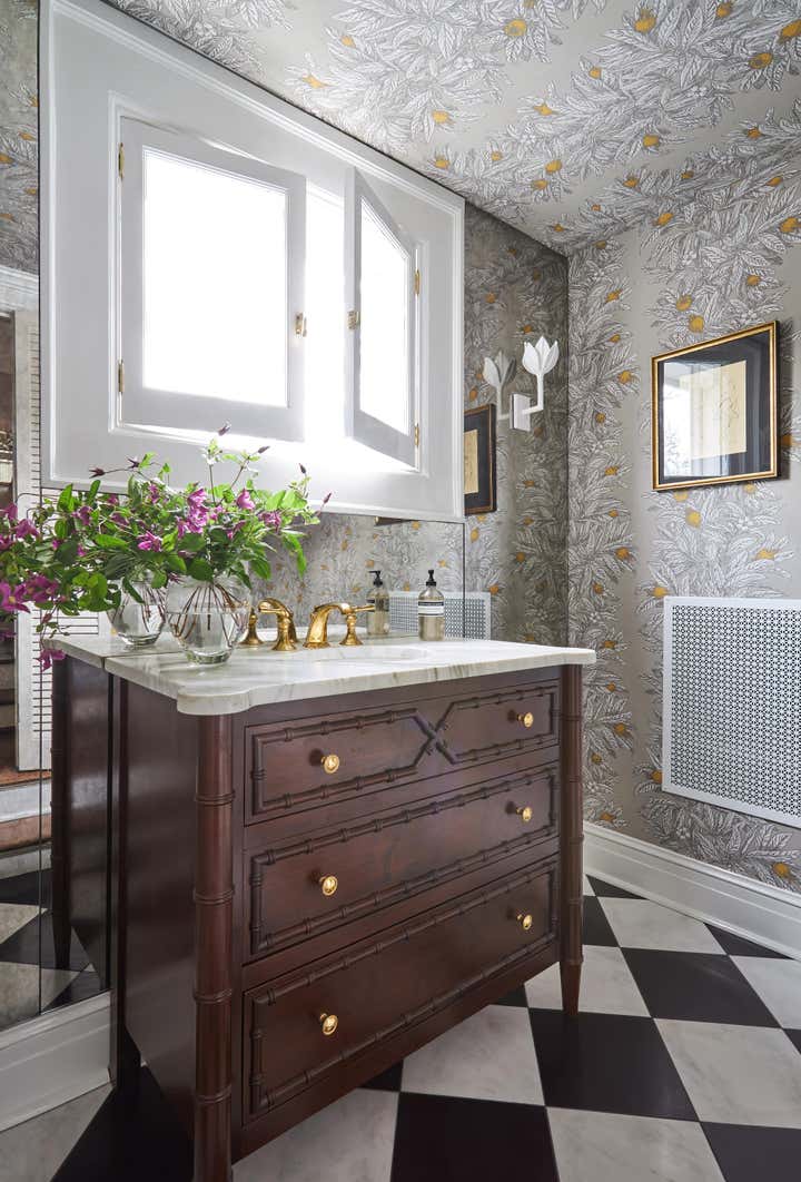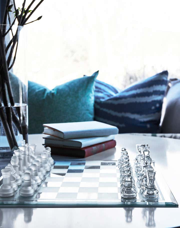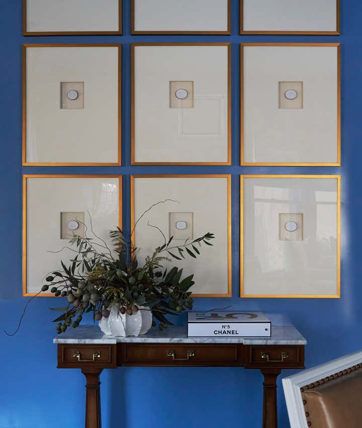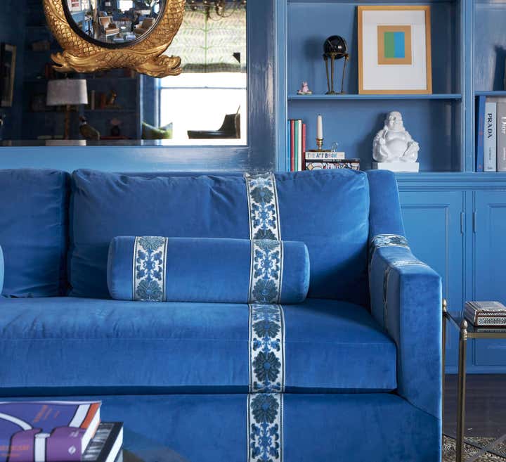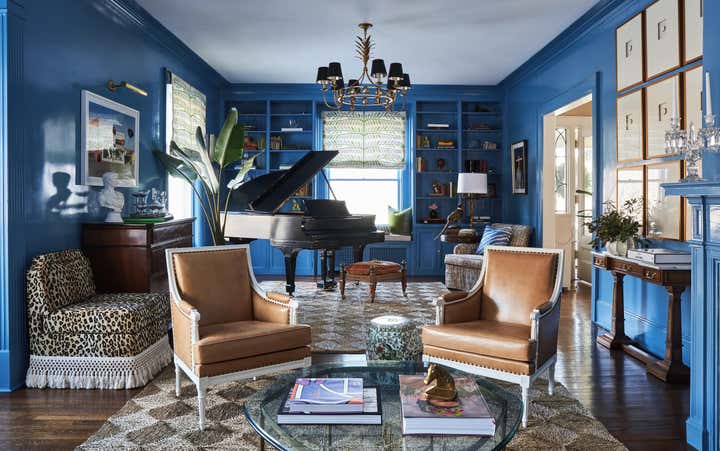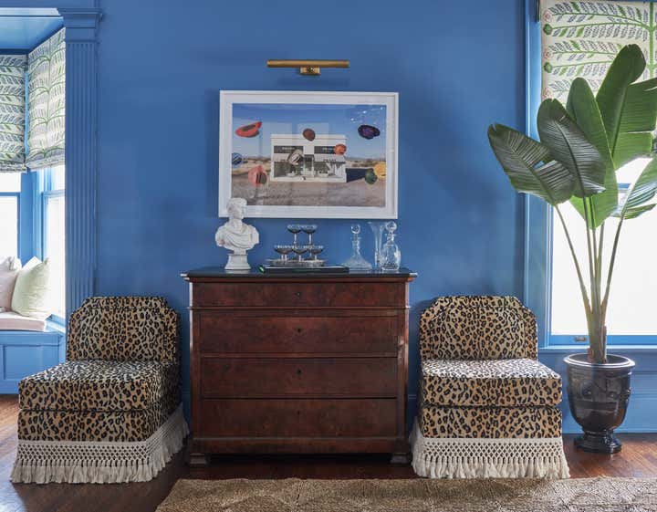 When this return client came to us with her new home she knew she had to have one thing: vibrant blue walls. We laugh a lot in our office that we aren’t exactly your white and blue designer but in this case we had a love affair with Farrow Ball Cook’s blue. The rich French blue was so vibrant and soothing at the same time, a coat of lacquer seemed to be the only thing this room needed. Yet most know that we, of course, couldn’t stop there. We doubled down with an equally vibrant blue velvet sofa trimmed in a sumptuous floral trim, covered the windows in Schumacher’s Thistle fabric which brought in the subtlest pop of blush, a grass green and, of course, our vibrant French blue. We carried the blush onto the game chairs in another Schumacher chevron velvet. Antique bergere lounge chairs in a camel leather and a woven seagrass rug by Chairish provided the perfect “off" colors to balance the bright scheme. And, of course, it wouldn’t be a Sarah Vaile Design project without a touch of leopard on custom tasseled slipper chairs.