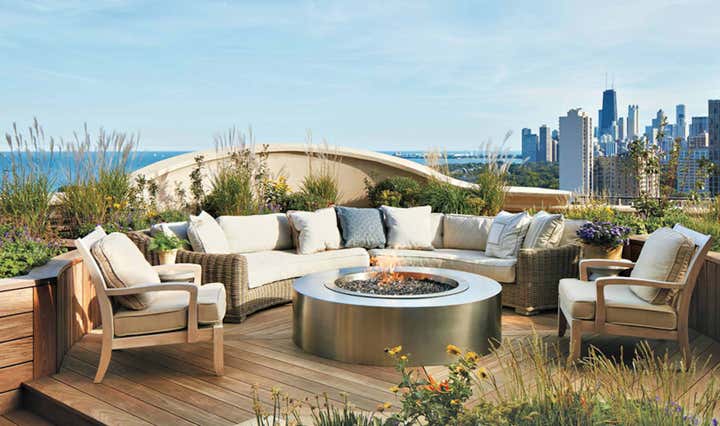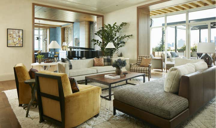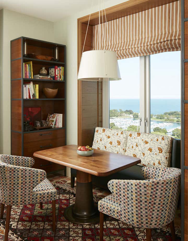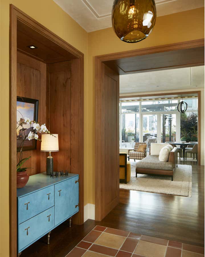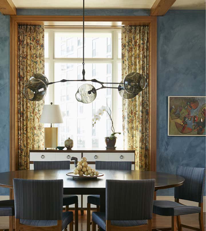 For an apartment in Chicago’s Lincoln Park neighborhood, we created a casual yet sophisticated space. Drawn to several different styles, the client wanted texture and warmth. Through listening, translating and refining their ideas, we married elements of city and country living. Inspired by views of Lake Michigan, a blue thread carries subtle color through the home. In the dining room, blue plaster walls and horsehair-upholstered chairs contrast with curtains in a provincial-inspired print. In the entry, a cabinet wrapped in cerulean leather tempers the warmth of wood floors and terra-cotta tiles. The project brought designer, architect, and client together in a shared process of discovery.