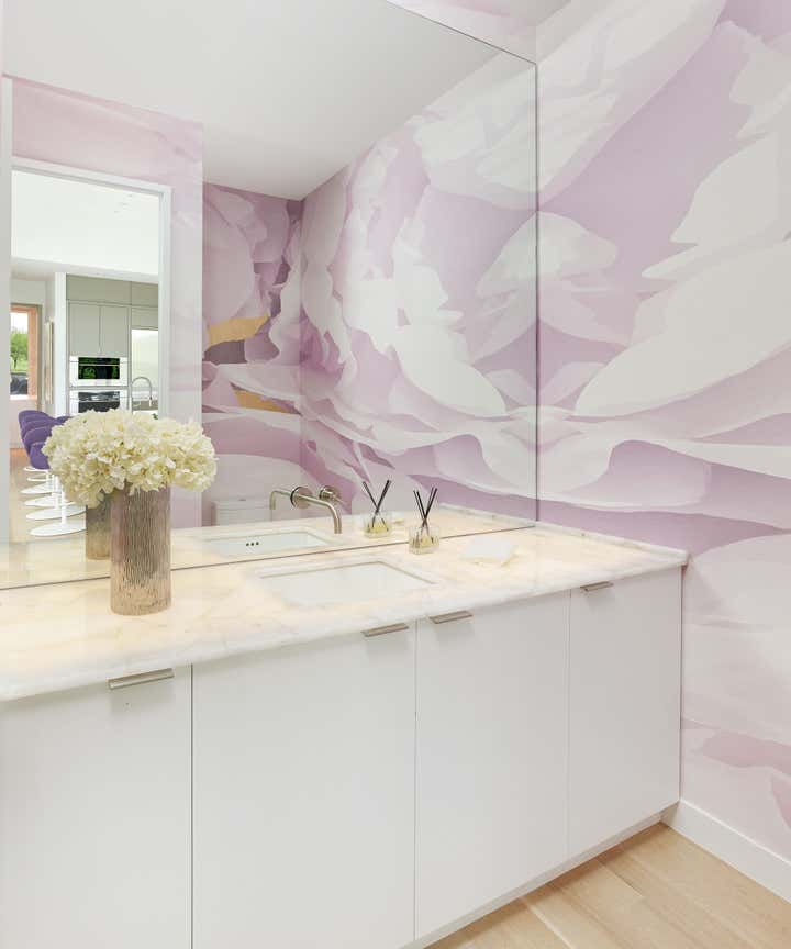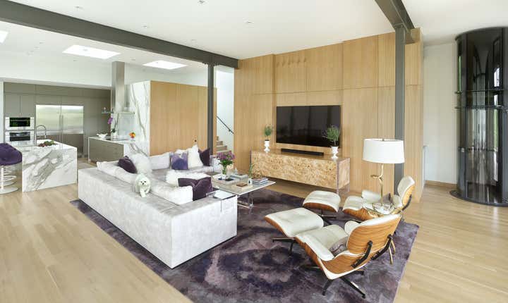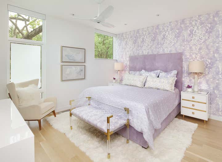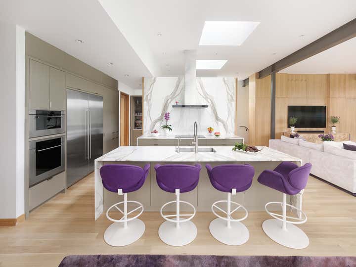 Open concept living, bringing the outdoors in while providing the highest level of privacy and security drives the design of this three level new home. Priorities: comfortable, streamlined furnishings, dog friendly spaces for a couple and 2 to 4 guests, with a focus on shades of purple and ivory.