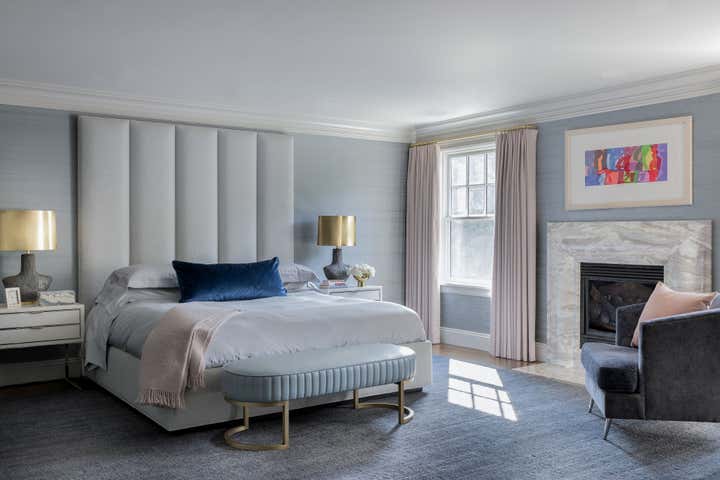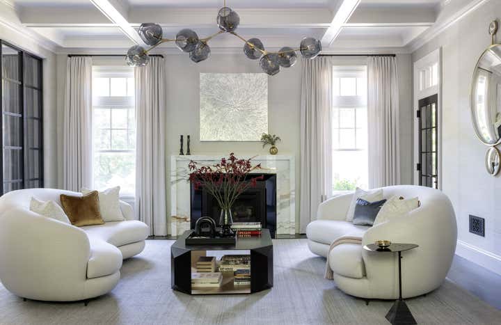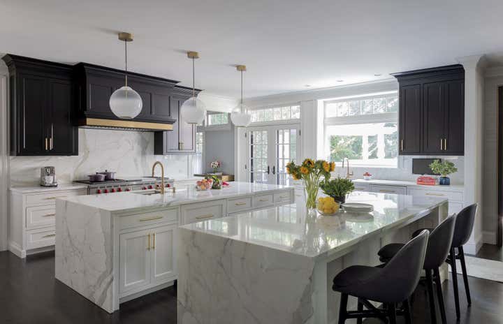 When a former client returns with a new project, it reflects an exceptional level of trust that makes the design process all the more rewarding—and the results speak for themselves. Years after a successful renovation together, this family returned to Elms Interior Design to refresh their 1999 shingle-style home for life with three kids and three dogs. The dated interiors were updated through thoughtful cosmetic changes, including new wallcoverings, material enhancements, artful lighting, and a cohesive paint palette. To improve flow between the kitchen and dining room, outdated columns were replaced with steel-and-glass transom panels, creating a more open connection. Marble waterfall-edge islands, a new backsplash, blackened cabinetry, and brass detailing add contrast and polish to the kitchen. Stone-clad fireplaces and a curated mix of vintage and modern pendant lighting bring warmth and refined elegance throughout the home.