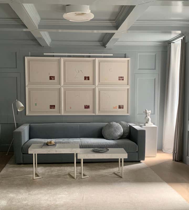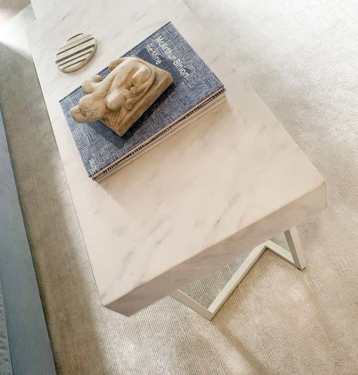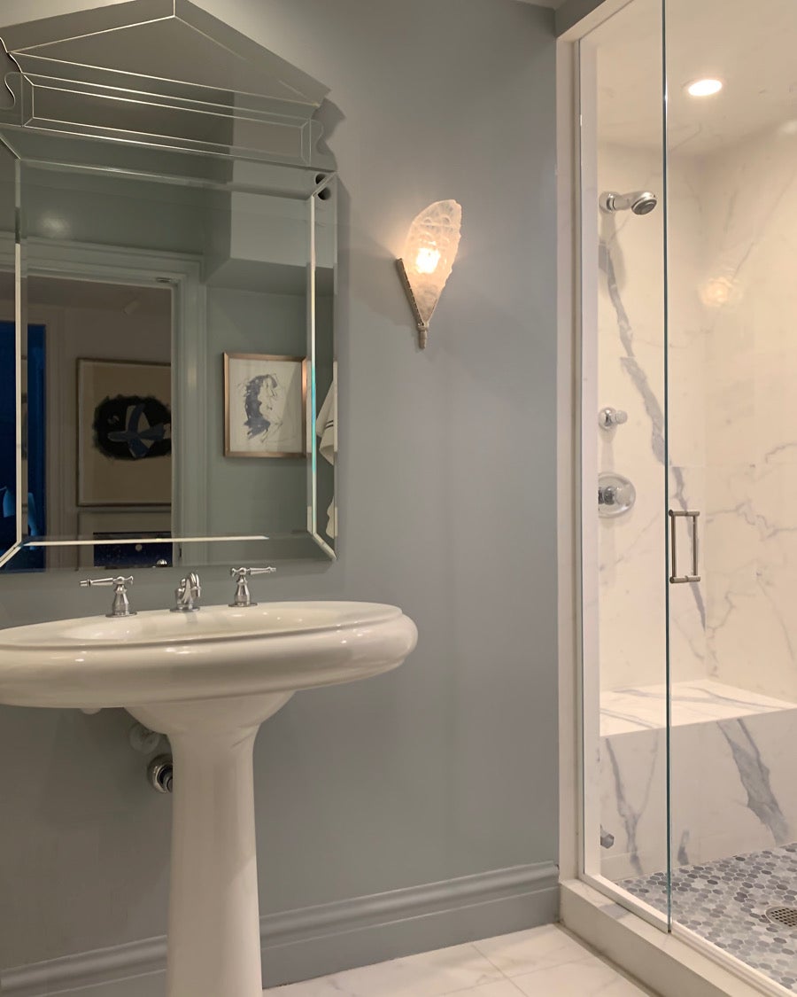 A library suite featuring a series of polaroids and lithographs by John Baldessari, a custom Oovray sculpture and multi-level marble tables by Darryl Carter for Milling Road. The bath is ensuite with a mix of contemporary art, Art Deco sconces and a contemporary Venetian mirror.