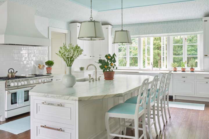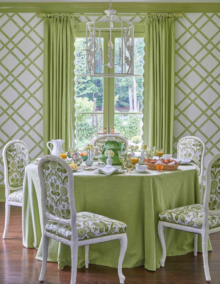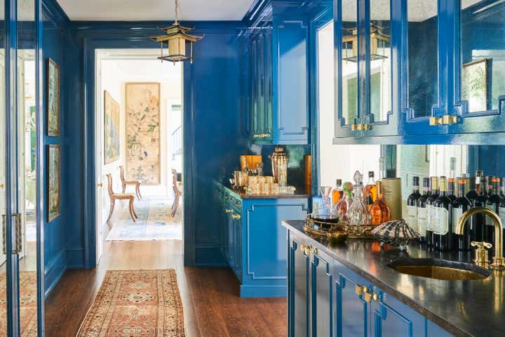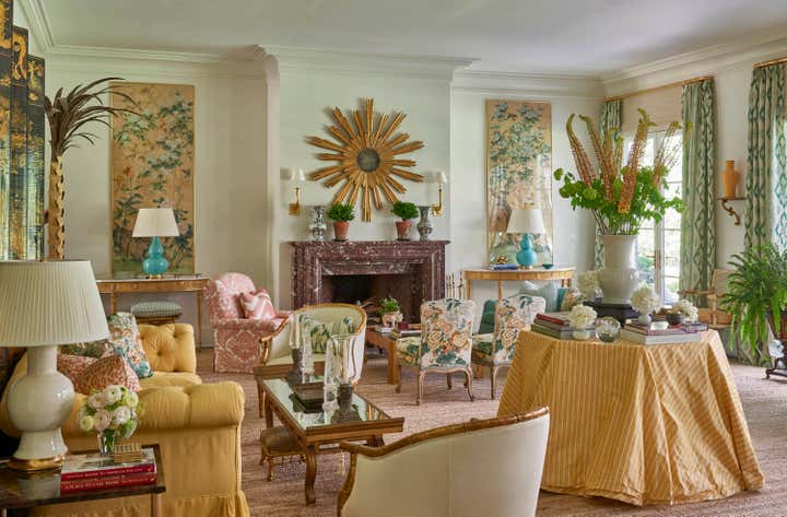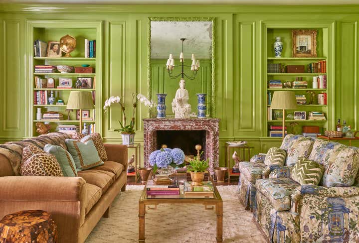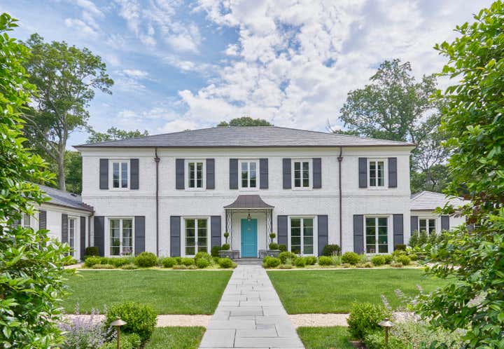 Nestled in a woodland hollow in picturesque Locust Valley, Meg Braff has compiled a lifetime of design fantasies into a home for her family. The gracious proportions and regency details were conceived after those of the 1920s “Gold Coast” and of David Adler. After entering through the duck egg blue front door, gilt antiques make an elegant impression. Beyond, the corridor, in Braff’s “Bleinhem” wall covering, stretches nearly the length of the main level. The living room’s Venetian plaster walls gleam, and serve as a sophisticated backdrop for upholstered pieces in strie solids along with Lee Jofa’s iconic Althea chintz and custom Bernard Thorpe draperies. A large Roger Muhl presides over the room, alongside a monumental 12 foot coromandel screen. Three sets of French doors open onto the dining terrace. The dining room is a Chinoiserie fantasy, crowned by green silk pelmets inspired by The Brighton Pavilion. Green continues in the library, where the original paneling has been given a whimsical lift via a chartreuse gloss. Here, a classic Cowtan Tout print is very much at home amidst ebonized pieces and un-lacquered brass accents. Another Muhl hangs over the sofa; the rug is a bespoke design of hand-knotted lambs wool. The family room is decidedly midcentury, with a Mastercraft table and chairs, twin Karl Springer goatskin cocktail tables, low slung sofas, classic parsons chairs and lucite accents. The peacock blue butler’s pantry doubles as a bar, and connects the family room to the sparkling white kitchen. At the far end of the main floor, the master suite is completed with his and her dressing rooms and baths. The bedroom is sheathed in turquoise and white bamboo paper; a theme echoed in the Serge Roche inspired carved bed and chairs. A three story staircase in light blue lacquer leads upstairs, which is primarily “for the boys.” Four ensuite bedrooms, each with their own study and lounge spaces open onto a shared family room turned video game center.