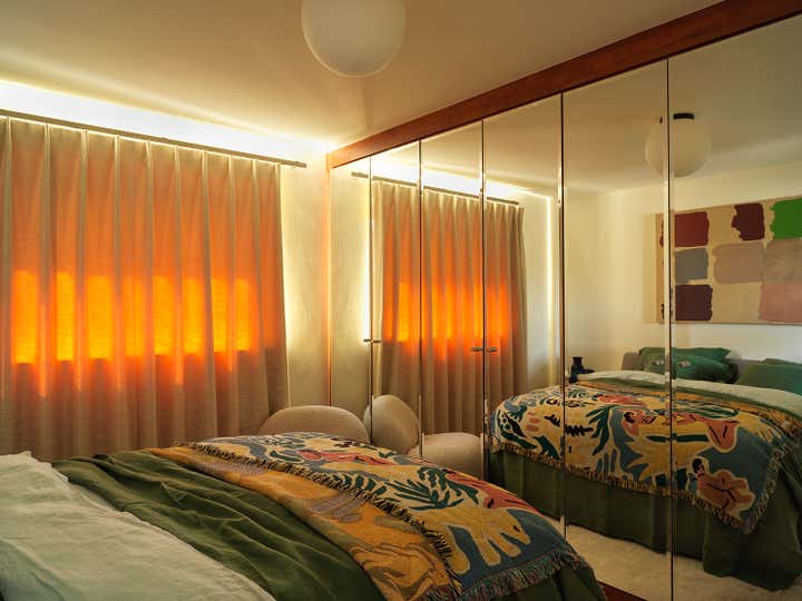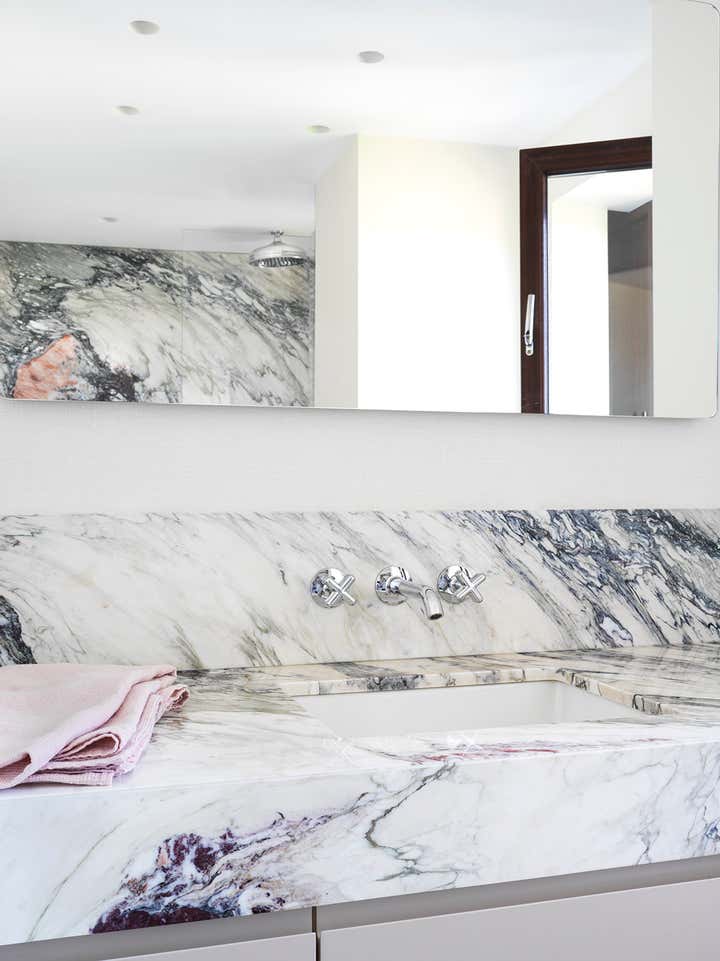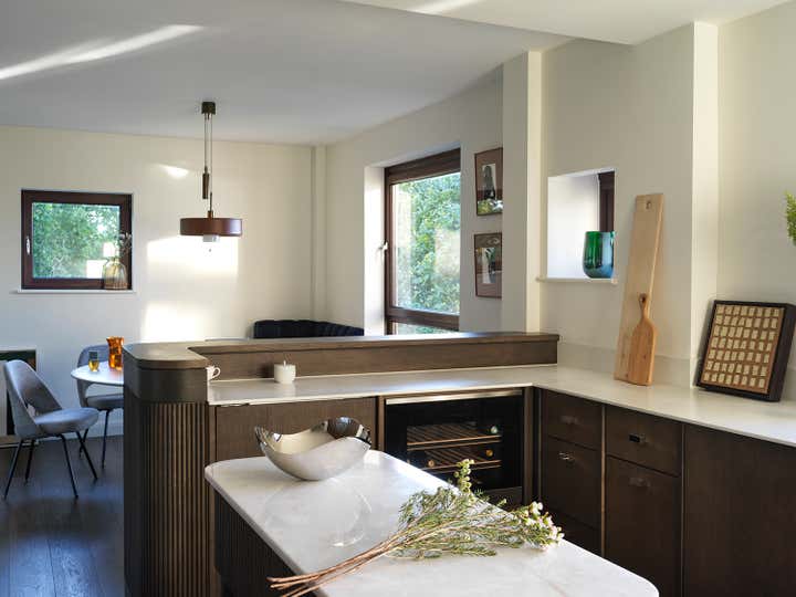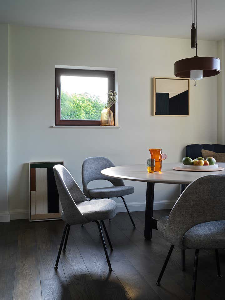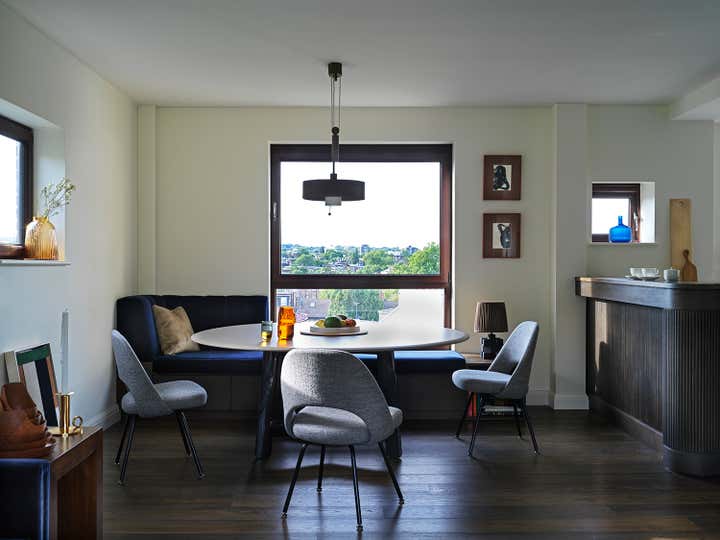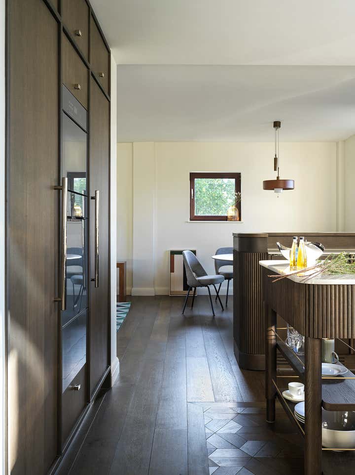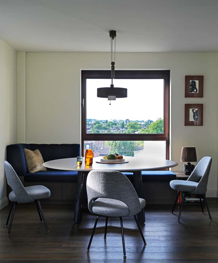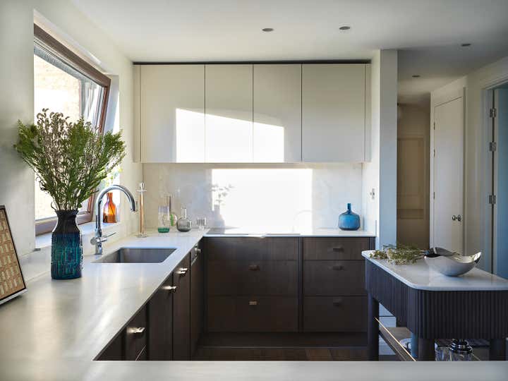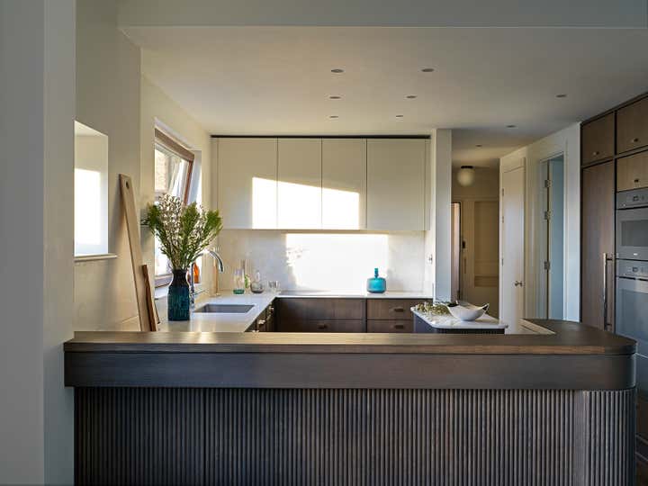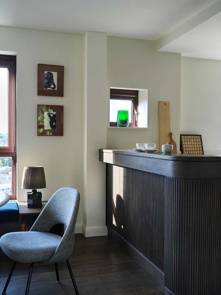This apartment renovation for an American transplant is set in the idyllic London neighborhood of Primrose Hill. With views over Primrose Hill and the Regent’s Park, this postwar building contrasts the neighborhood’s typical victorian and narrow row homes in it’s scale and concrete construction. The owner was drawn to the patterns, warmth, and textures of classic English clubs and tasked us to create our interpretation more suitable to the modern building. Our restrained approach creates a home that is inspired by the city’s past but rooted in today. Heavy materials, such as the naturally patterned marble bathroom, carpeted bedrooms and the dark oak kitchen and flooring are paired with minimal detailing to create a warmth that will evolve and grow with the space.