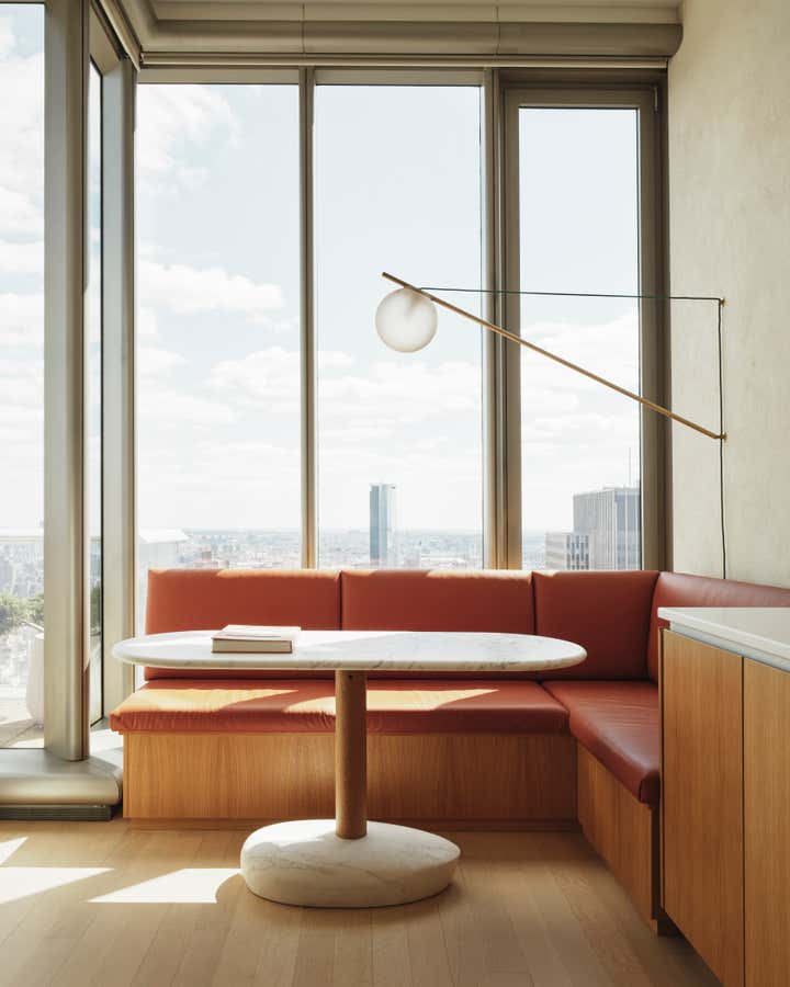 A deliberate choice of calming color palettes and materials coupled with low-scale furniture, preserves the uninterrupted skyline views, creating an emotive and immersive experience for residents. The tailored design, exemplified by Studio Zung’s bespoke European oak banquette and custom walnut bookshelf underscores Studio Zung’s commitment to coherence and energy throughout the space.