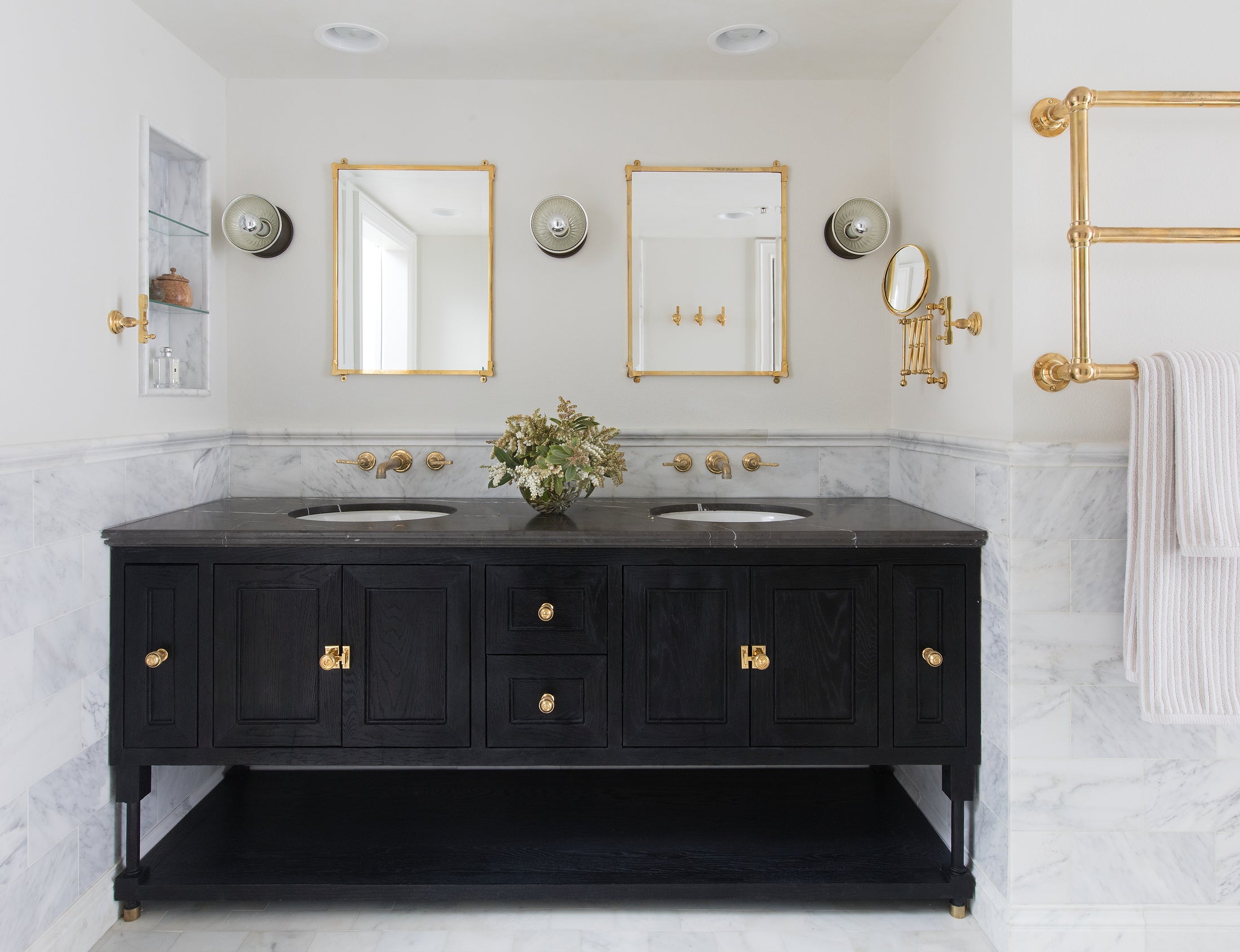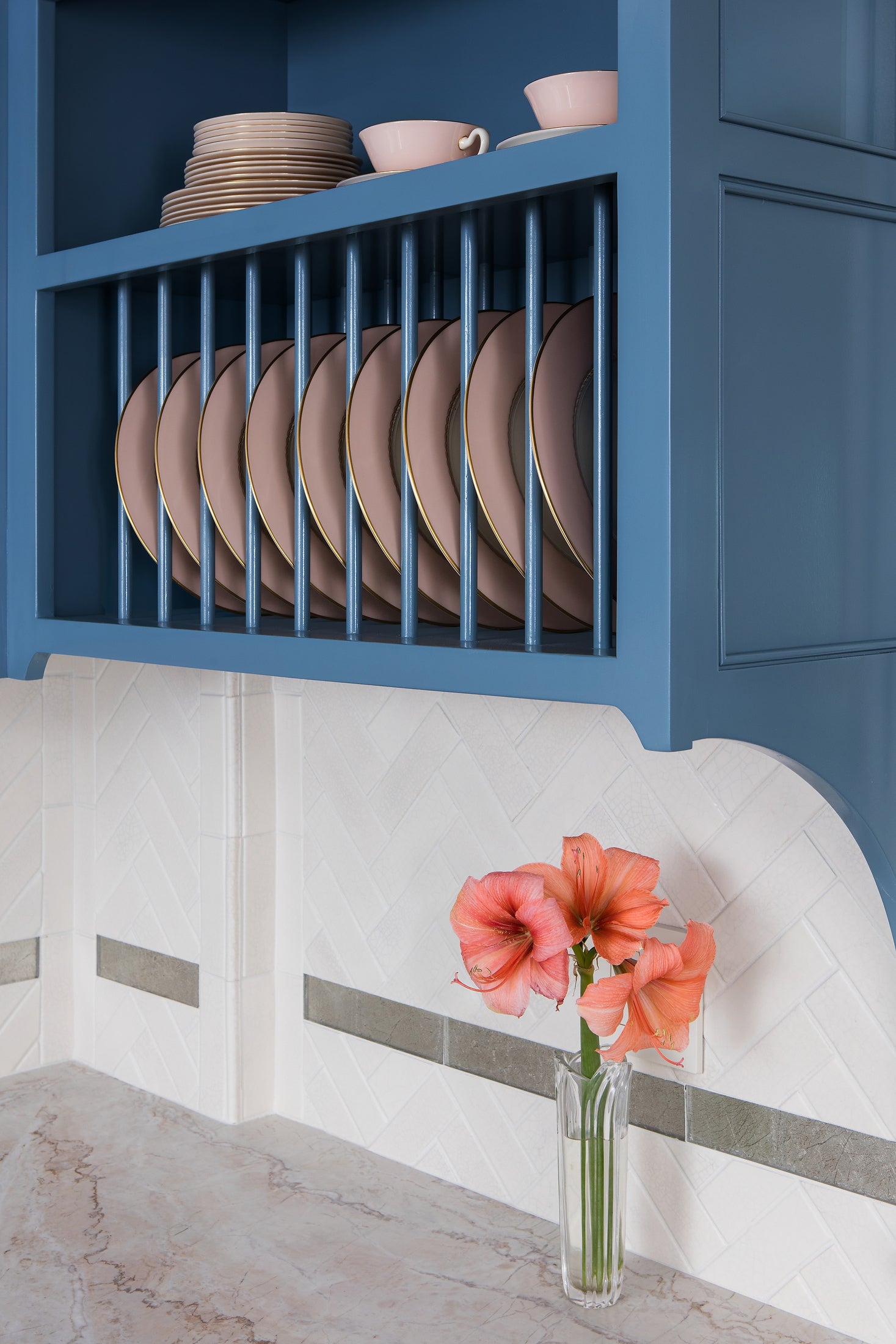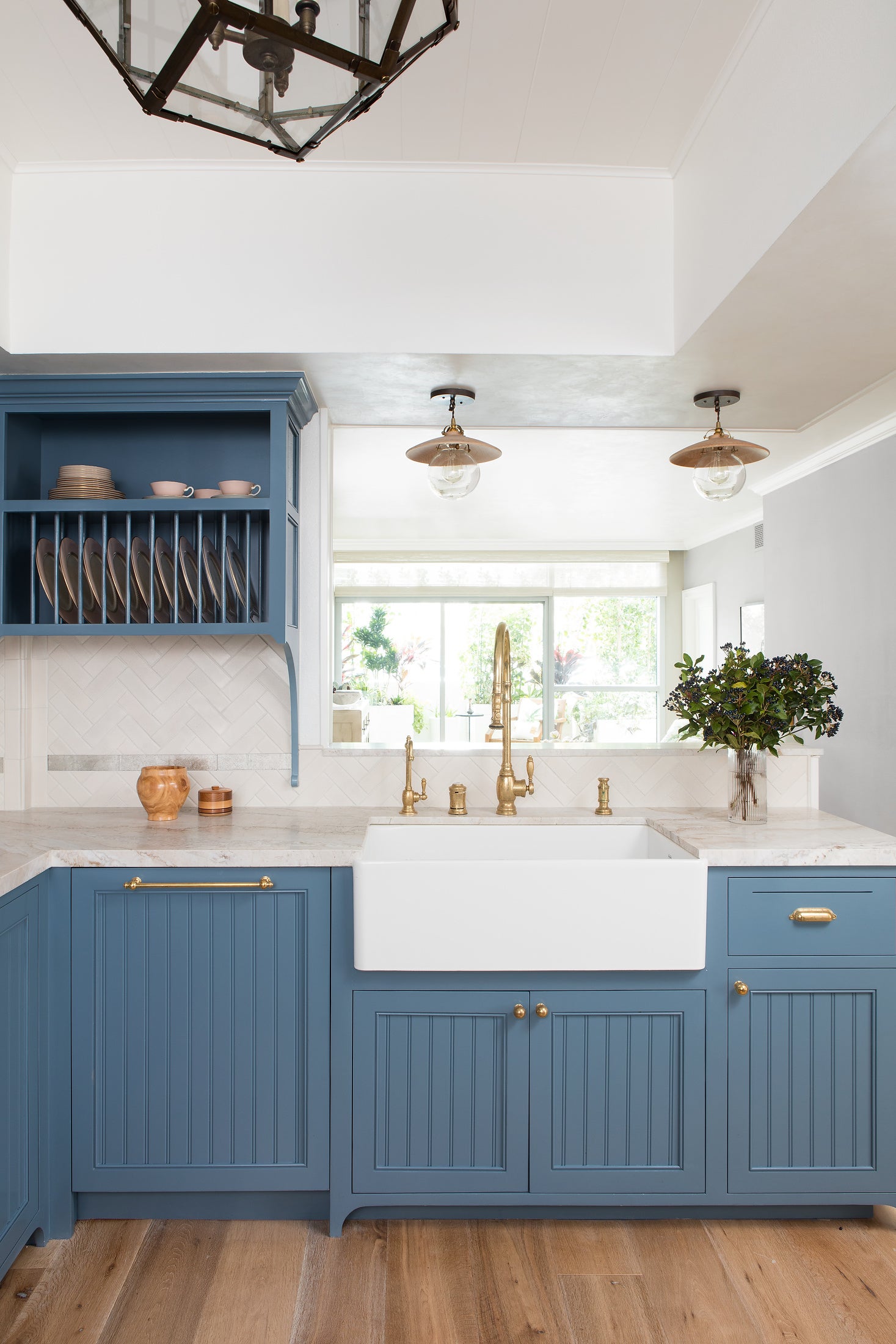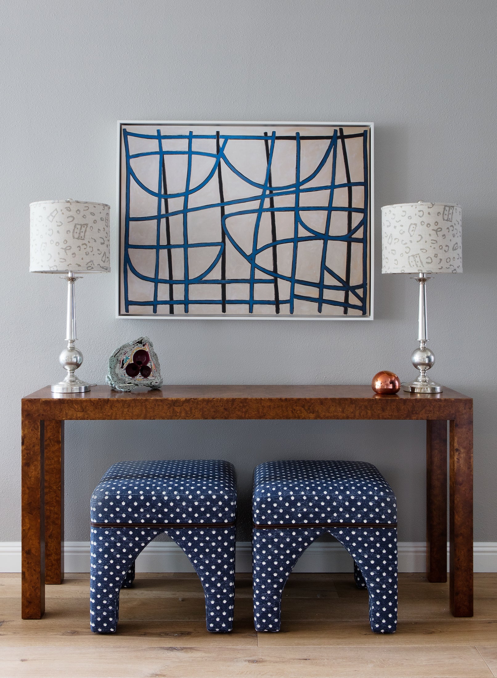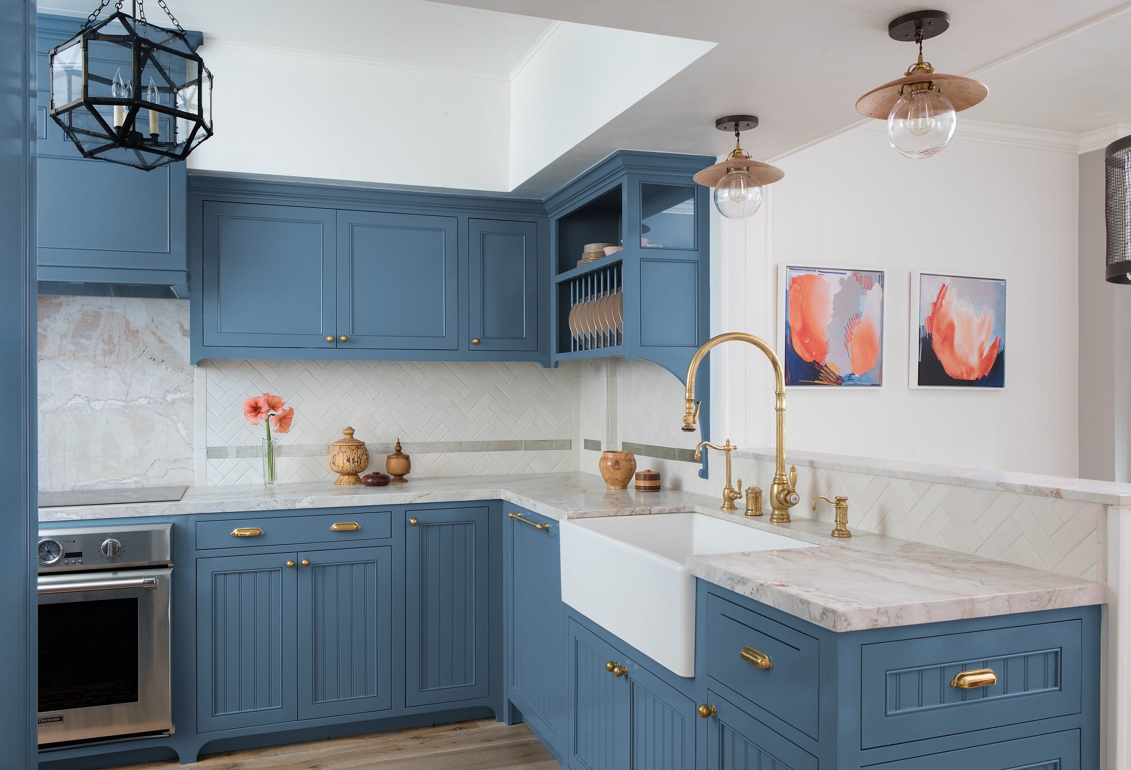 The client’s love of blue brass set the foundation for many of the design decisions. The soothing blue backdrop dovetailed nicely with the desire for a traditional coastal aesthetic—but one with a slightly contemporary edge. Vintage Italian furnishings pair with beadboard cabinetry, traditional millwork, wide plank white oak floors, honed marble, abstract art and subtle nods to nautical moments
