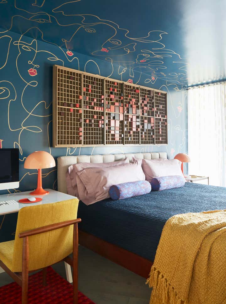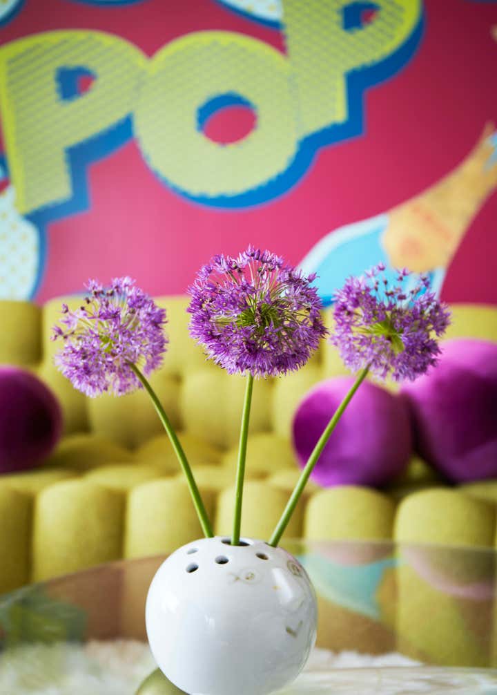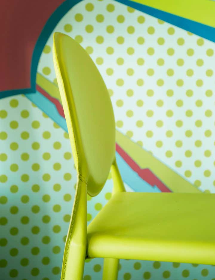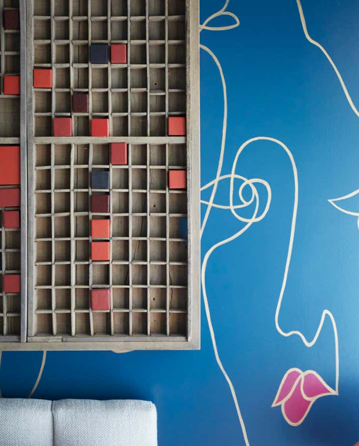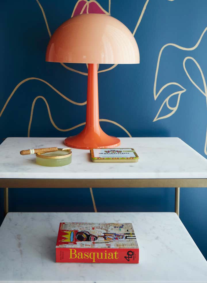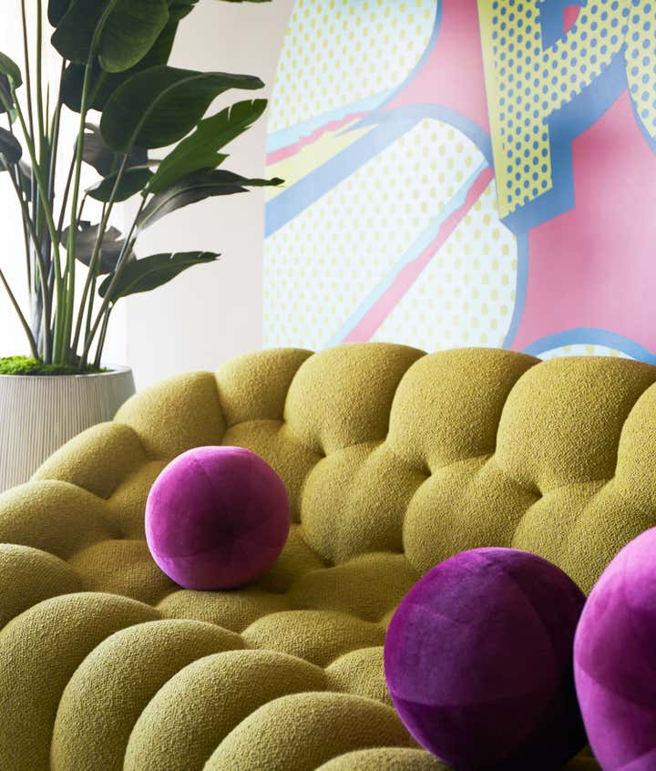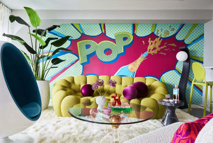 We sourced as many authentic 1960/1970 pieces as we could. The focal wall had to be real special — big, bright with an attitude (more Roy Lichtenstein than Any Warhol!) featuring our wild color palette and my Client’s favorite champagne. Ultimately, we worked with a local studio who created three total custom murals.