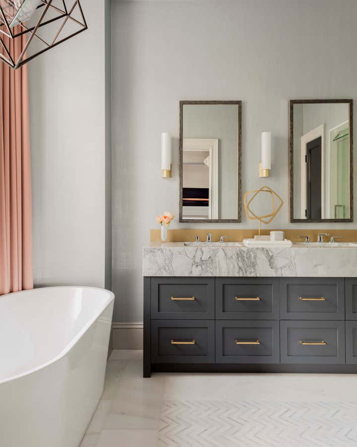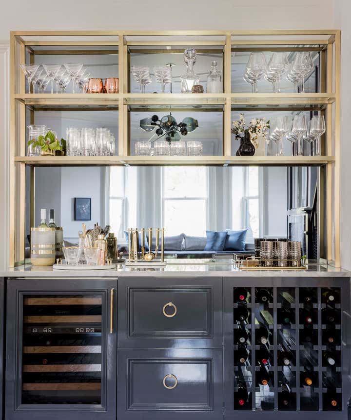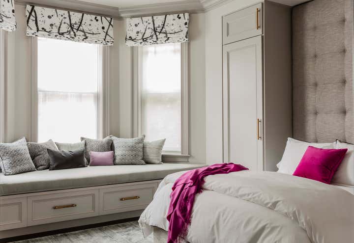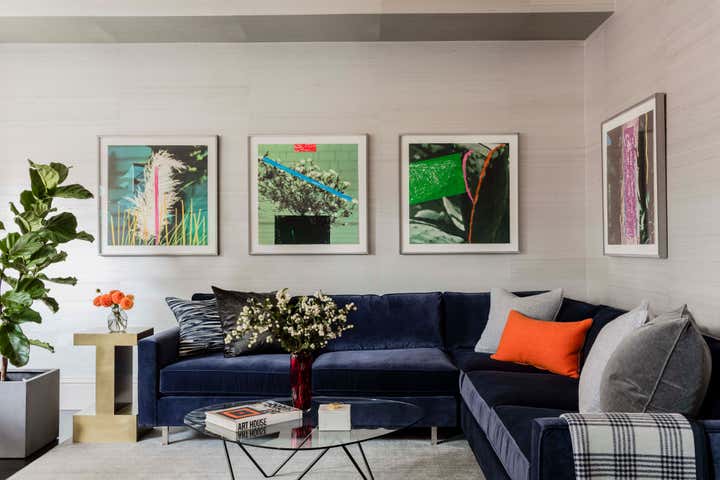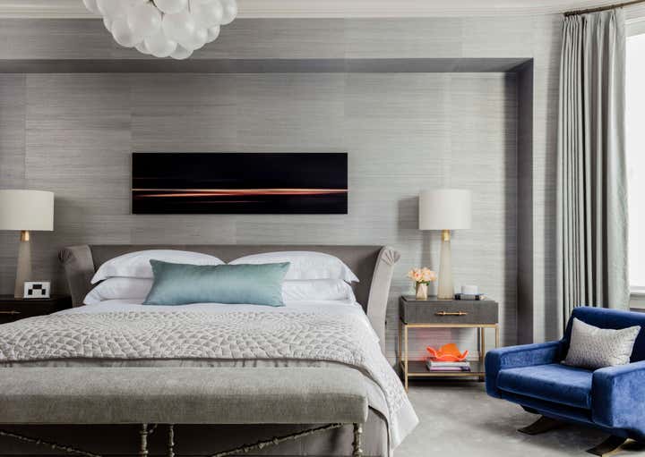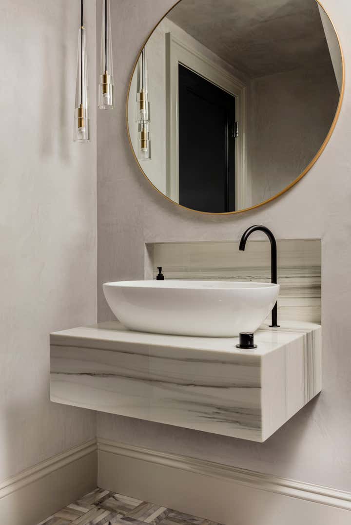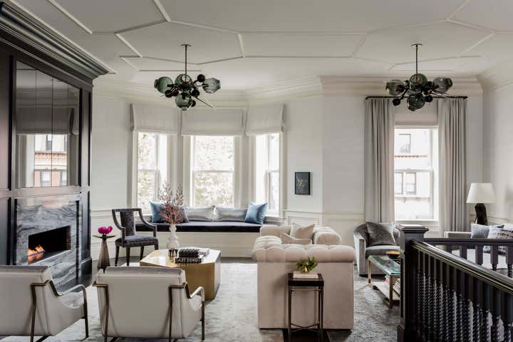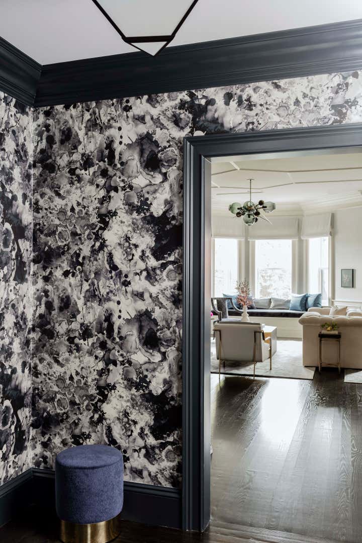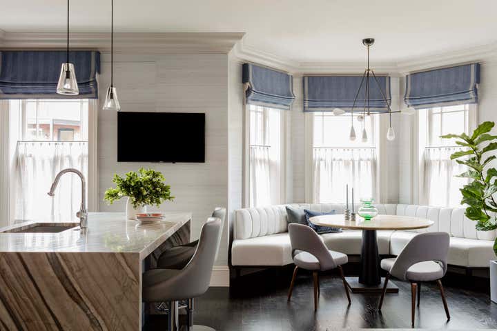 This Back Bay penthouse pied-à-terre was transformed into a timeless yet fanciful retreat on Marlborough Street. Within a developer-renovated brownstone, Elms layered traditional and contemporary elements to create warmth, character, and longevity. A black-painted staircase anchors the home, setting the tone for a cohesive palette of grays, creams, and silvers accented by brass and subtle pops of color. Custom seating, decorative ceiling molding, and sculptural light fixtures bring intimacy and drama to the open living spaces. Throughout the home, high visual texture, refined architectural details, and thoughtful moments—like the marble waterfall island and cantilevered powder room sink—elevate everyday living into something quietly profound.