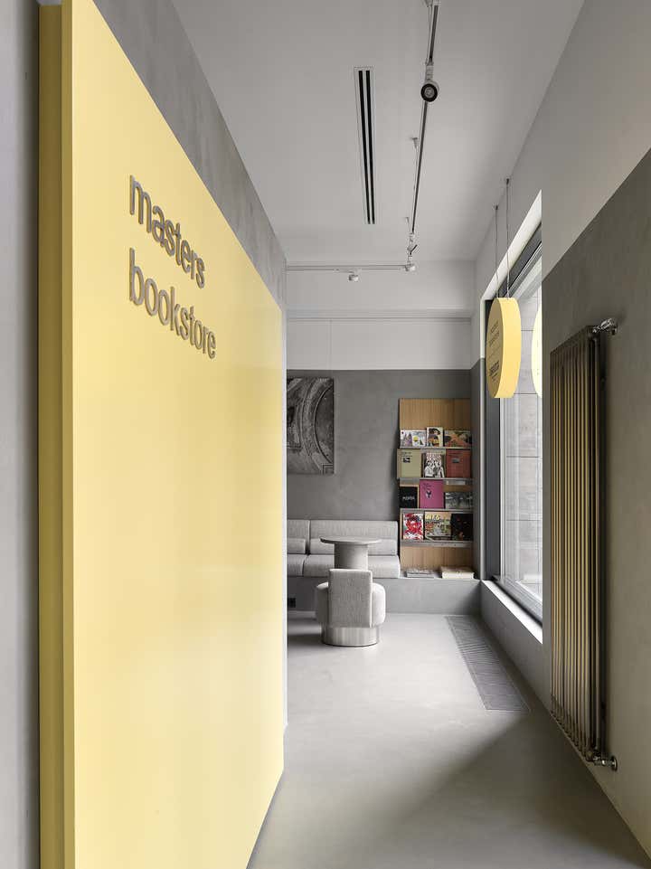 The layout was developed in such a way that the visitor experience can be the most complete, and they could consistently view all the products. At the entrance, visitors are greeted by a large yellow installation. The colour scheme (a combination of branded vanilla yellow and French gryy) was specifically chosen by the founder of Masters herself, but the design task was to find the perfect balance to make the interior of a small bookstore relevant and not overloaded with unnecessary details. Simple, brutal and tasteful, as we say.