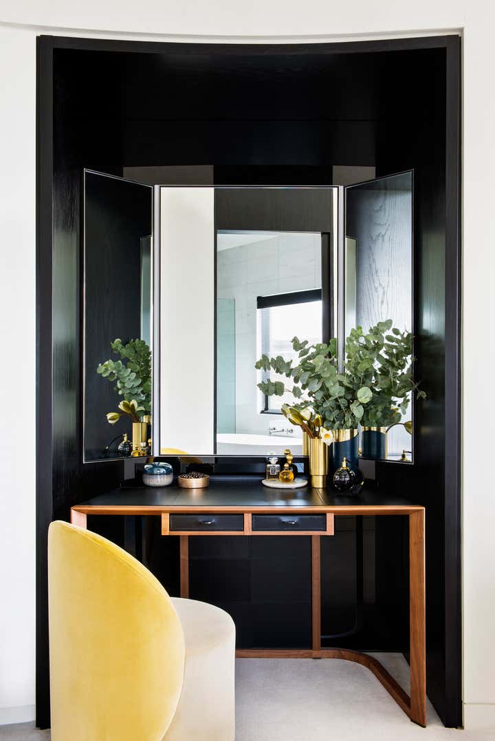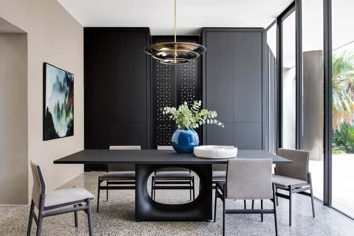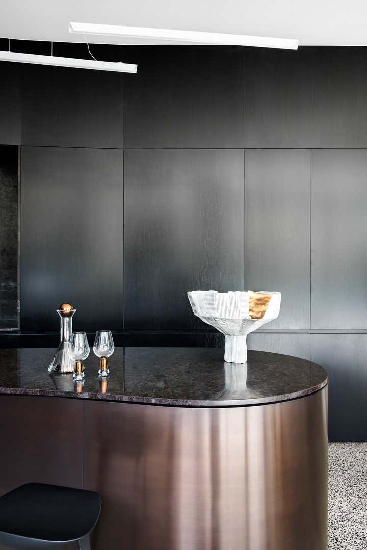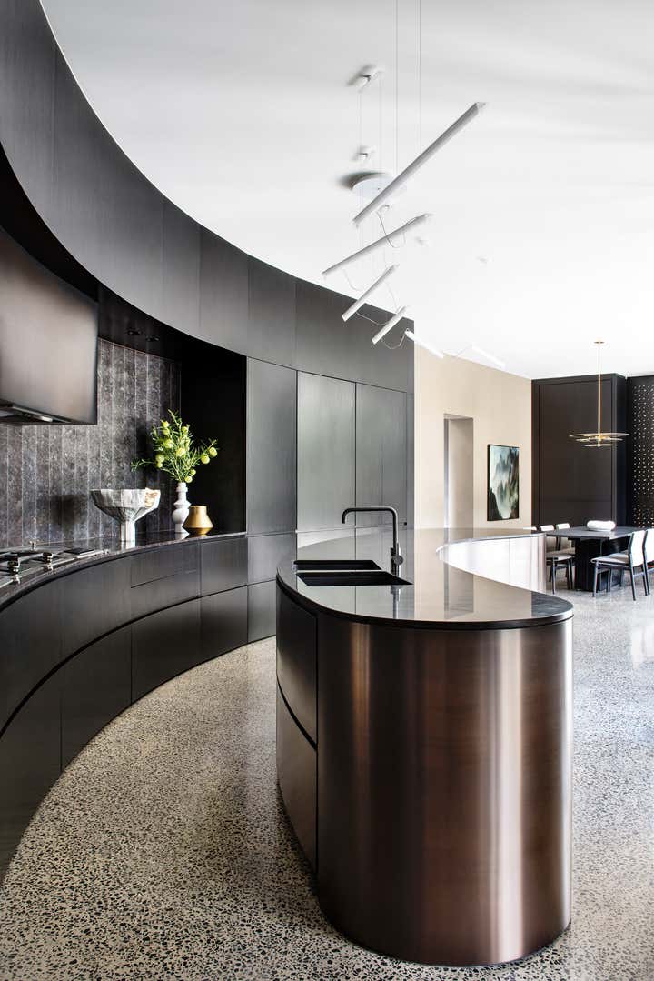 Highly contemporary, masculine and materially opulent, the design for this Allan Powell designed residence follows architectural curves to deliver surprising drama and a sense of theatre. From cellar to kitchen and bathrooms, a material palette of stone, timber and semi-precious metal delivers a bespoke interior of sublime luxury.