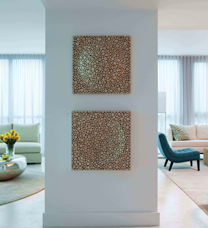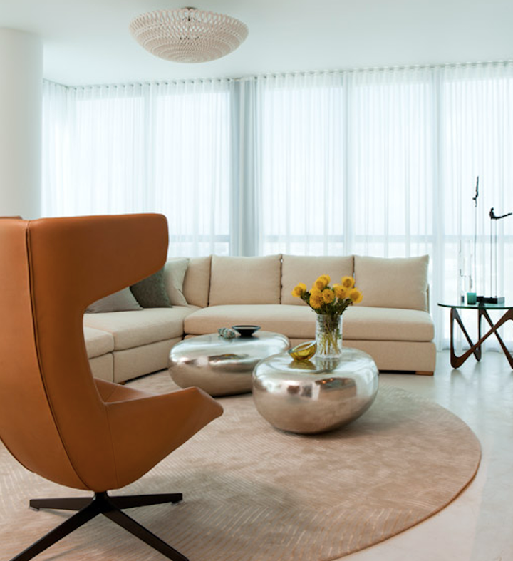 With the intention of evoking the feeling of the beach, this apartment on Miami Beach features wonderful open spaces that capture the colors of the sand and sea – seen from the full height windows throughout. This “ready to wear” environment was created by using luxurious yet casual textures and materials – always with a mind towards function and durability. The sensuous lines of the contemporary furnishings are the perfect counterpart to the crisp shell of white walls, polished concrete flooring, and floor to ceiling glass. Organic materials – weathered teak, drift wood, capiz shell, and cork – were used as accents in the millwork, lighting, and accessories – all contributing to the more relaxed lifestyle of this home.