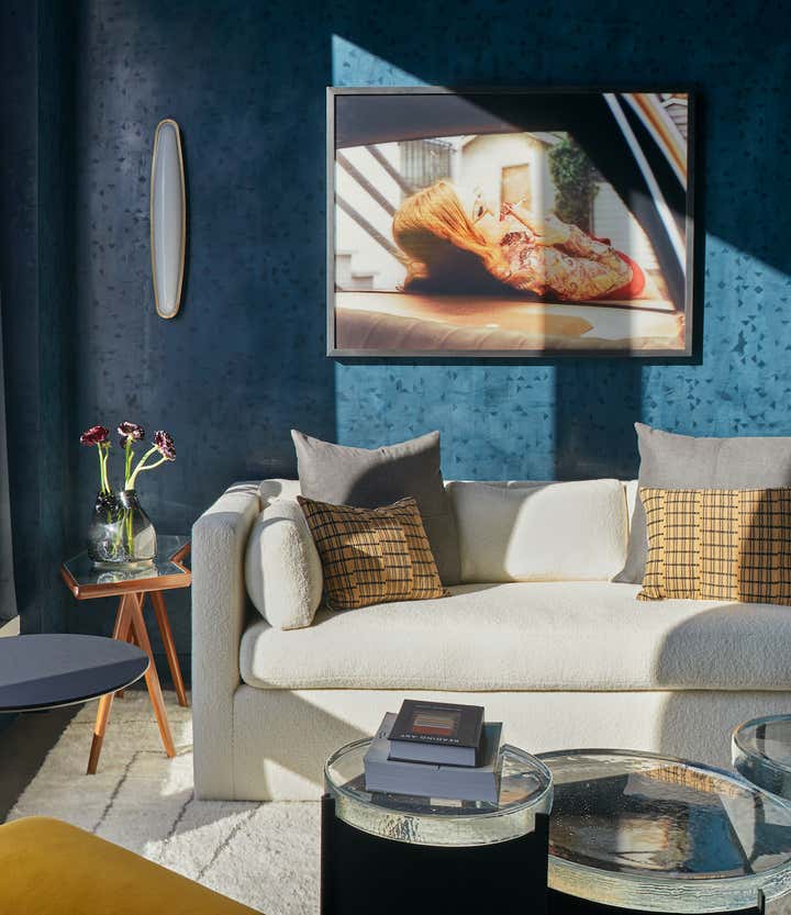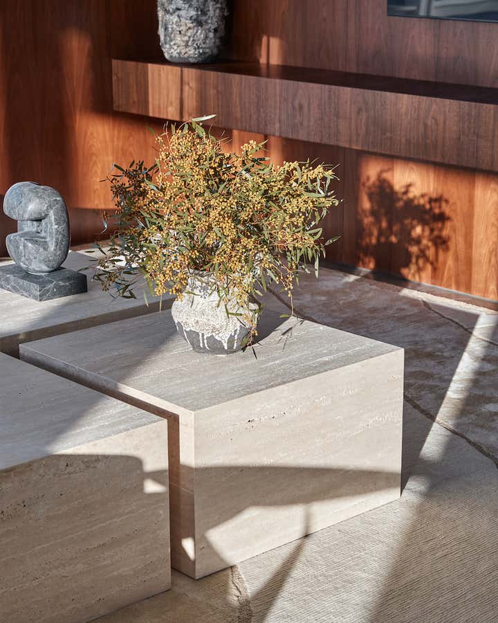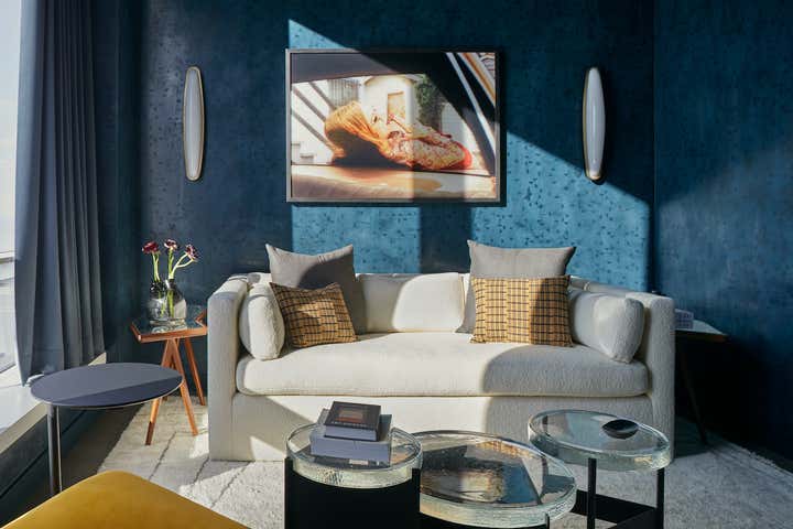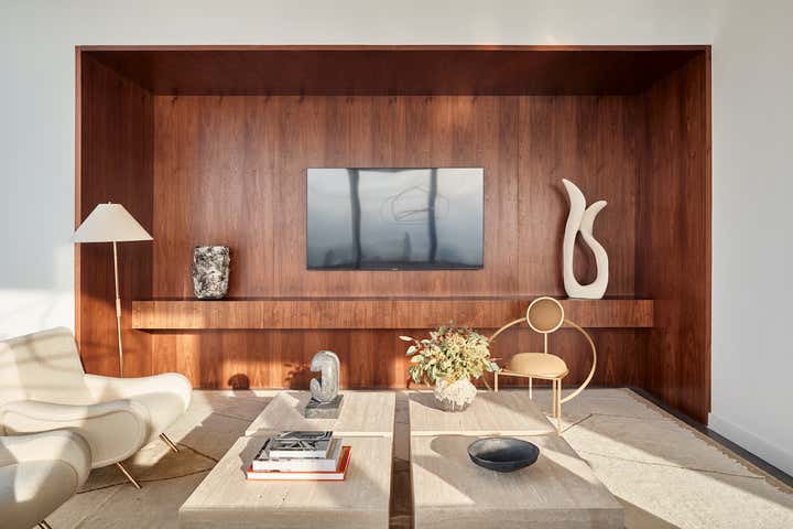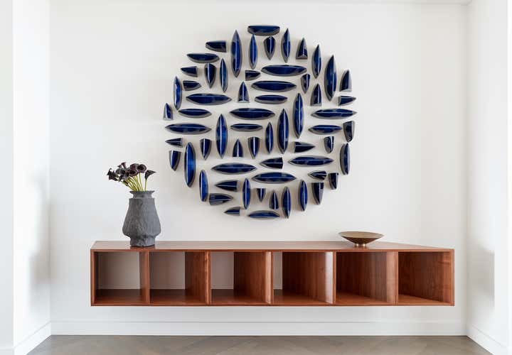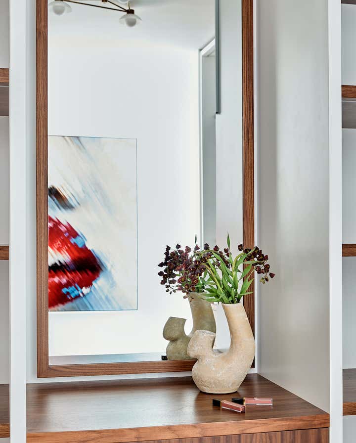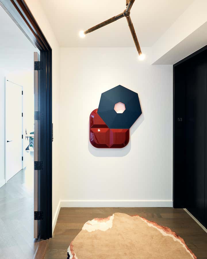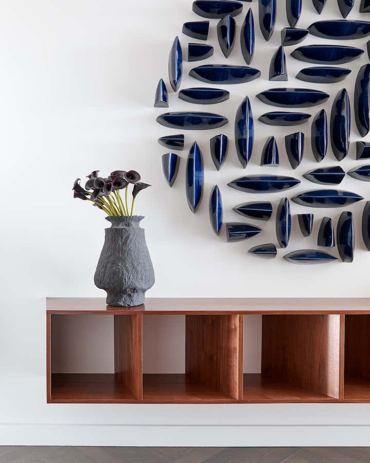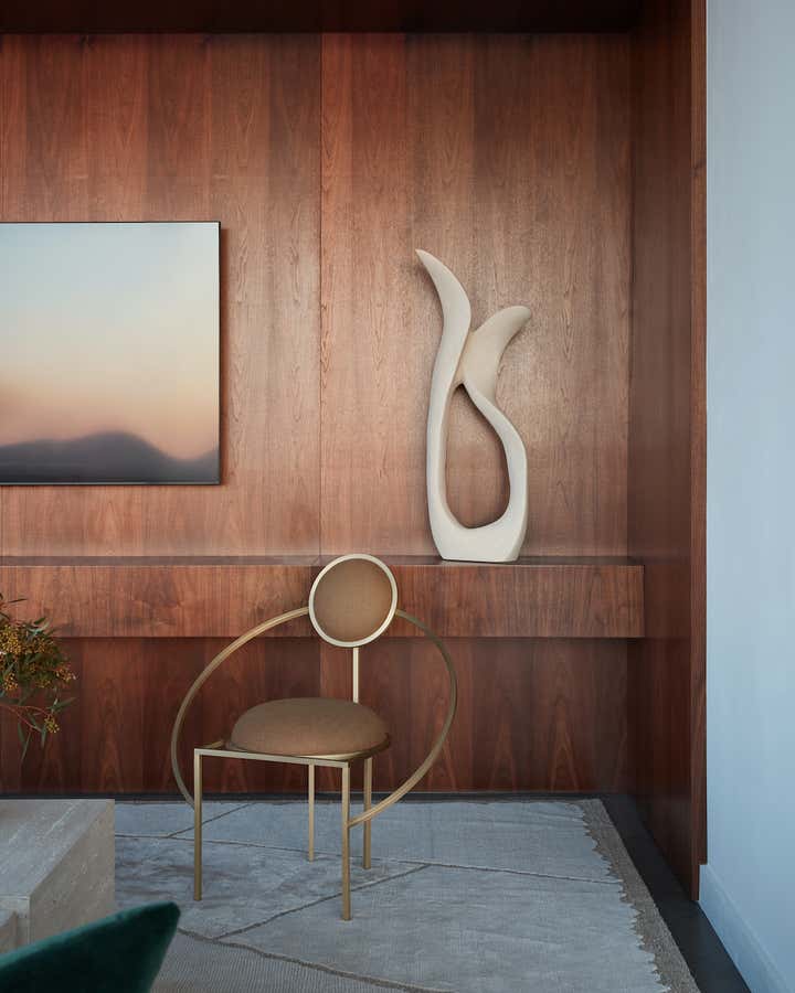 Pulling from inspiration the client shared, Jessica developed a palette of jewel tone color, black iron and brass, travertine, and walnut, with accents of Mid-Century Italian and French design, combined with Contemporary Art and ceramics. In the apartment are references to the work of iconic designers Gio Ponti, Marco Zanuso, Ico Parisi, Jean Prouvé , Pierre Chareau and nods to artists Donald Judd Alexander Calder.