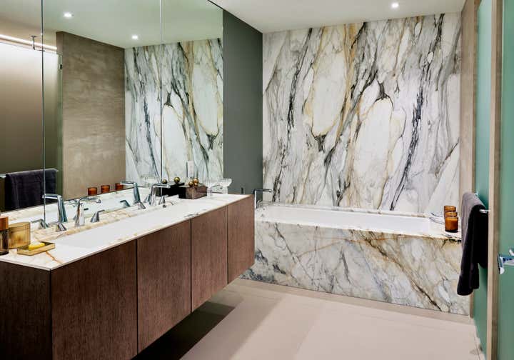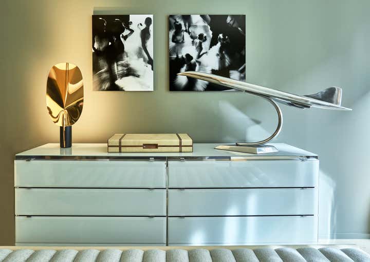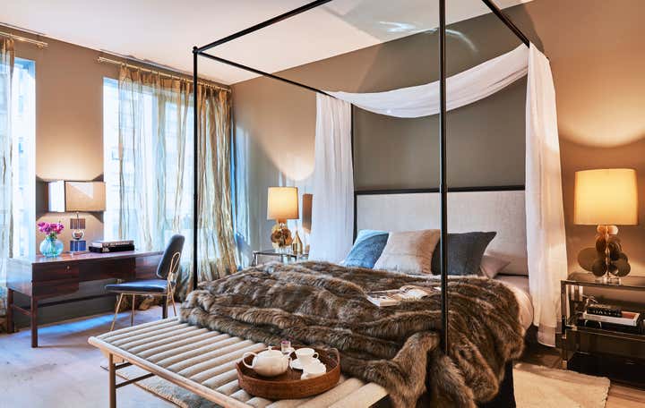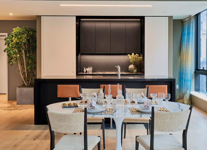 InSpace NY designed Manhattan apartment starts with the Master Bedroom creating an ambience both cozy and moody. The window drapery comes from Holly Hunt s Mokum metallic sheer. The center piece of the suite is an RH Modern French iron canopy bed which echoes the style of its 19th-century predecessors with a linear silhouette, slender posts and unadorned headboard. Sheer Belgian linen bed swags drape loosely from the canopy to soften the bed structure and add drama. The Align Daybed by Anita Johansen, in Natural Oak can be found resting against the bed forming a contrast of color and texture. The Daybed is, at one and the same time, highly sophisticated and uncomplicated embracing typical Nordic aesthetic. Danish design influences comes from a stunning Mid-Century era vintage desk; making a solid statement in this unique and sophisticated design comprised of rich rosewood. Paired with the sculptural Maxime velvet and brass dining chair by Jonathan Adler compliments the desk; It s crisscross brass frame cradles a softly curved seat. This ostensibly peculiar combination of forms perfect the work space while exuding elegance. Accessories in the room have been carefully selected to compliment the aesthetic adding a thoughtful but yet sophisticated layer to the narrative of the metropolitan couple who rest here. Aged brass ribbed bath accessories provide the perfect accent to the bathroom, highlighting the striking patterns in the veining that run through the large slabs of marble. The elegant kitchen is a resolute study in high drama, with black polished quartz counter tops, acid-etched, back-painted glass cabinetry with custom millwork interiors offset against light wood floors and soft grey walls.