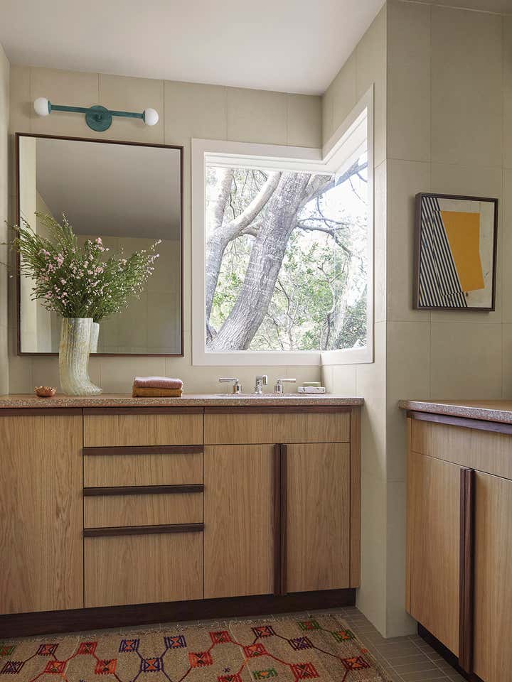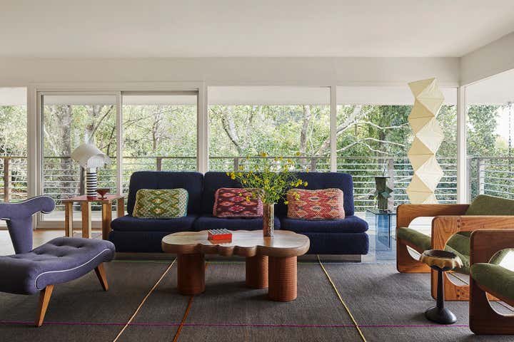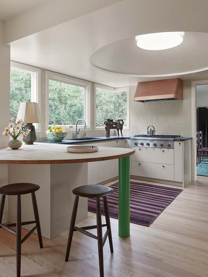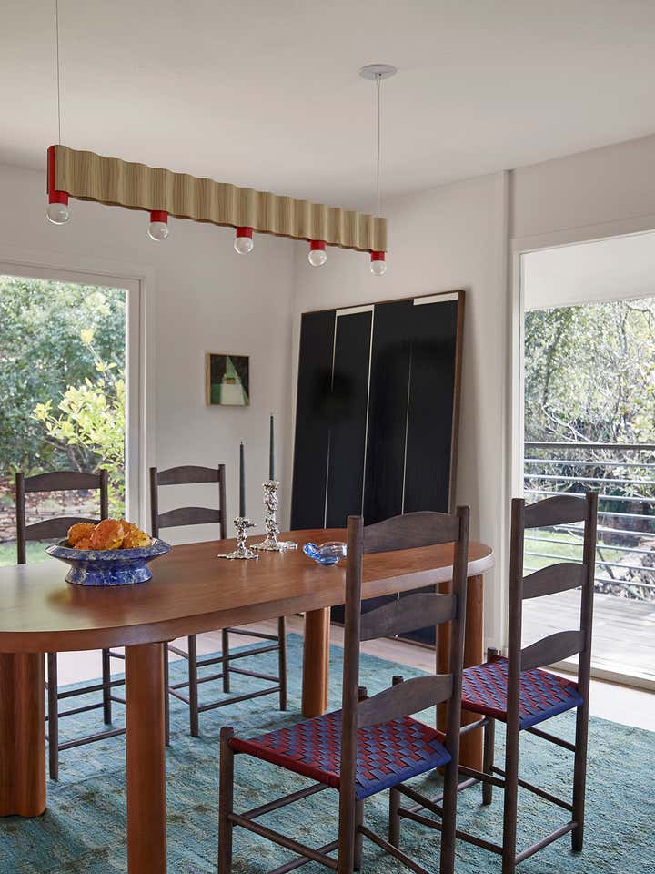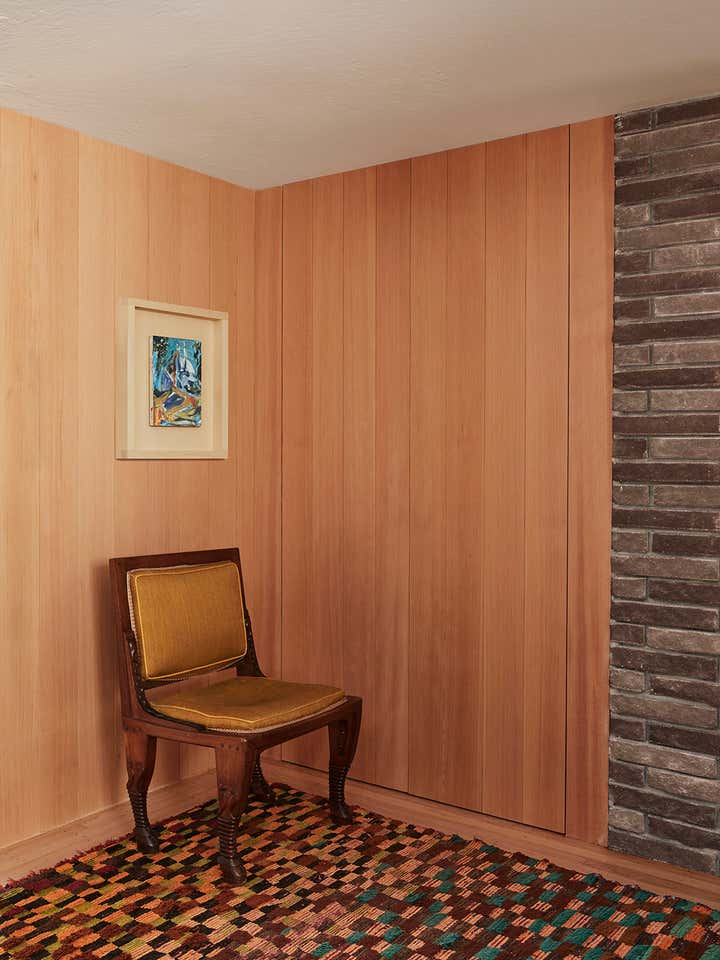 With Mill Valley’s redwood trees and greenery prominent in the backdrop, the studio created a playful and bold design for the interiors that were inspired by modernist masters such as Corbusier and Judd, using color to define spaces and pairing them with humble materials. Wood-cladded walls and quirky unexpected details were inspired by some of the homes in Sea Ranch, a historic modernist community a couple of hours north, known for its cedar-lined homes and artistic character. There is a mix of high and low design elements, pieces crafted by local artists in the Bay Area and in LA and an eclectic mix of furnishings to give the home a collected feel and to illustrate one of the studio’s principles: “balance of opposites.”