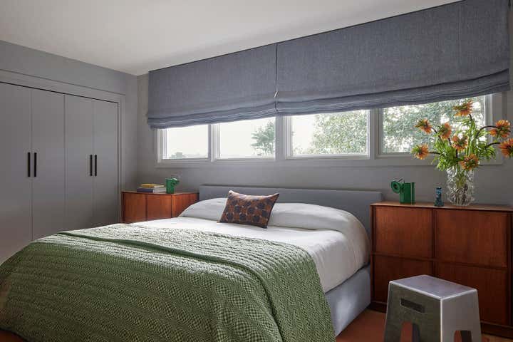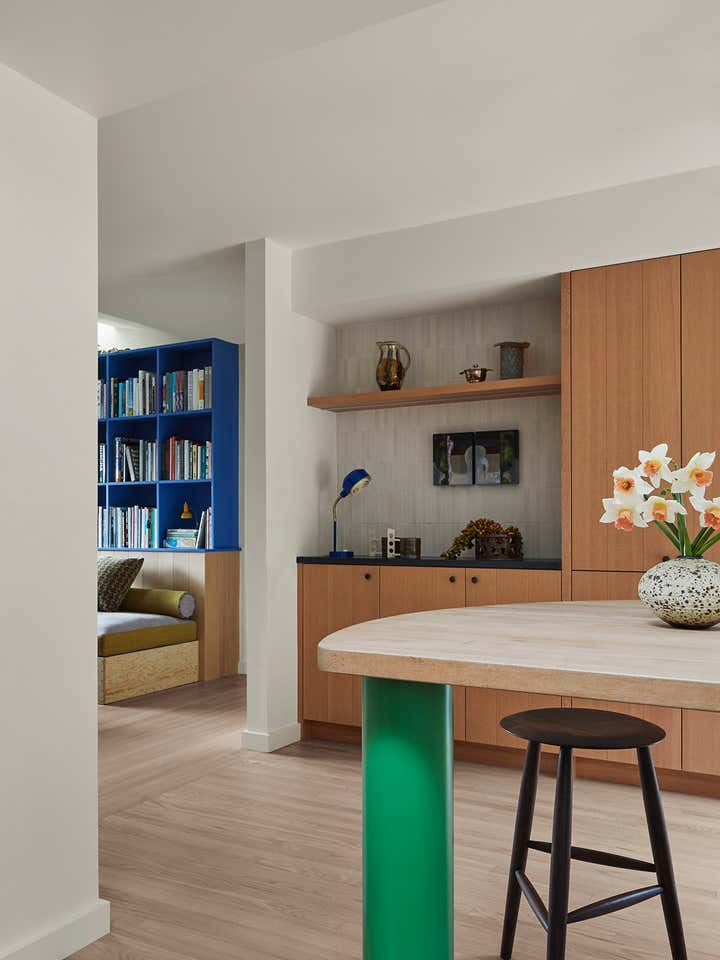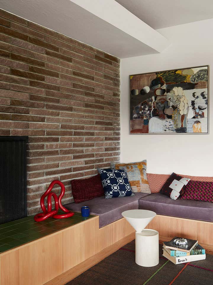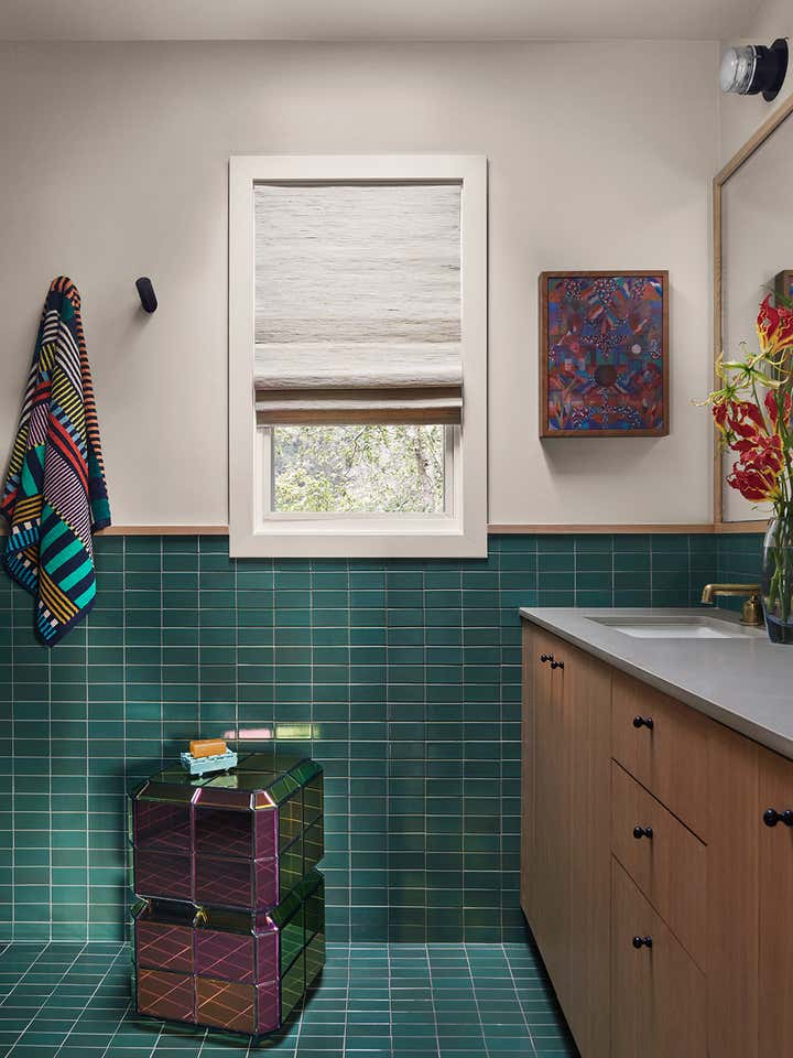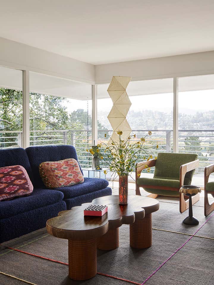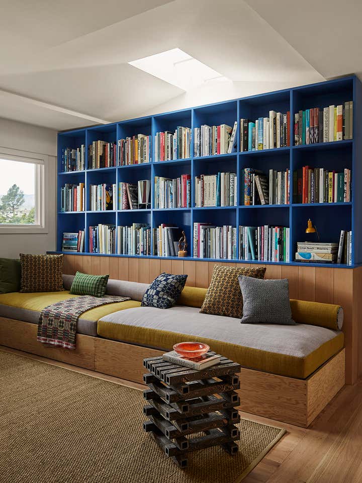 With Mill Valley’s redwood trees and greenery prominent in the backdrop, the studio created a playful and bold design for the interiors that were inspired by modernist masters such as Corbusier and Judd, using color to define spaces and pairing them with humble materials. Wood-cladded walls and quirky unexpected details were inspired by some of the homes in Sea Ranch, a historic modernist community a couple of hours north, known for its cedar-lined homes and artistic character. There is a mix of high and low design elements, pieces crafted by local artists in the Bay Area and in LA and an eclectic mix of furnishings to give the home a collected feel and to illustrate one of the studio’s principles: “balance of opposites.”