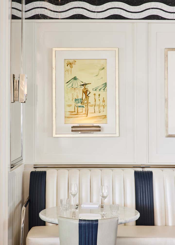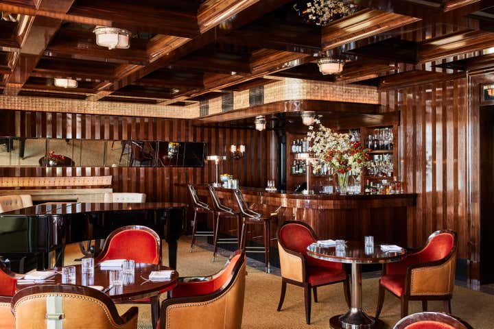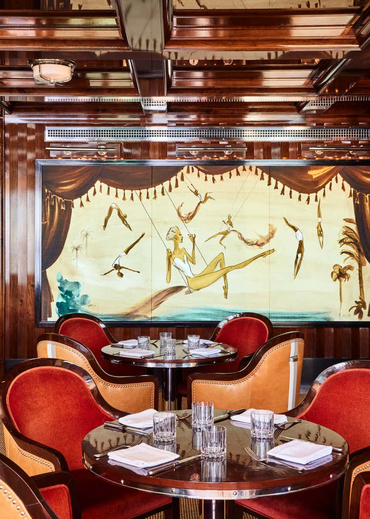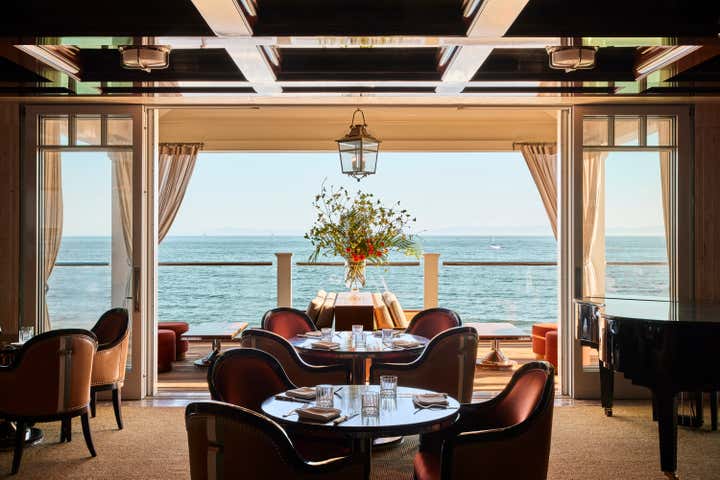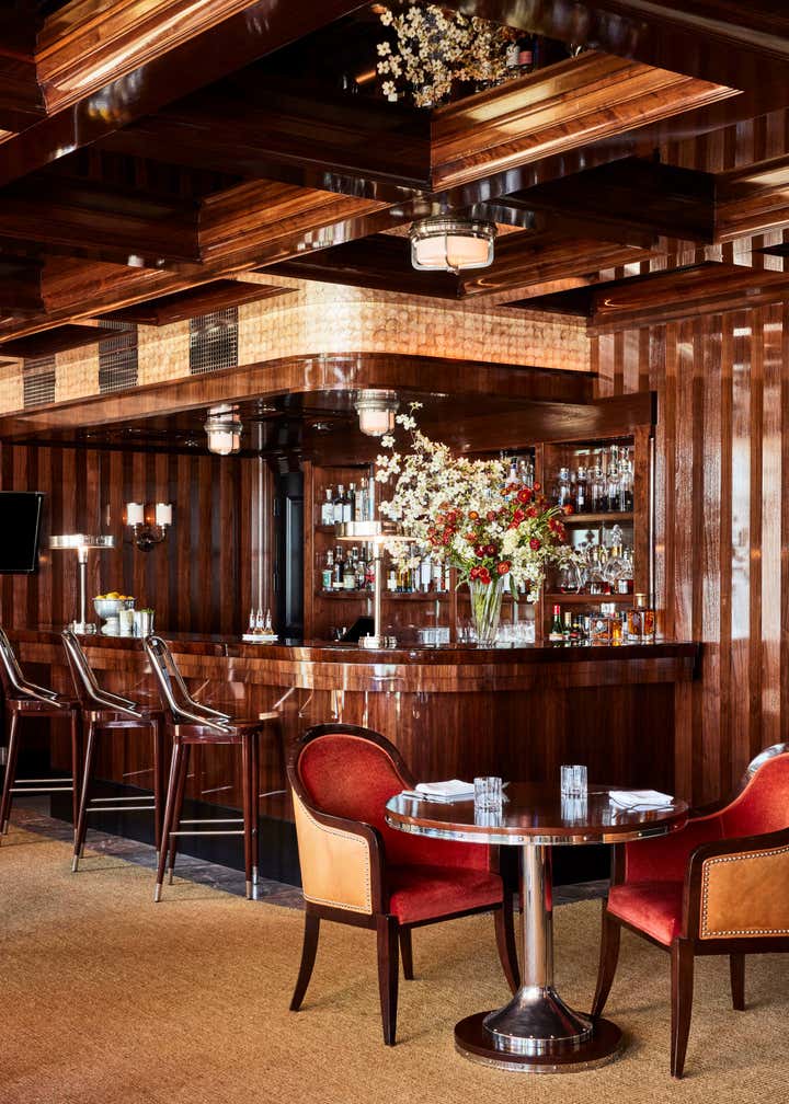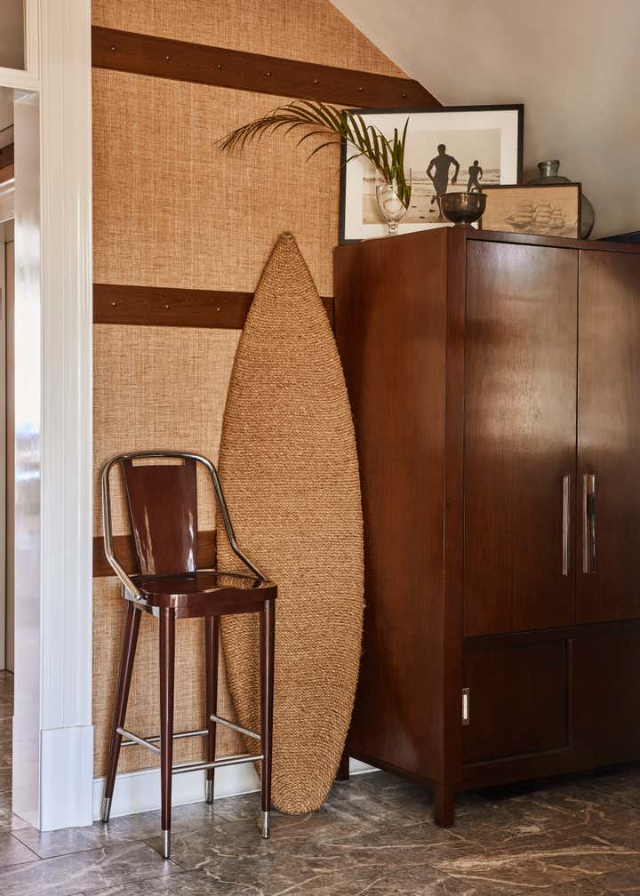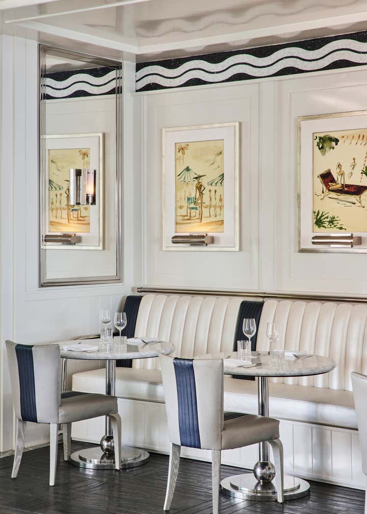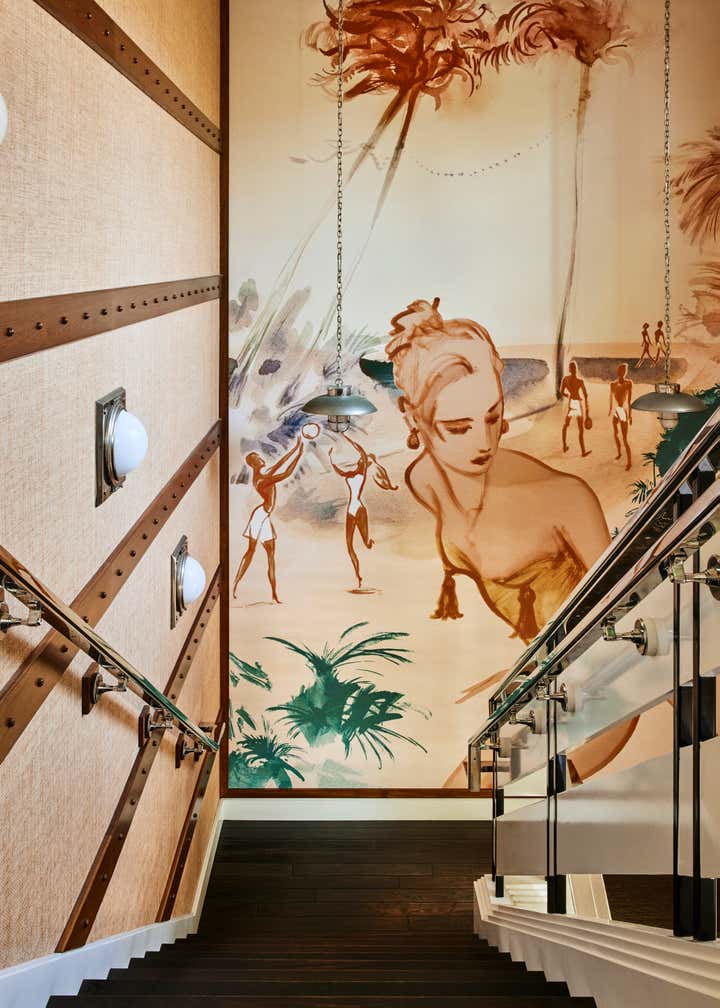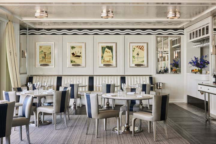 A private clubhouse on the grounds of a Montecito hotel recalls the sun-soaked romance of travel at sea in the 1930s. A beachfront, daytime level captures the high-style details of a majestic oceanliner. An evening level above emulates the sultry and glamorous tradition of clubs and speakeasies of the great hotels of the time. Deco wave patterns in gleaming mosaic, sparkling mirror and metalwork, tailored leatherwork, highly varnished, yachtlike millwork. Murals of Jazz Age characters watch over and toast the festivities.