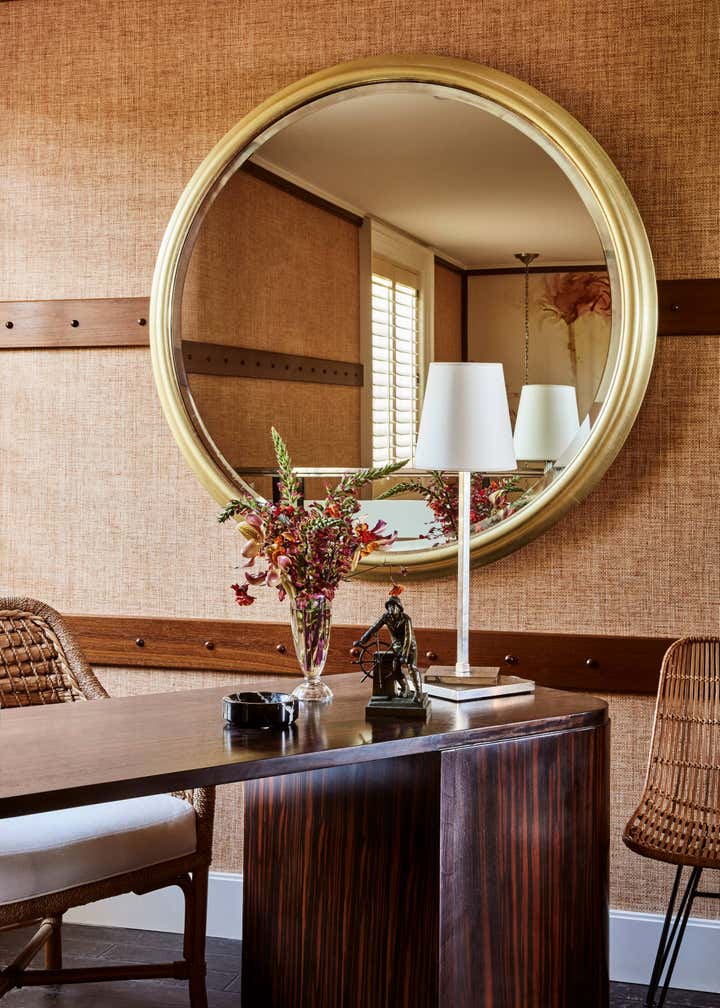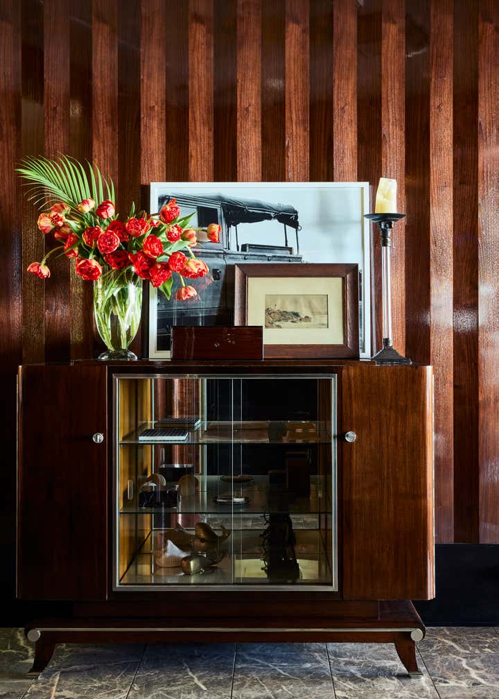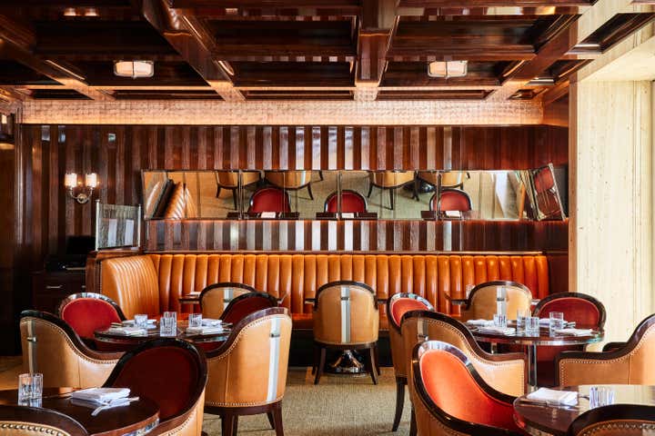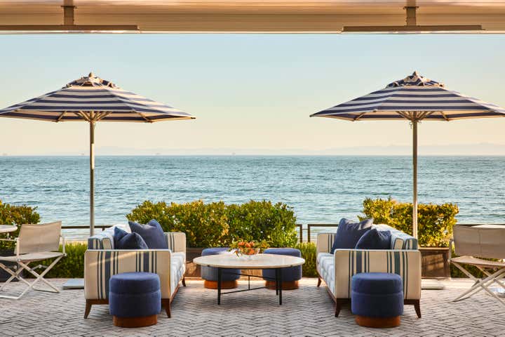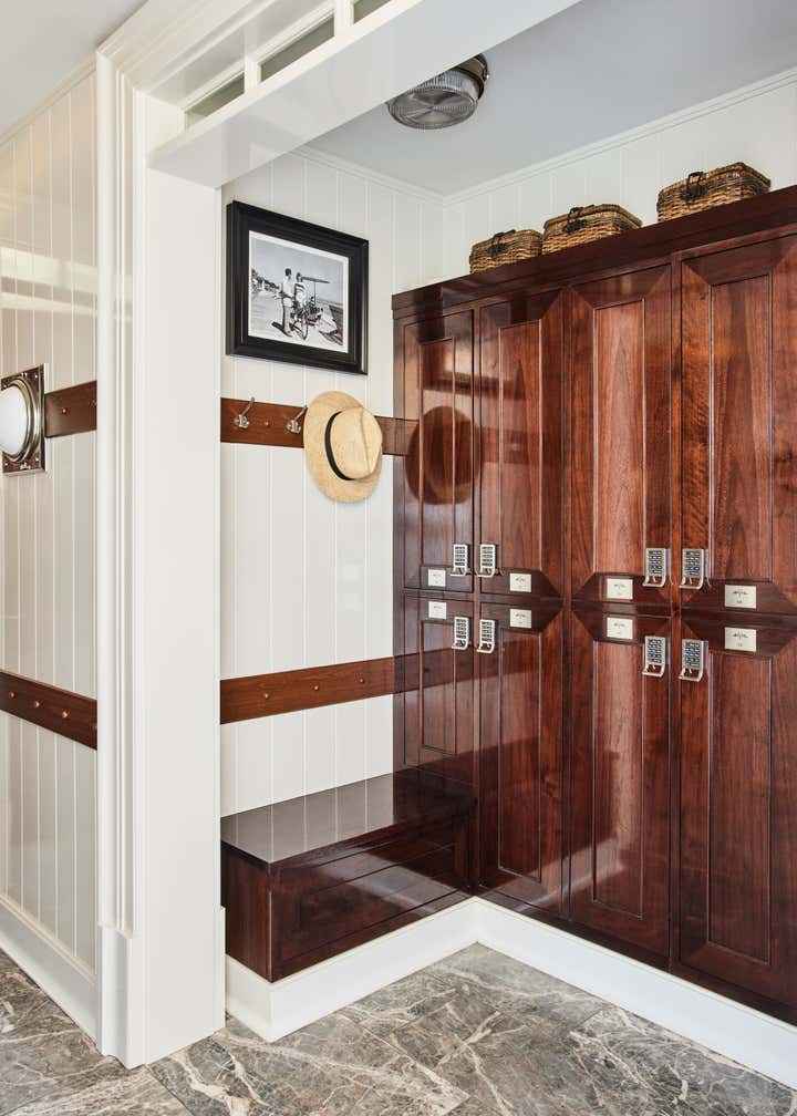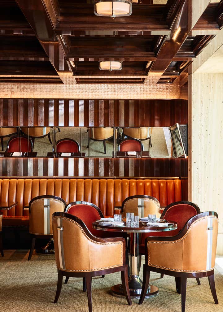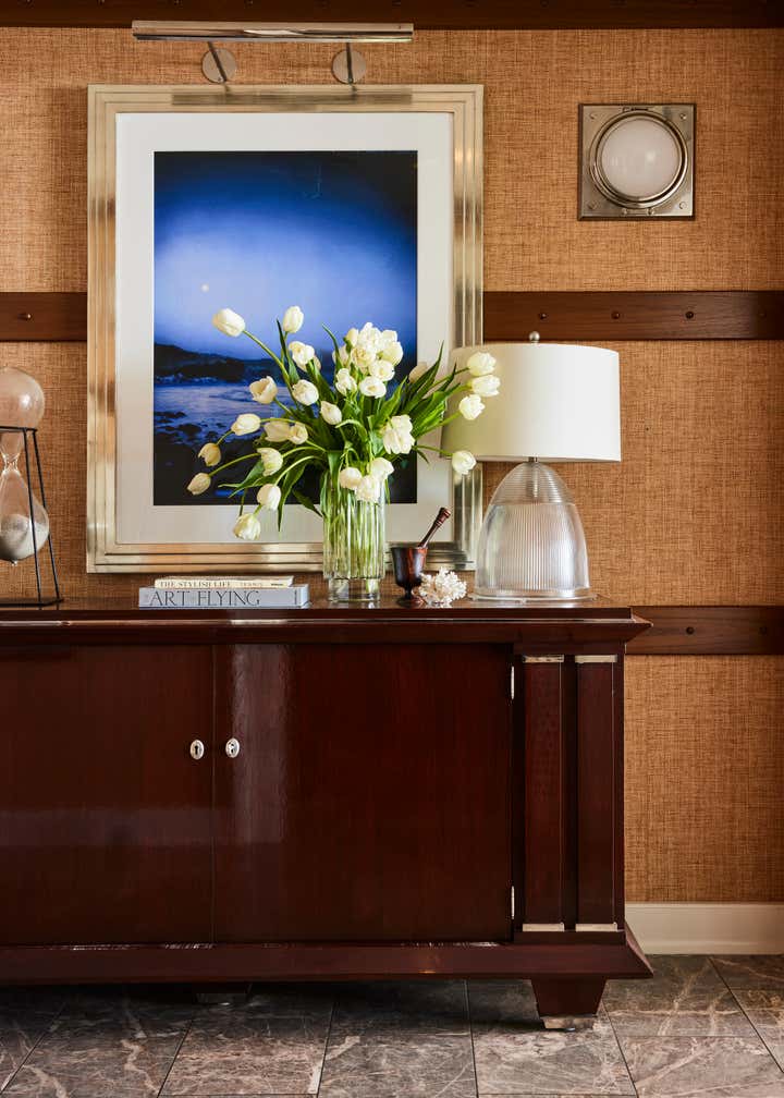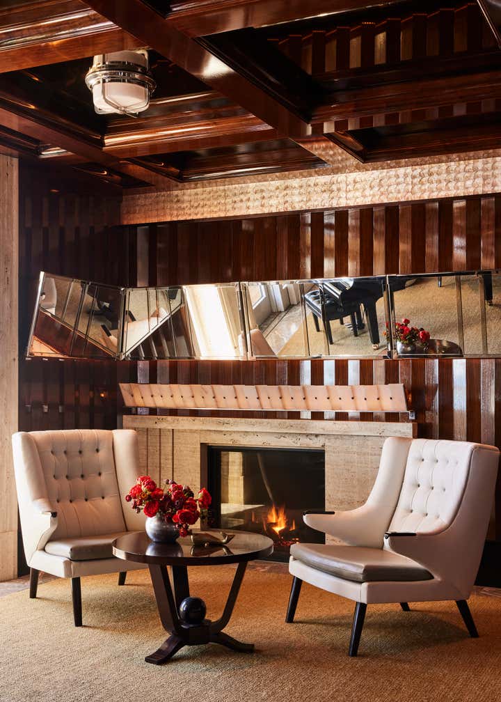 A private clubhouse on the grounds of a Montecito hotel recalls the sun-soaked romance of travel at sea in the 1930s. A beachfront, daytime level captures the high-style details of a majestic oceanliner. An evening level above emulates the sultry and glamorous tradition of clubs and speakeasies of the great hotels of the time. Deco wave patterns in gleaming mosaic, sparkling mirror and metalwork, tailored leatherwork, highly varnished, yachtlike millwork. Murals of Jazz Age characters watch over and toast the festivities.