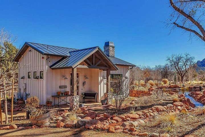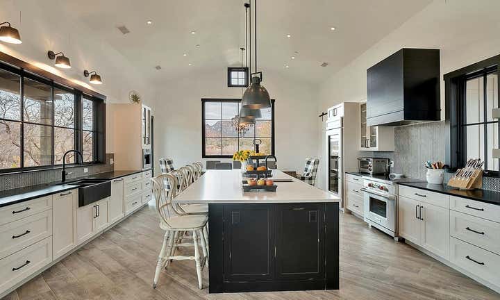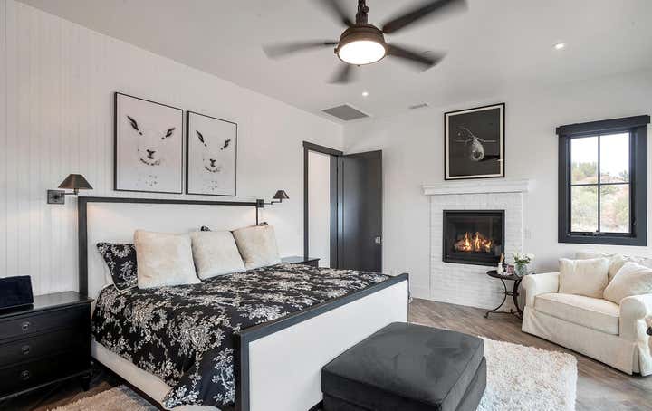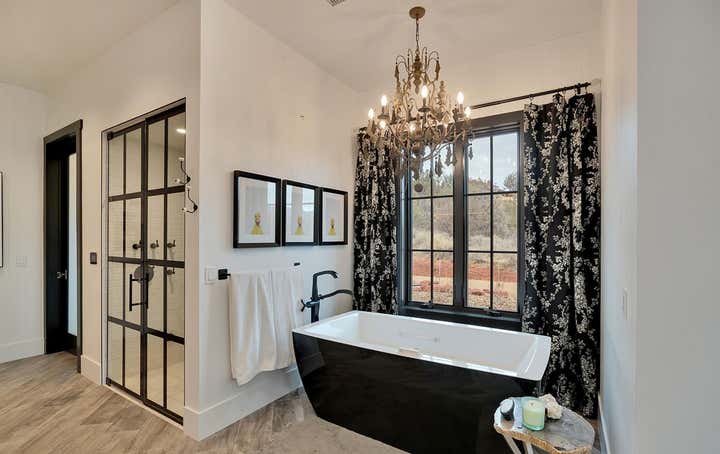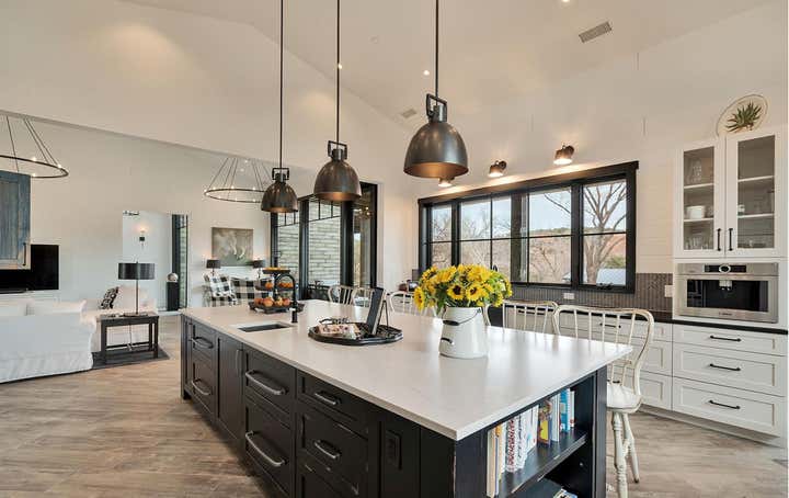 This home was designed for a client who wanted a Modern Farmhouse with an eclectic vibe. This home would fit as easily beach side as it does in the desert or mountains. The black and white and neutral color palette allow for spots of color to come thru in plants, art or other eclectic furnishings and odds and ends. The home comes with a colorful Guest house / office Studio, which sits near a creek.