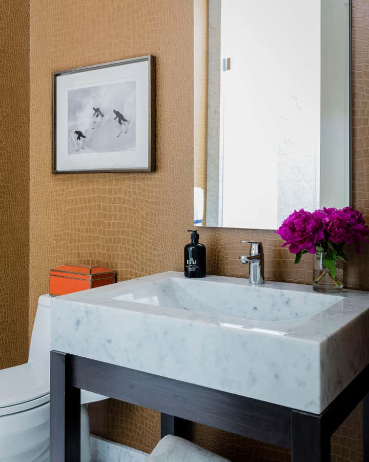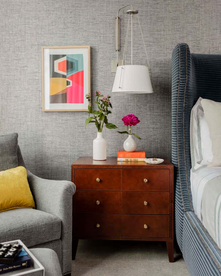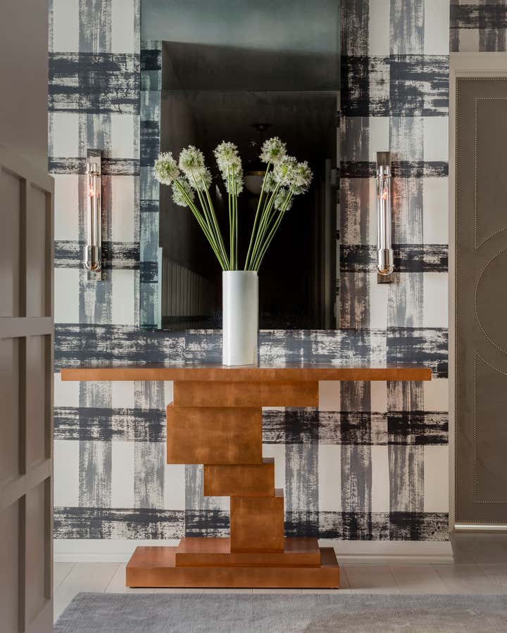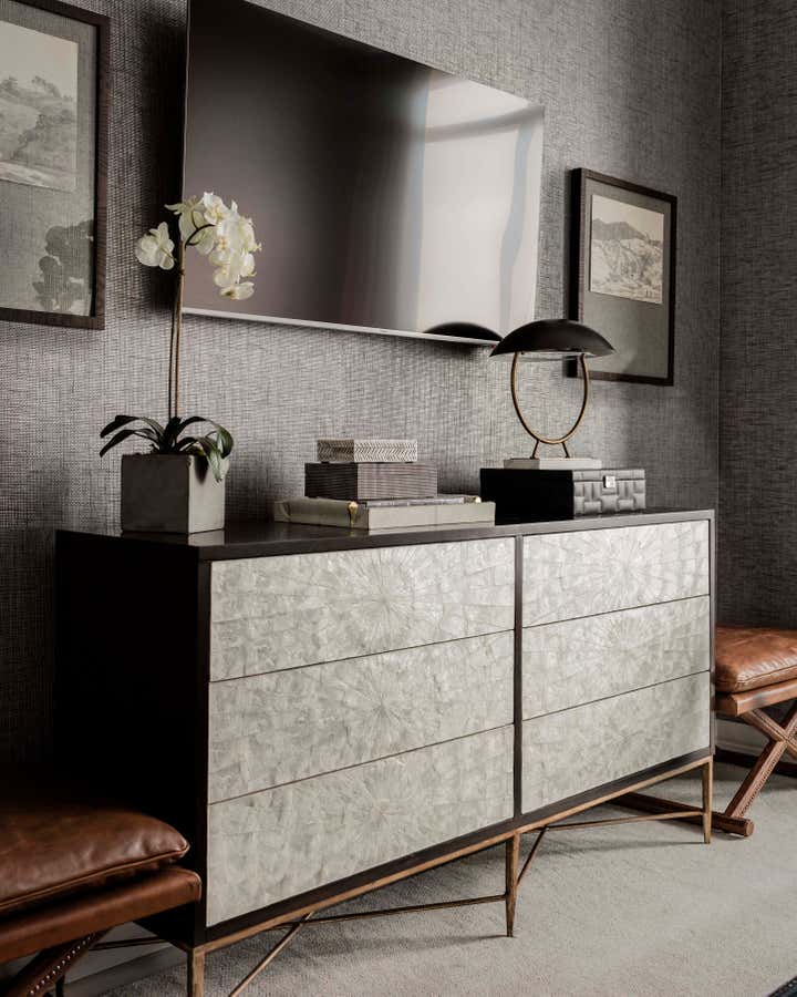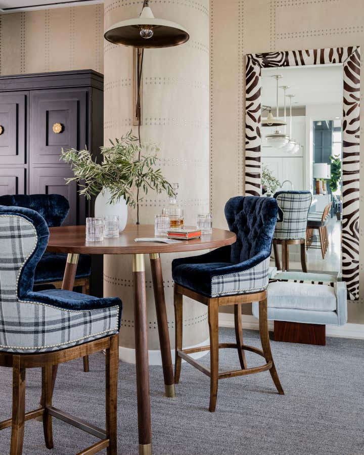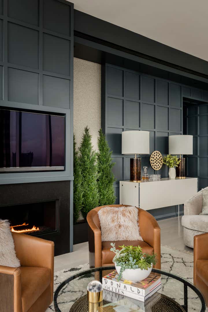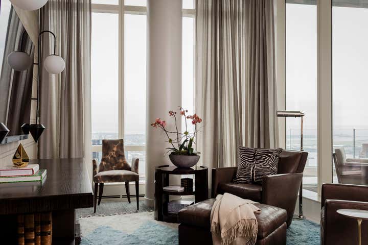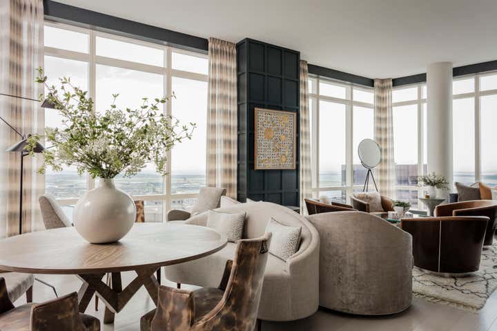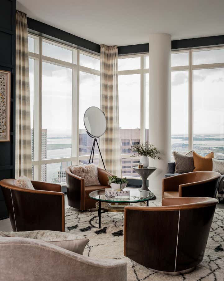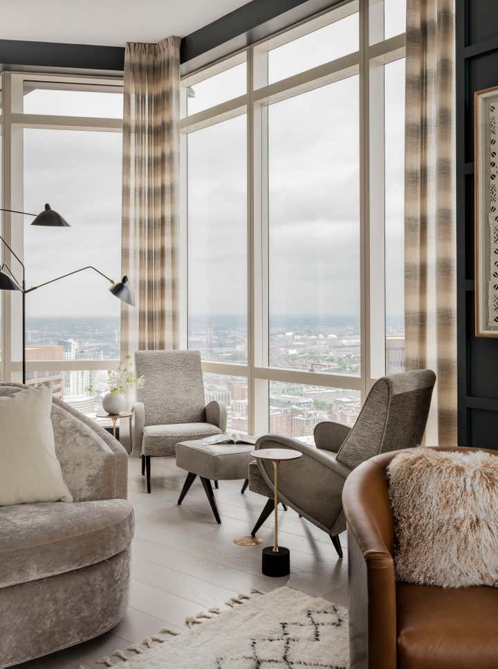 This penthouse unit in Boston s Millennium Tower soars 58 stories into the sky, with floor-to-ceiling windows in the living and dining rooms. Inspired by the dramatic view, Robin painted the interior walls dark blue so they would recede into the darkness at night. Featured in the Winter 2019 issue of Modern Luxury Interiors Boston!