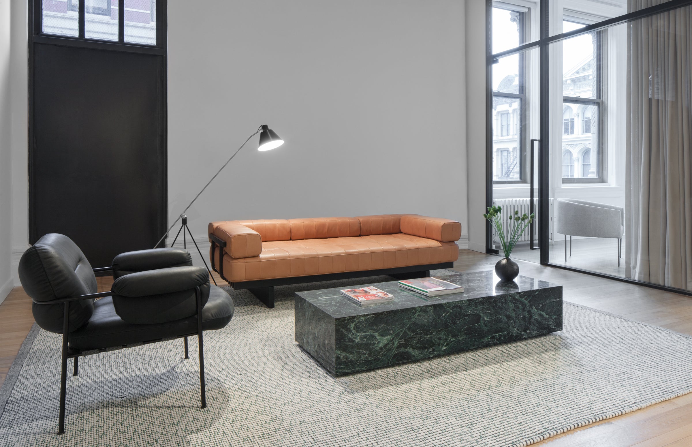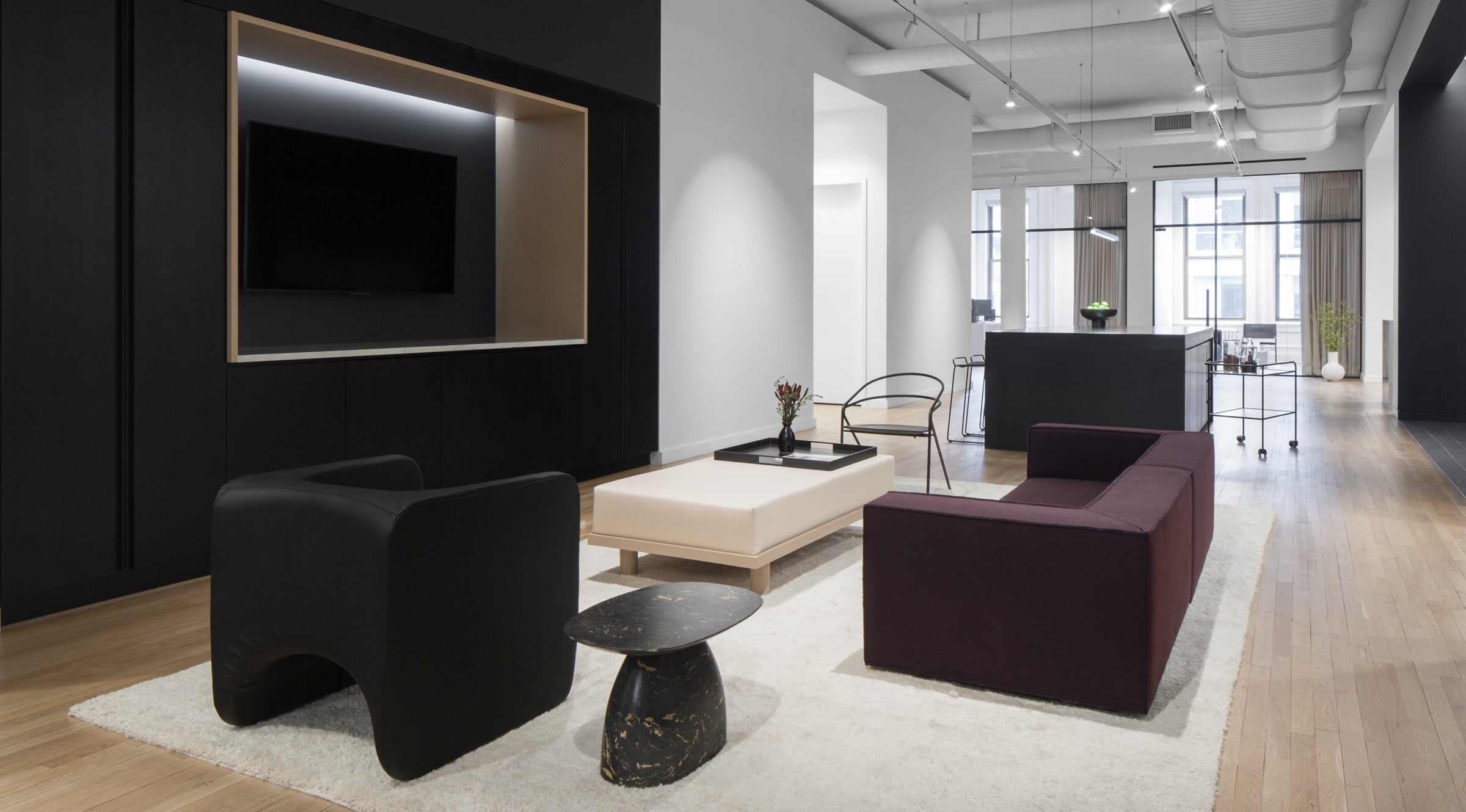 Uli Wagner Design Lab collaborated with the postproduction company Modern Post and designed their office in Soho. With smart space planning and elegant furnishing we turned this Soho loft into an airy and comfortable work environment. While developing a concept for all workstations our main focus was on seating areas for client hosting, specifically targeting design savvy clients in a relaxed but chic atmosphere. The warm seating arrangements in the rooms along the window elevations are reserved for chief editors and clients, while the centrally offered furnishings are rather meant as communal meeting points for clients and staff. Double layered curtains along the glass window-wall allow for different and flexible grades of privacy within the editing studios, while contributing to an overall residential feel. Following the latest trends in work/ life fluidity and offering a less office like work environment.