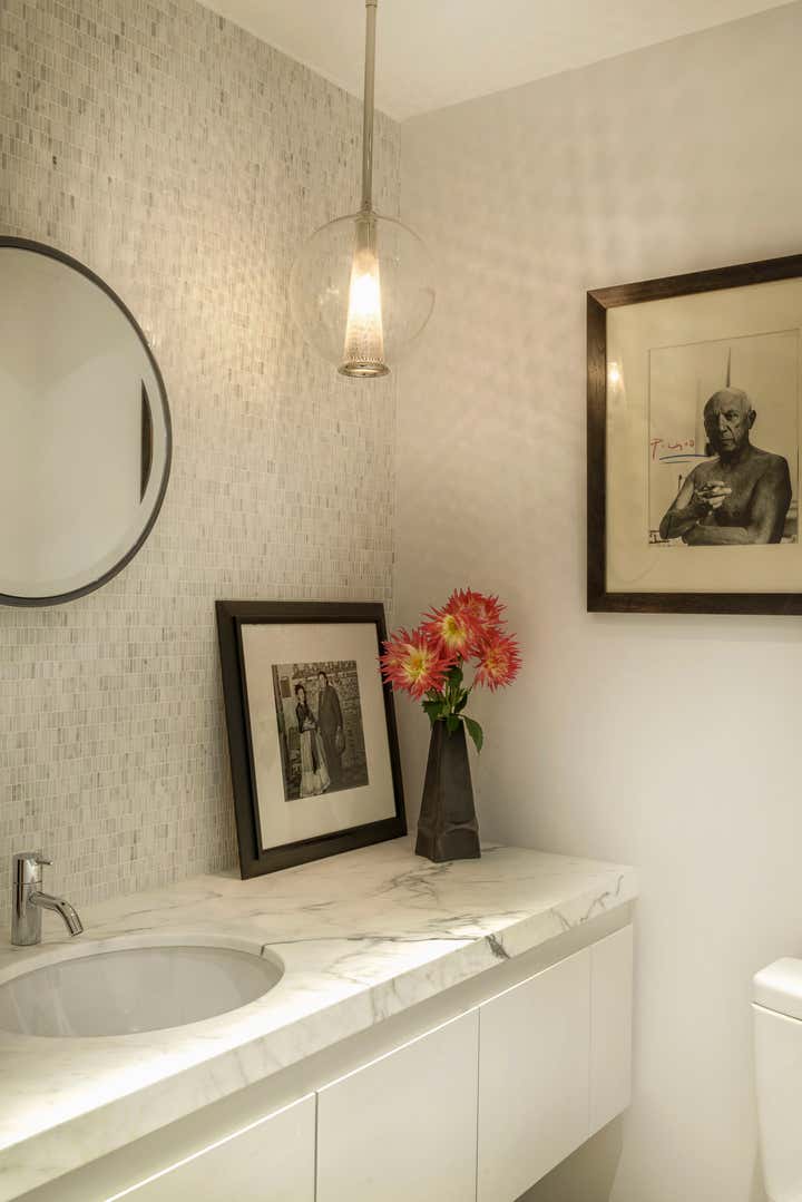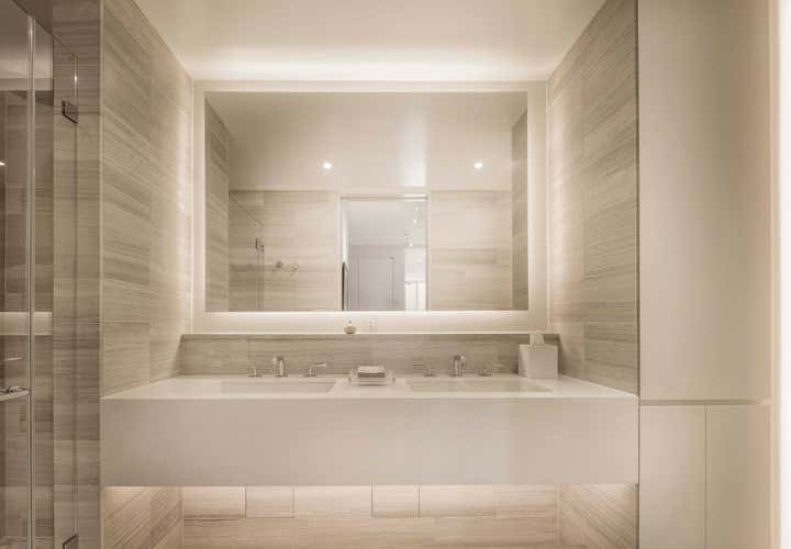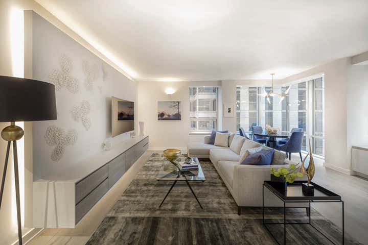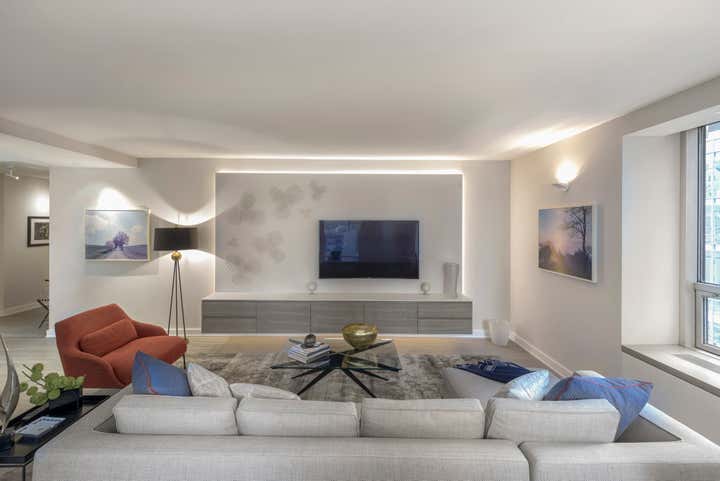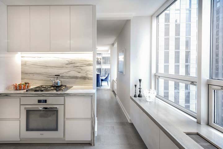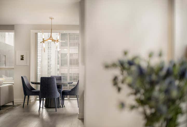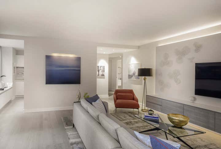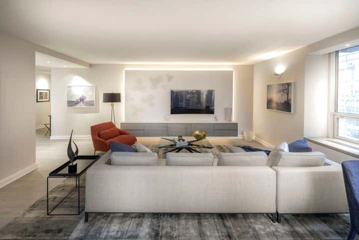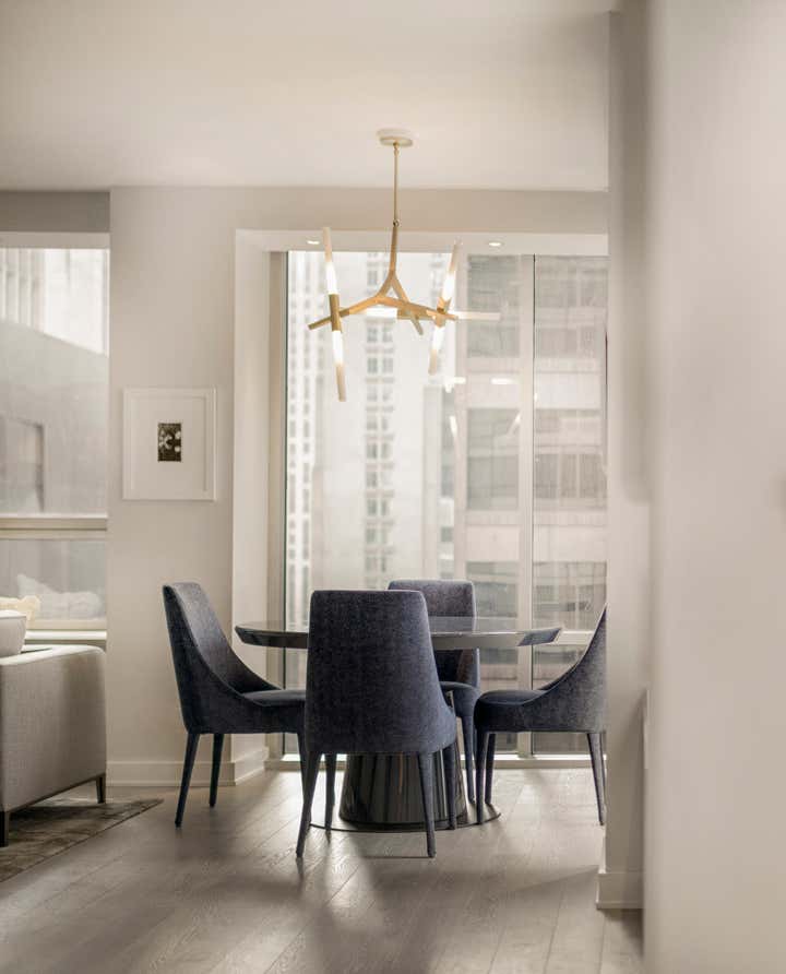 Centrally located in Manhattan, this stunning one bedroom MOMA Tower Residence received a gut renovation from our team. DHD Architecture created a bright, clean slate for a couple with impeccable taste. The strong urban landscape is visible from the floor to ceiling, with corner windows perched high above 5th Avenue. In addition, the minimally detailed custom mill work and architectural lighting lend itself to the view here.
