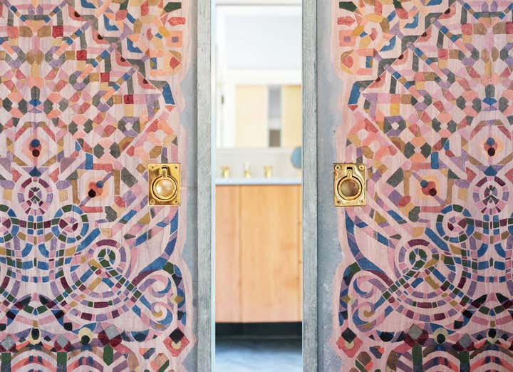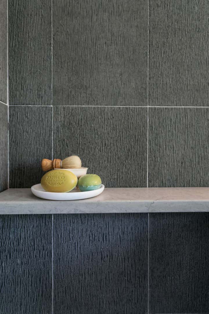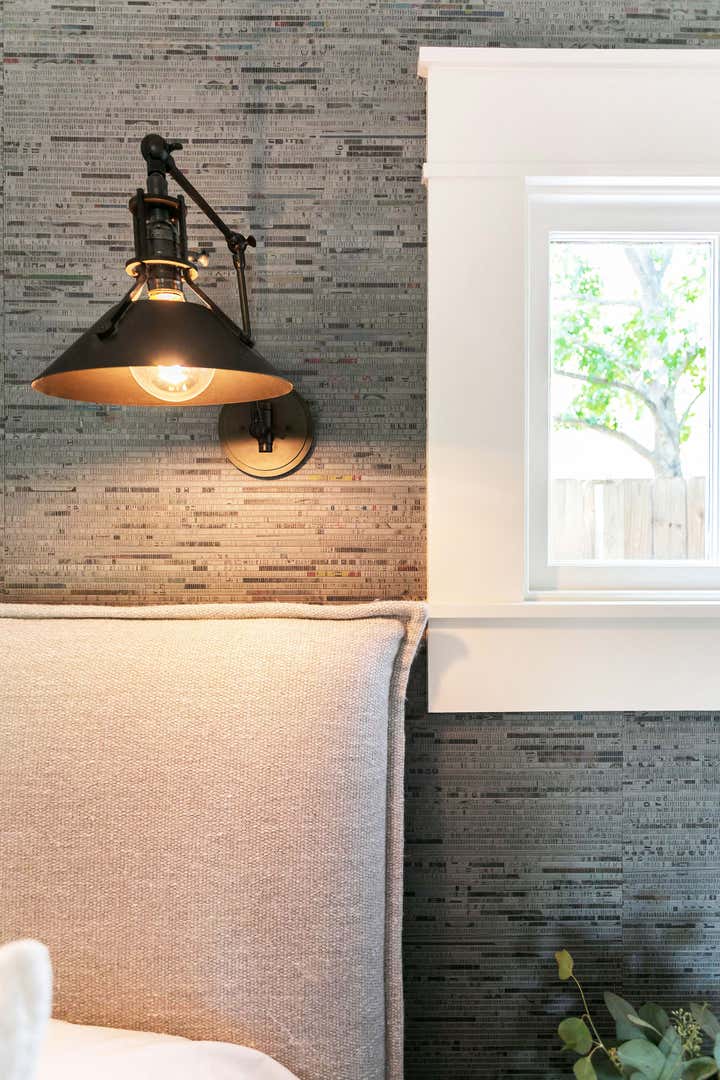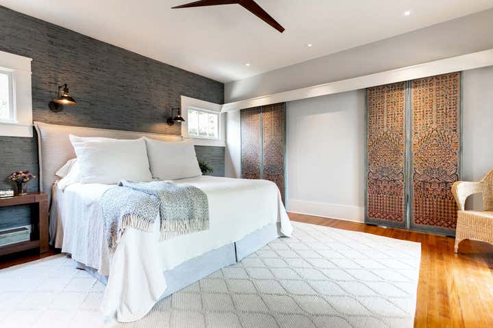 This master bed and bath retreat for a newly-wedded couple harmoniously melds combed basalt tile and 1940’s vintage lighting with a minimal interior canvas creating a contemporary yet timeless feel. Antique art panels as doors, recycled newspaper wall covering, and layered natural textures create a composed, restful haven.