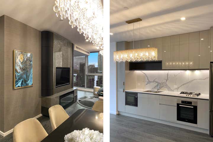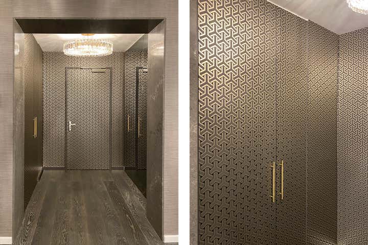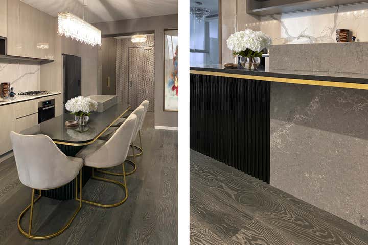 In our Southbank city apartment, we designed a space that is fashionable, functional, and reflects the homeowners personality. From first impression onward, the apartment is a testament to creativity, boldness, and a blend of feminine and masculine power. The entrance features a shimmering champagne geometric wallpaper, and it’s defined by the stone door frame leading to a decidedly glamorous kitchen.