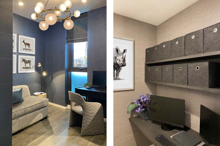 In the home office, the blue wallpaper provides the perfect backdrop and drama to the space. The pendant light introduces a little glamour with gold detailing for that luxurious, yet professional feel, while a comfortable and well-designed chair, seamlessly integrates in this home office area. With a daybed and plenty of storage, this multi functional space enables the homeowners to stay on top of their business, while the chic decor, promotes a relaxing experience.