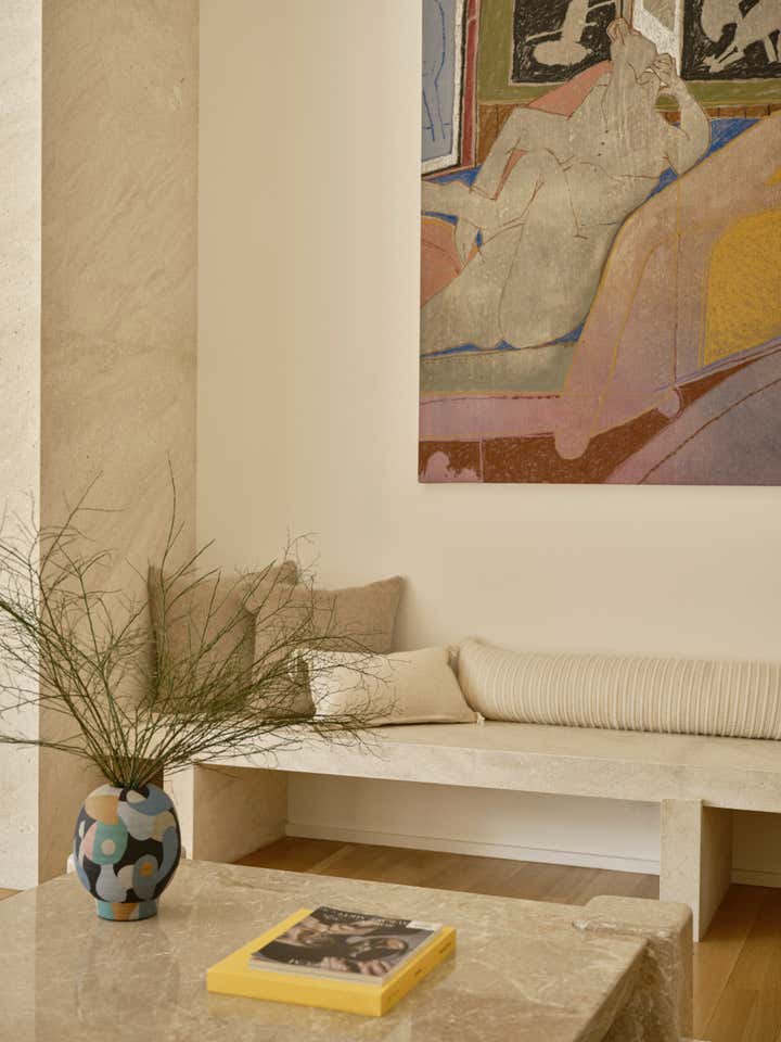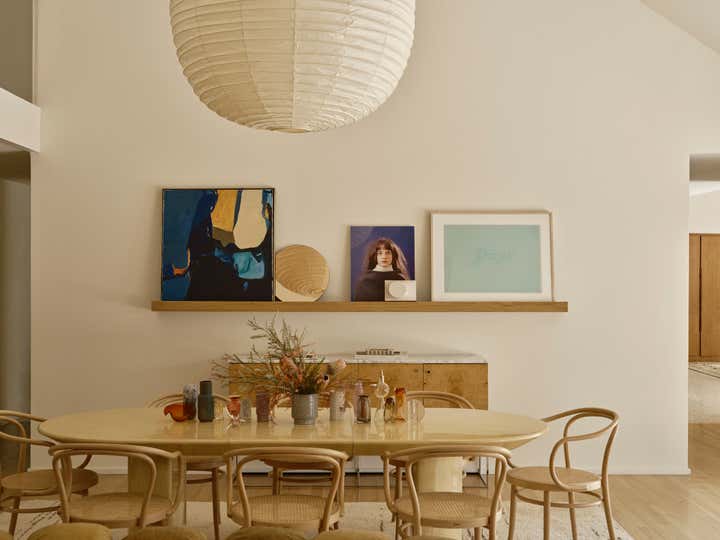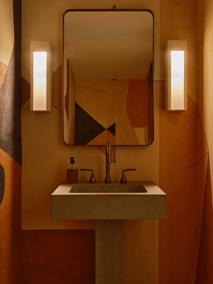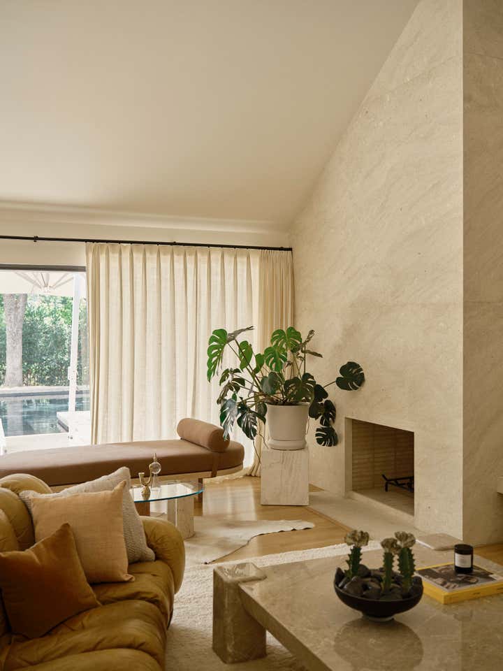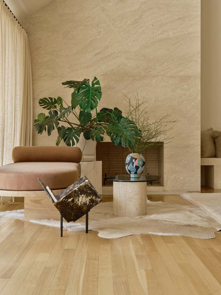 The studio led a full renovation design, celebrating the home’s existing clean-lined 80s modernism while layering in tactile, organic elements like white oak doors, honed stone countertops, handcrafted clay tiles, hand-painted wall-coverings, and a monumental custom limestone fireplace and bench. The room are filled with a mix of sculptural furnishings, well-curated vintage pieces, artisanal lighting, and a highly personal art collection. The result is an inspiring family home for a creative young family.