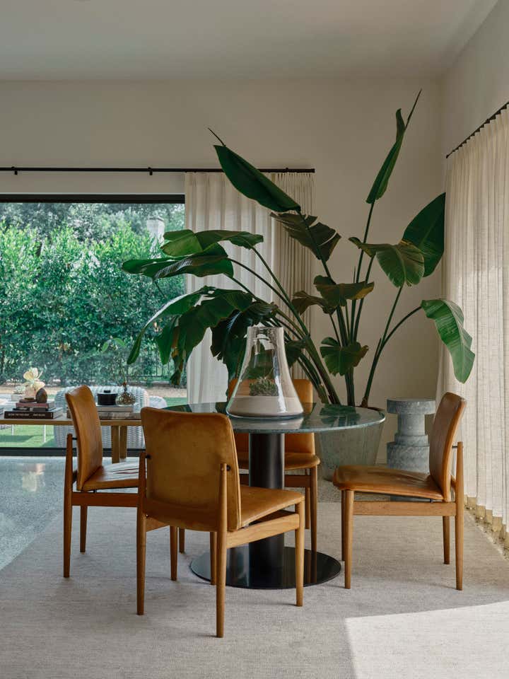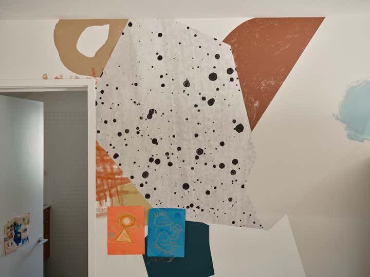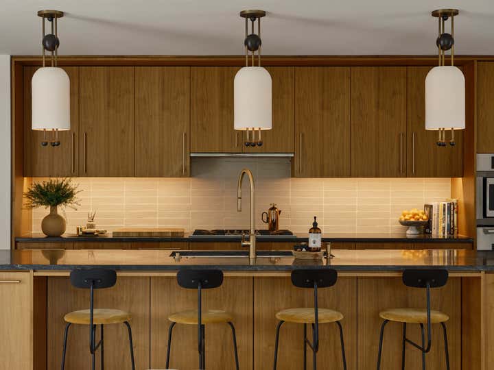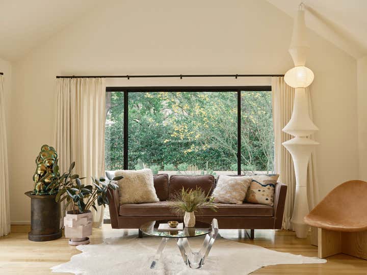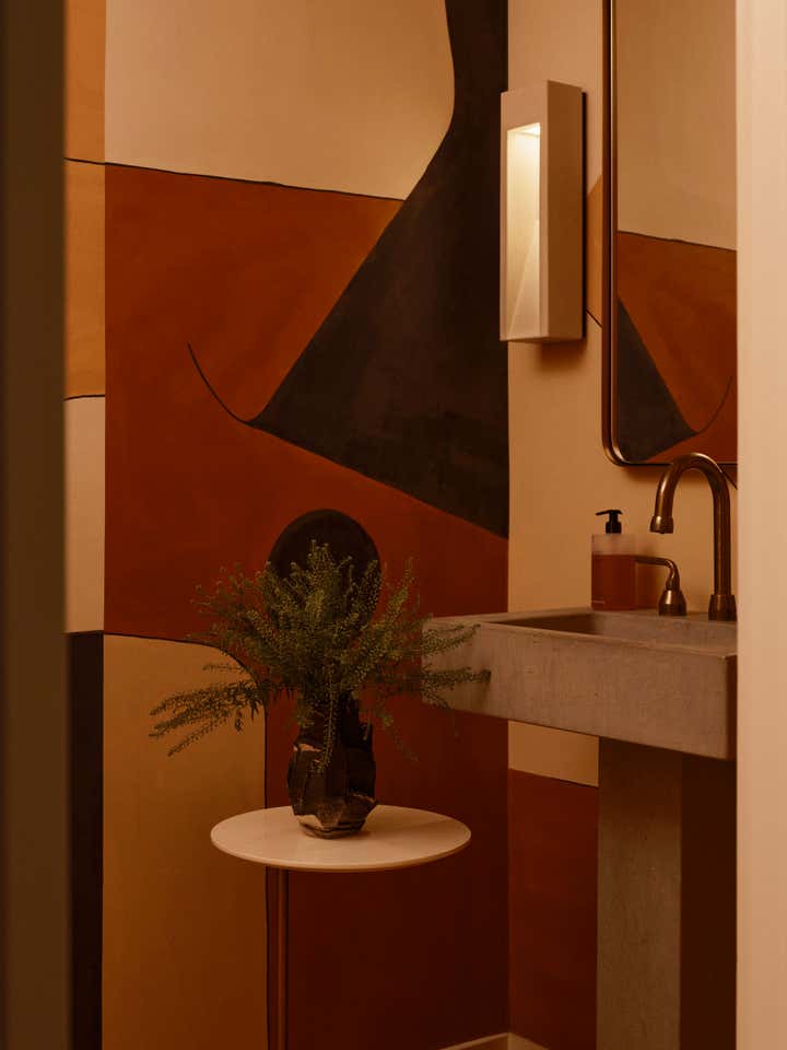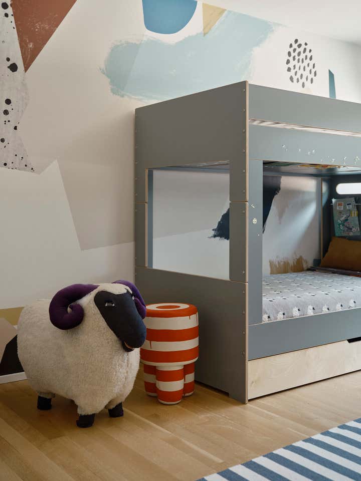 The studio led a full renovation design, celebrating the home’s existing clean-lined 80s modernism while layering in tactile, organic elements like white oak doors, honed stone countertops, handcrafted clay tiles, hand-painted wall-coverings, and a monumental custom limestone fireplace and bench. The room are filled with a mix of sculptural furnishings, well-curated vintage pieces, artisanal lighting, and a highly personal art collection. The result is an inspiring family home for a creative young family.