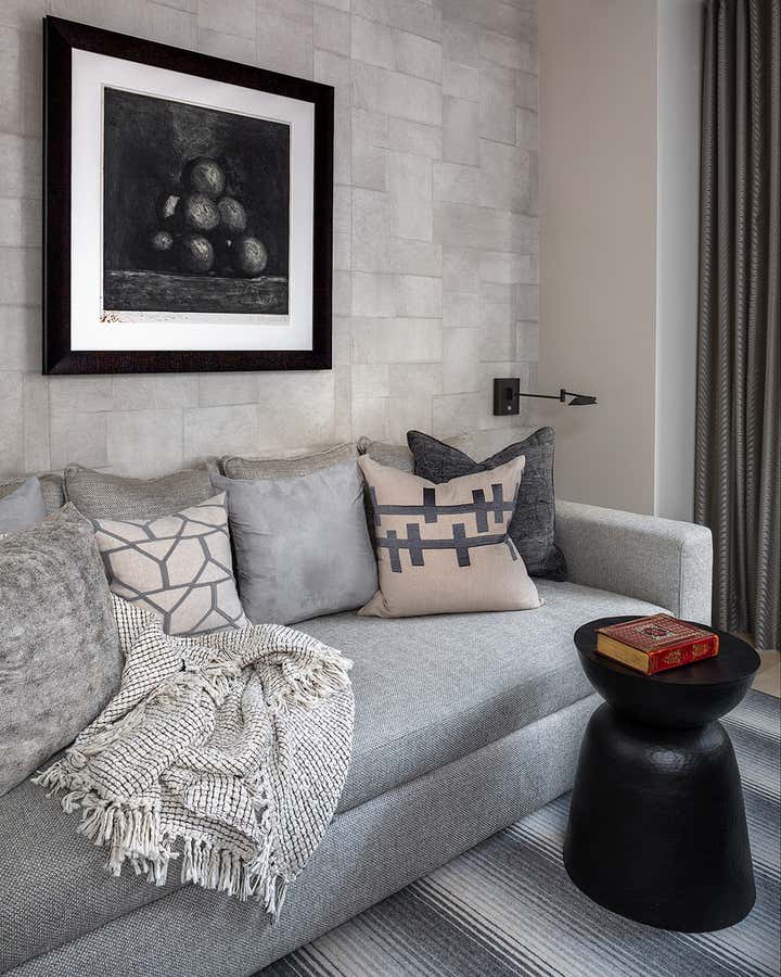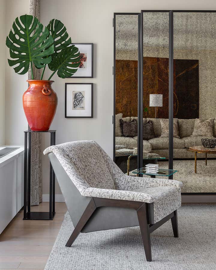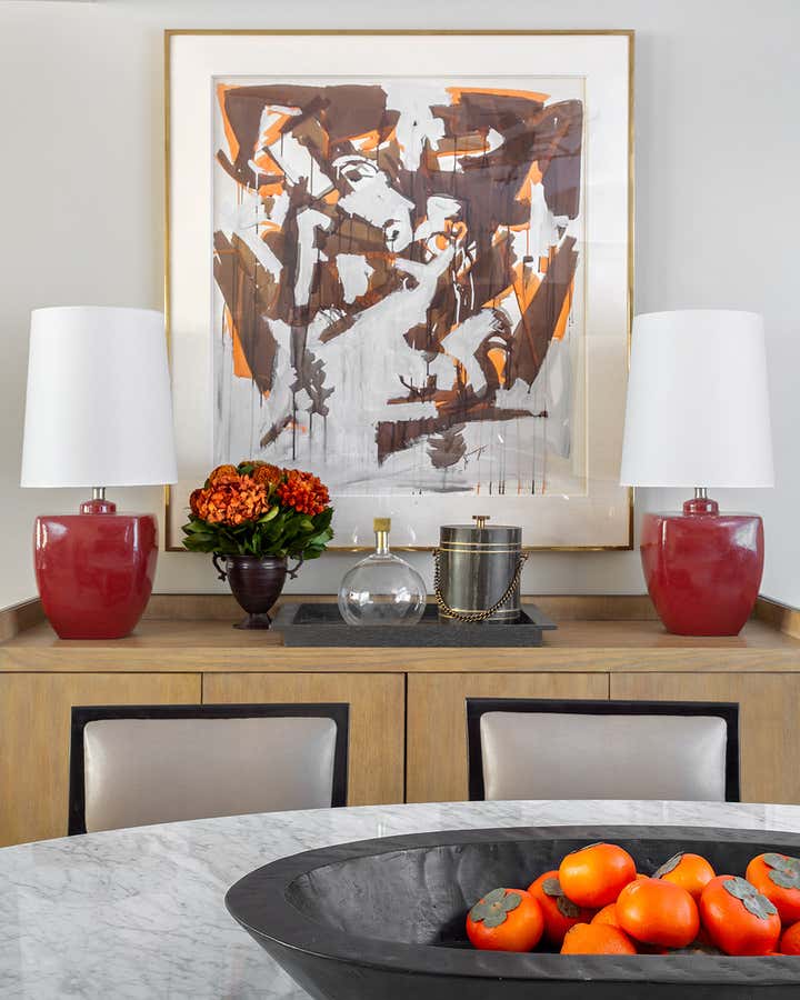 We quickly decided on a wide range of neutrals used across a diverse textural palette as a respite from the visual excitement of the city. With this soothing look and feel in mind, we drafted a streamlined furniture plan, combined clean lined new pieces and one of a kind vintage pieces, and then layered in a few but very special objéts and paintings. A vintage coffee table with a brown and cream tiled top also brought in hits of persimmon, burnt orange and blood red which we incorporated in light touches throughout the project.