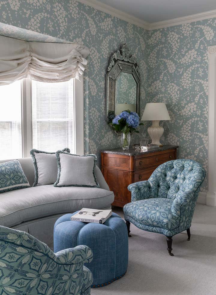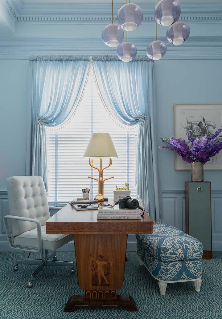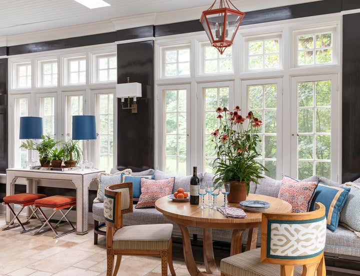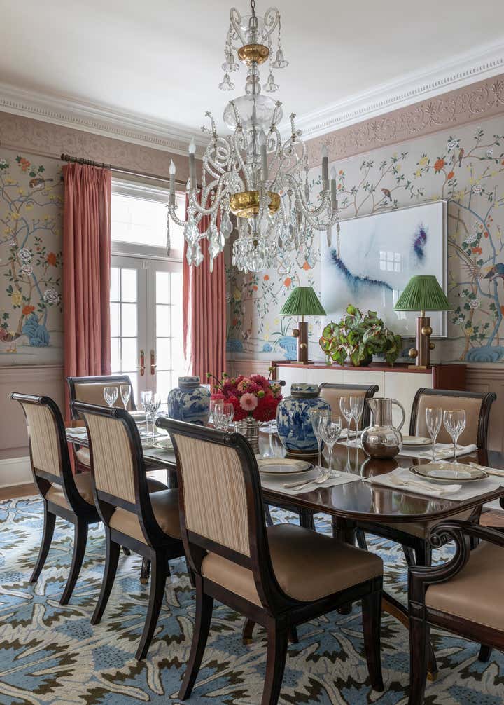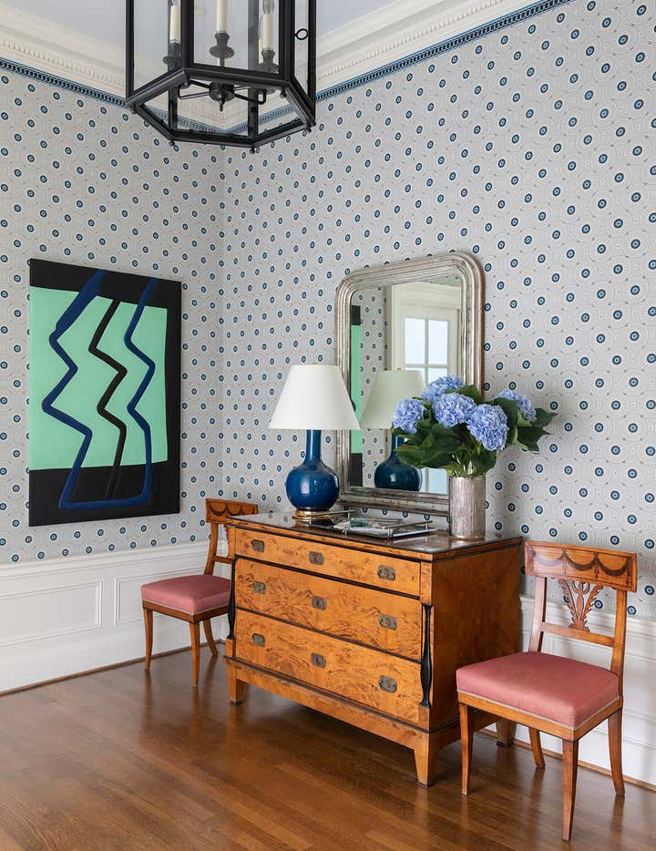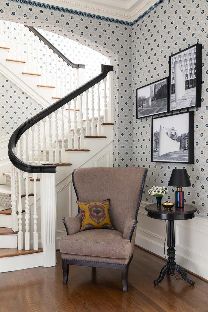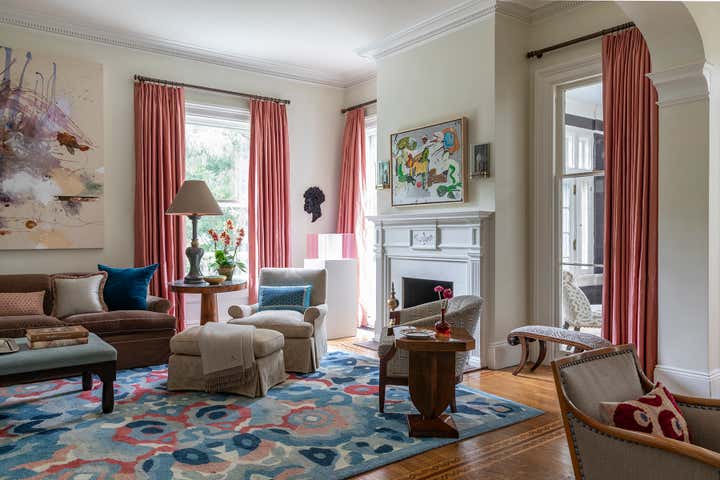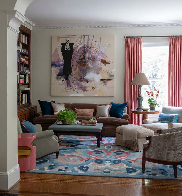 The decoration of a spacious Victorian era house in Short Hills, New Jersey, for a young family with a growing collection of contemporary art. With its high ceilings and light filled rooms, the house has an unconventionally loft-like open floor plan. Colors, patterns, and furniture styles were strategically selected to visually knit the rooms together while still preserving their individual characters. A mix of custom contemporary furnishings and shapely 19th and 20th century pieces creates a studied eclectic backdrop for the owners’ artworks. Photos by George Ross.
