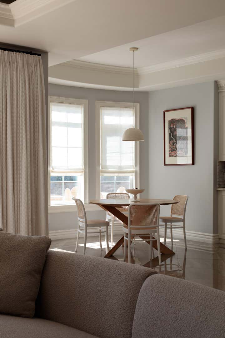 The challenge was creating warmth and personality in spaces with soaring ceilings and formal proportions while maintaining functionality for daily family life.