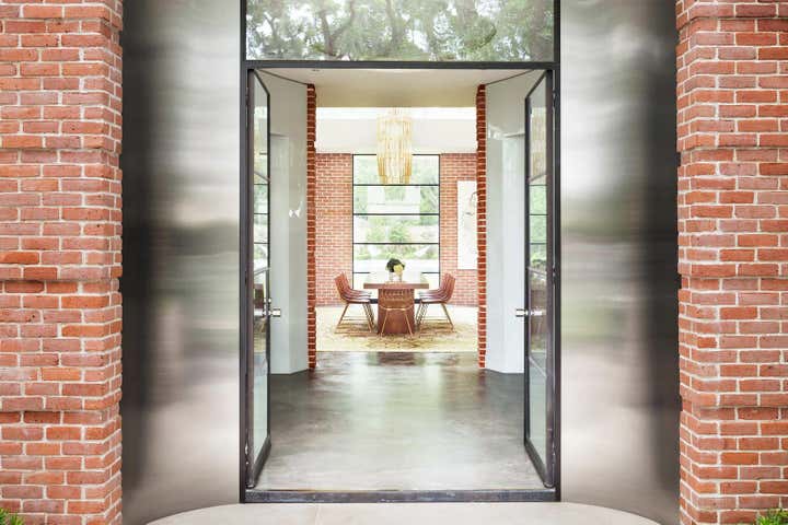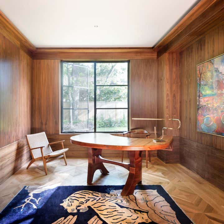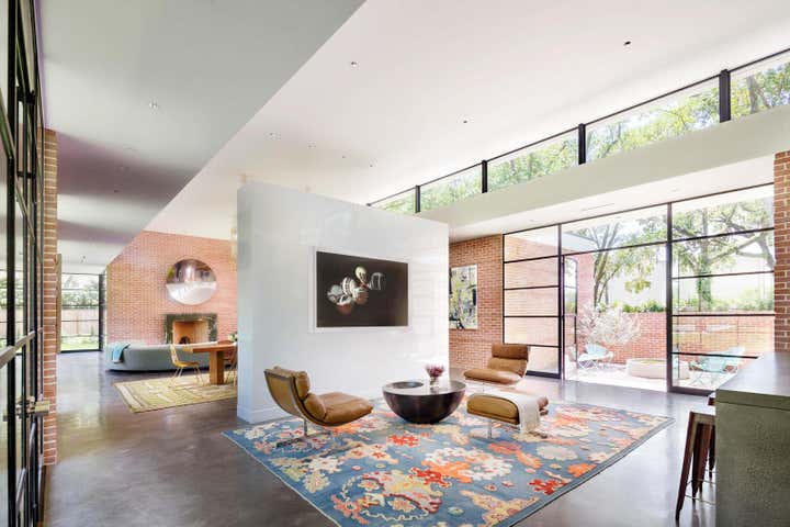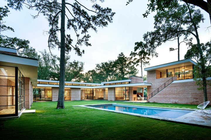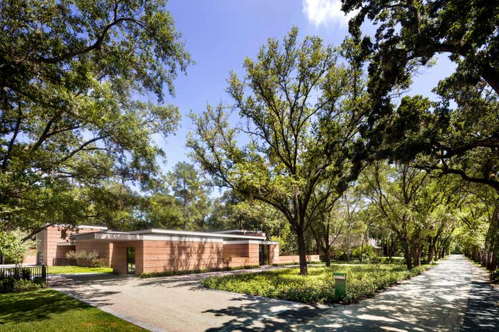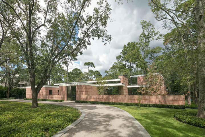 The homeowners’ appreciation for mid-century modern architecture allowed us to create a residence whose modest appearance belies its large size. Keeping the profile long and low — in other words, building outwards rather than upwards — we effectively managed the scale of the brick house without compromising on its spacious, 8,300-square-foot floor plan. Requiring both precision design and quality construction, many of the custom features in the home were inspired by the client’s business: shipbuilding. By using classic modernist materials in surprising ways, we made the house not just a collection of rooms, but a series of experiences. Sheets of stainless steel are curved to “embrace” visitors at the entry to the home; polished concrete floors convey the adventuresome atmosphere found in an art gallery; walnut paneling gives a stateroom-like feel to the study.