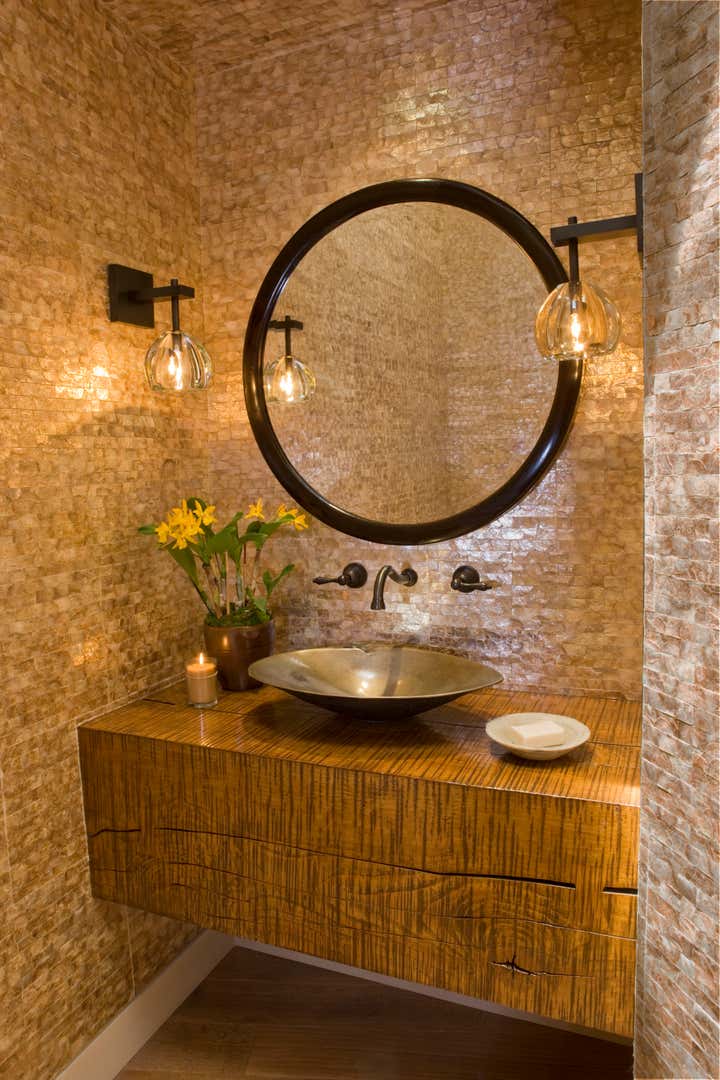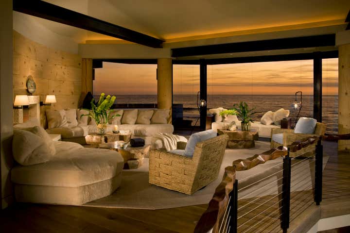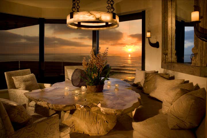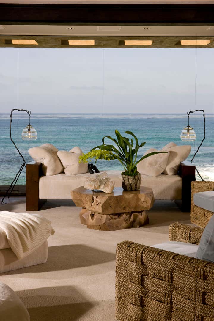 A true collaboration of designer, architect, builder and client, this dramatic, sculptural, organically inspired home appears to rise from the rocky outcropping on the sandy beach just steps away. Designed to withstand the reality of a beach environment, materials such as architectural bronze, Venetian plaster, and custom cut-stone from Turkey were implemented to keep maintenance to a minimum. All furnishings were custom designed, recalling the faceted quality of natural minerals and stone. Reclaimed walnut was sculpted into unique cocktail tables, the Master bed and handrails for a timber staircase. Extensive use of natural sheepskin and hand hooked carpets soften and give a stylish, sexy vibe to the home. Architecture by Tim Martin AIA.