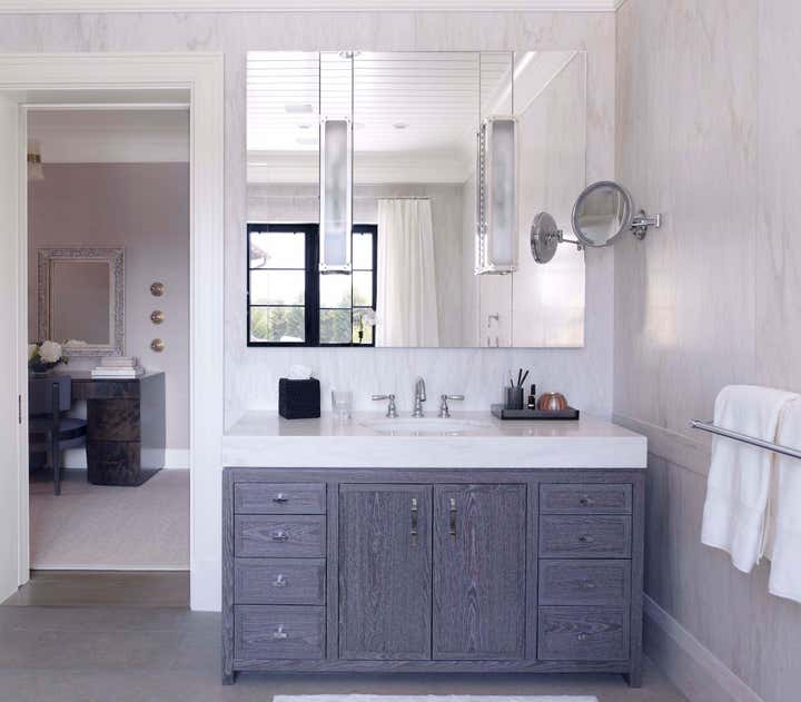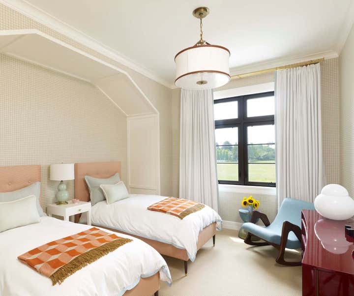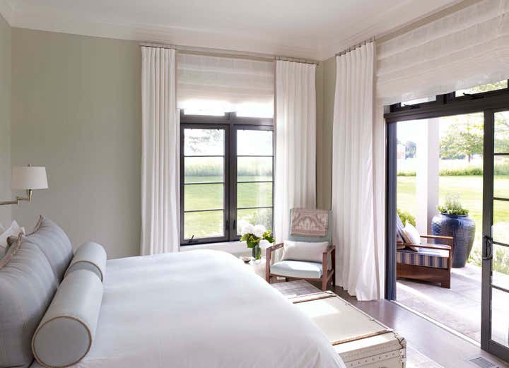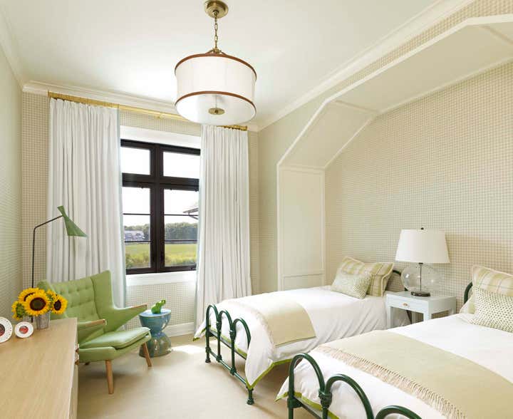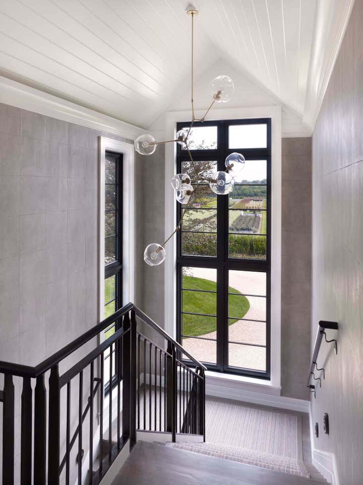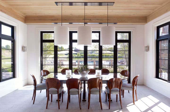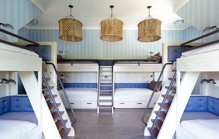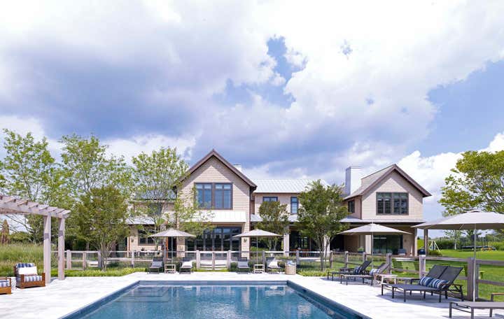 This new construction summer home in Bridgehampton, NY was built to accommodates the full, active lifestyles of two sisters and their families. It was important for there to be plenty of entertaining space for large groups, and equally important to have areas where families and guests could be afforded privacy. There are three master suites: one for each sister and one for the grandparents, and a suite of bedrooms for children, in addition to a nautically-themed bunk room that sleeps 11 with built-in custom beds. The breakfast room converts to a screened porch which connects to a rear patio. The rear yard has an expansive pool and pergola. Architecture: Granoff Associates; General Contractor: Hobbs, Inc.