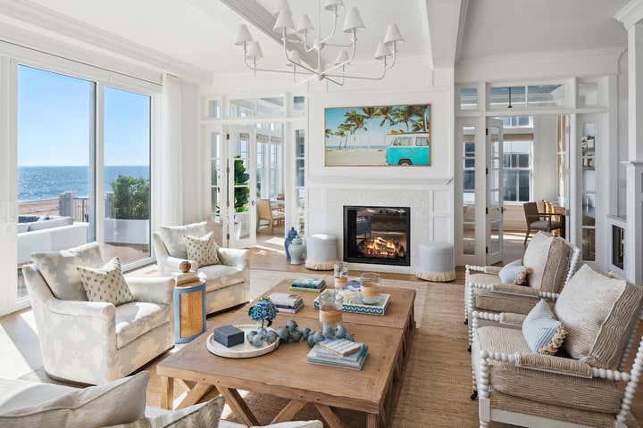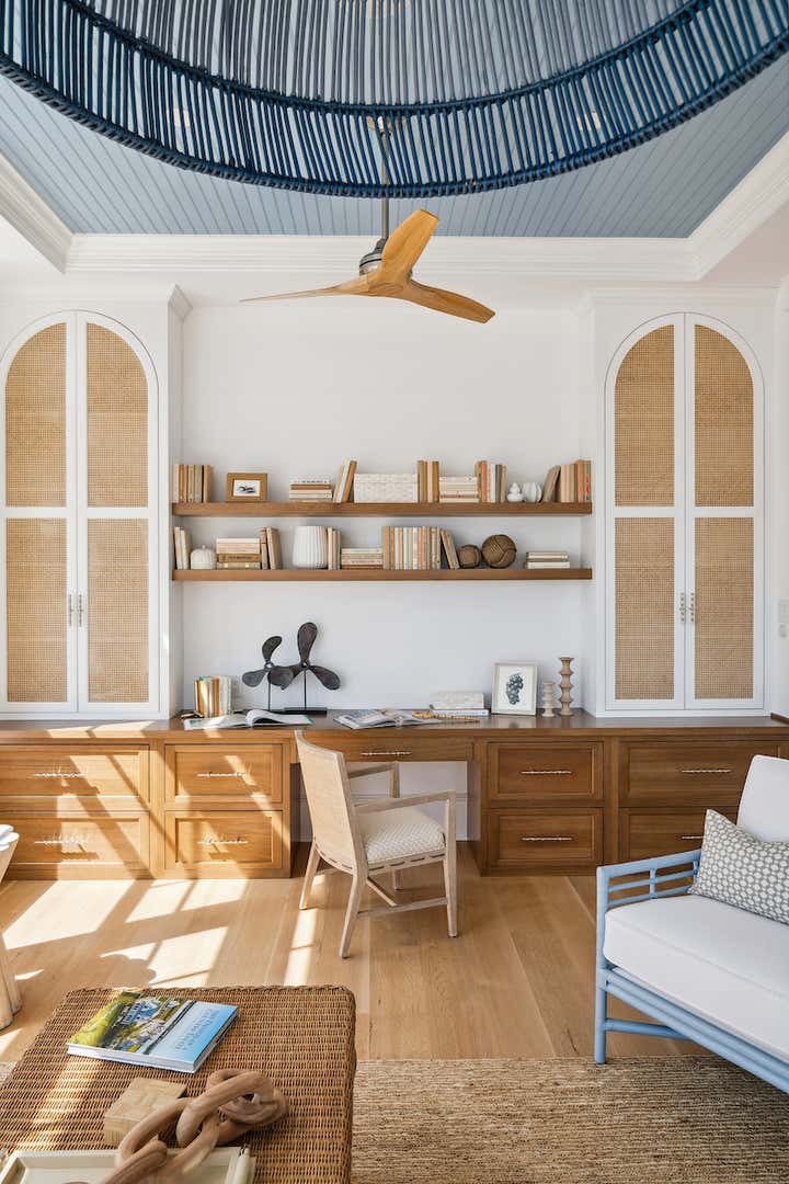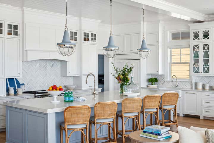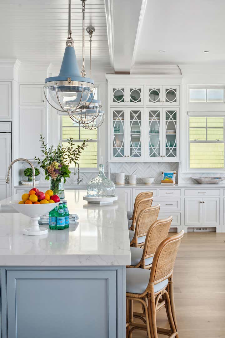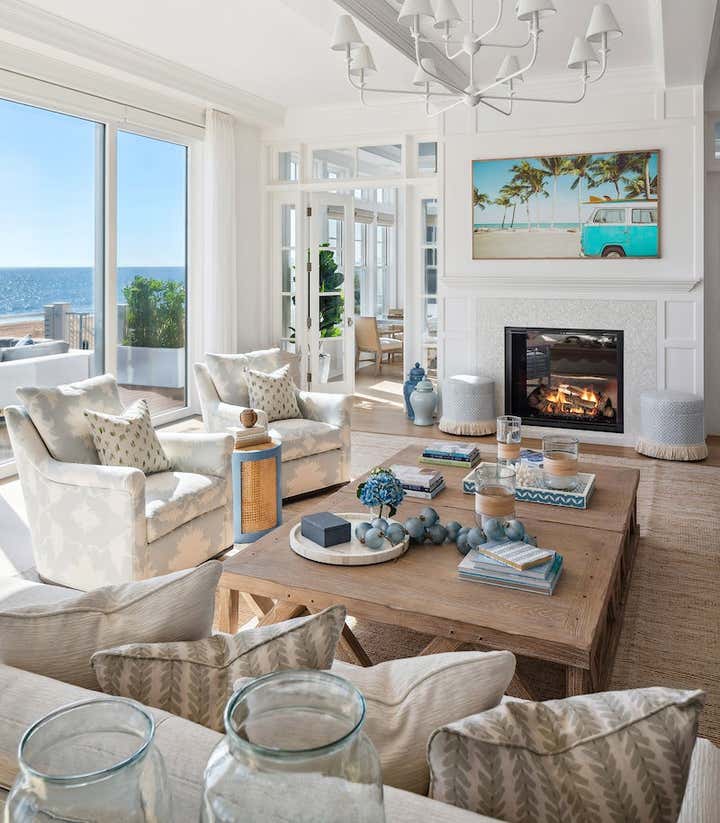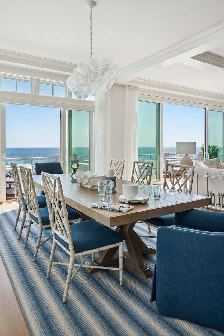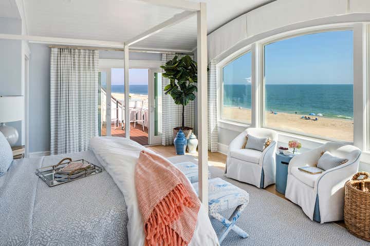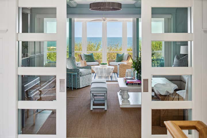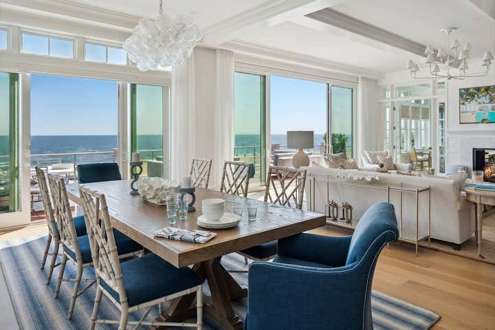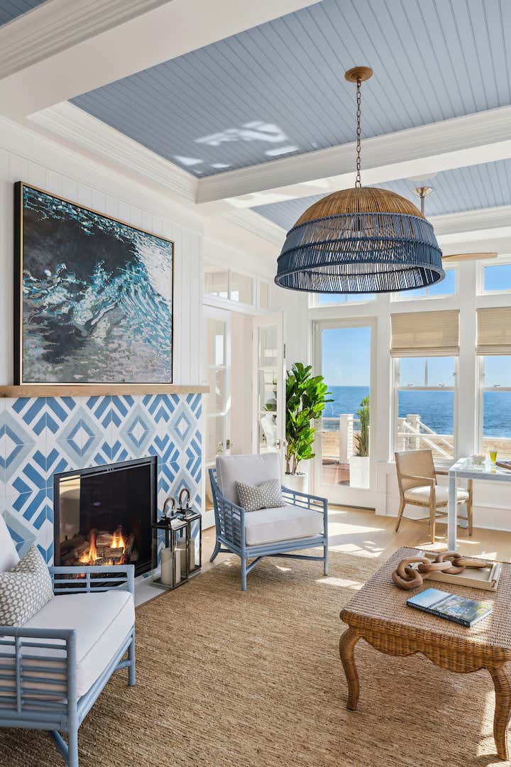 THIS STUNNING NEW oceanfront home in Bethany Beach, Delaware exudes coastal charm in every detail. The clients desired a comfortable, coastal-inspired home, but also one that did not scream “beach”. Interior design selections were intentionally kept light, airy, and neutral – but in various textures, patterns, and shapes – to enhance the stunning panoramic water views. The occasional pop of blue nods to the vibrant ocean just outside. In the sunroom, a light blue paneled ceiling is reminiscent of the traditional painted porch ceilings seen throughout the South, while a vibrant blue fireplace surround adds a touch of whimsicality. Throughout the home, colorful tiles, natural textures, and coastal-inspired furnishings combine to make each space inviting and unique.