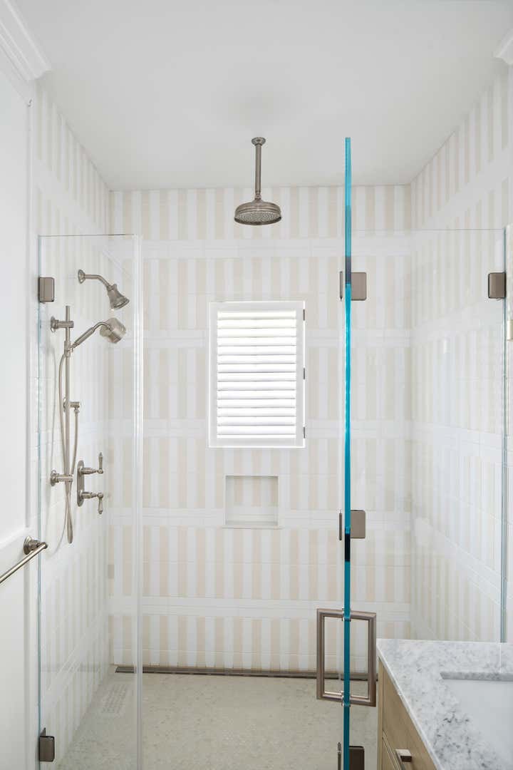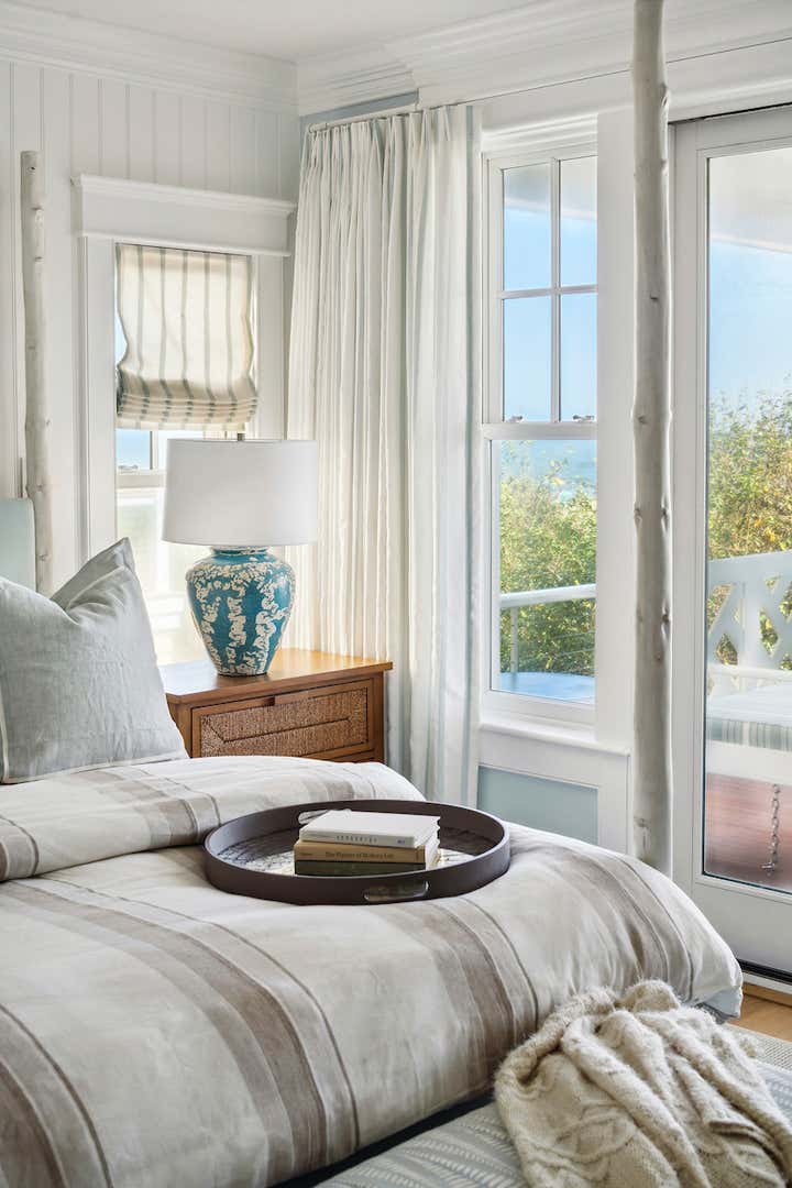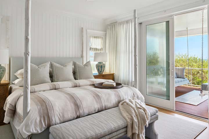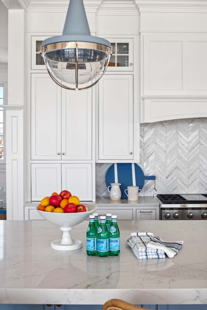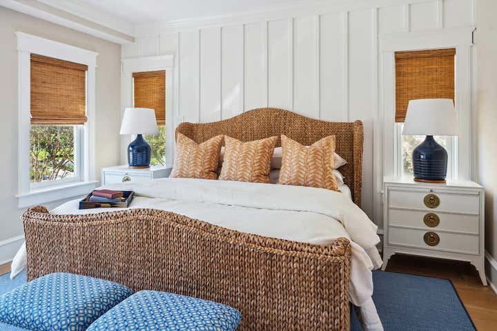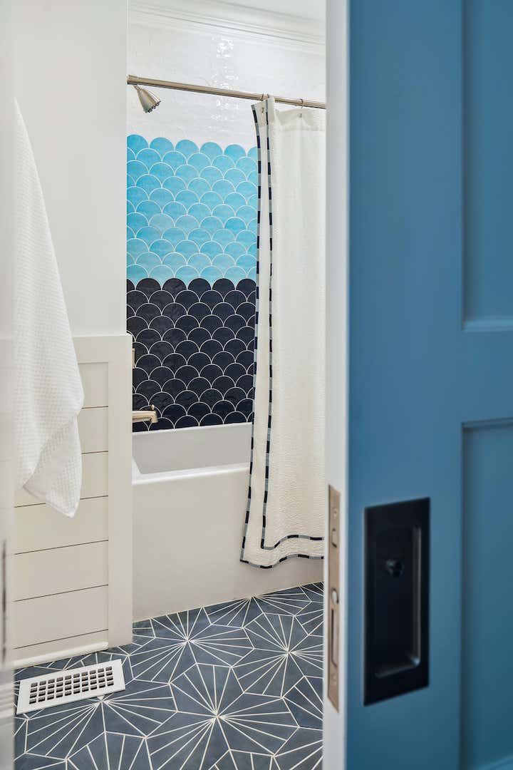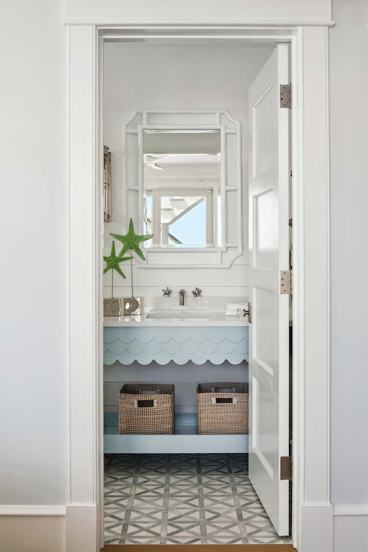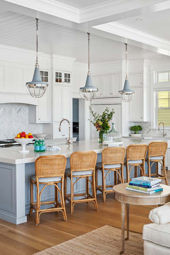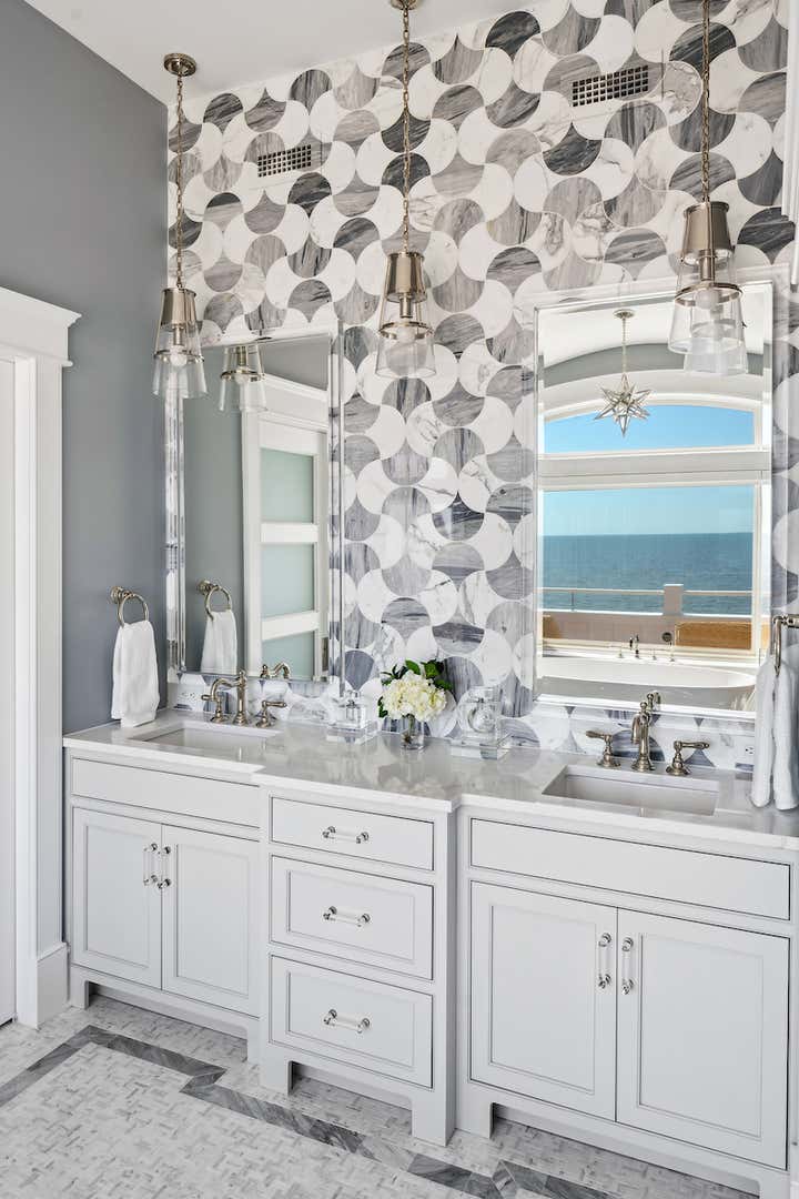 THIS STUNNING NEW oceanfront home in Bethany Beach, Delaware exudes coastal charm in every detail. The clients desired a comfortable, coastal-inspired home, but also one that did not scream “beach”. Interior design selections were intentionally kept light, airy, and neutral – but in various textures, patterns, and shapes – to enhance the stunning panoramic water views. The occasional pop of blue nods to the vibrant ocean just outside. In the sunroom, a light blue paneled ceiling is reminiscent of the traditional painted porch ceilings seen throughout the South, while a vibrant blue fireplace surround adds a touch of whimsicality. Throughout the home, colorful tiles, natural textures, and coastal-inspired furnishings combine to make each space inviting and unique.