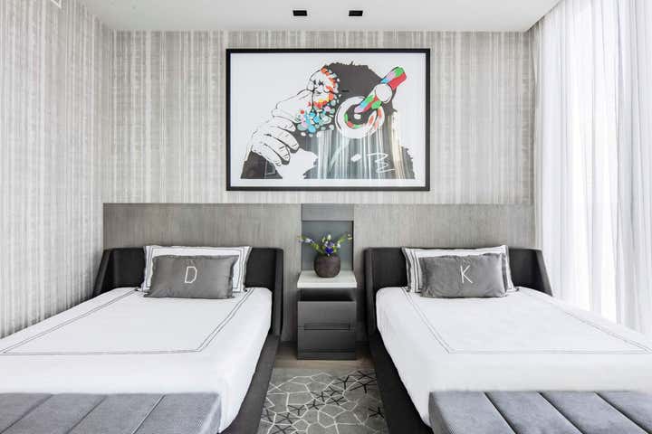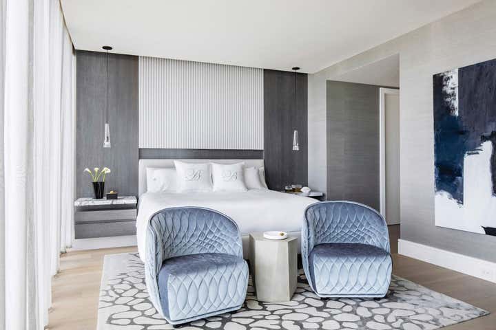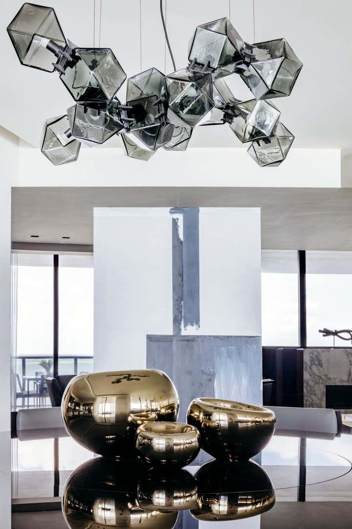 B+G designed a family-friendly vacation home for a family of four at the Porsche Design Tower. The residence is equipped with a two-car garage, and Sugerman notes that the building’s calling card demands attention. “When you’re in the lobby, you can see the car elevators going up the building,” he says. “Both the concept and the execution are cool.” Loor emphasizes that durability—as well as the cool factor—was required. The 4,500-square-foot residence with four bedrooms and 3.5 baths was designed for children and teens, yet masquerades as a sophisticated, tailored vision in white, blue and grayscale. Liberal use of slick surfaces and metallics refer to the building’s automotive theme. B+G Design modified the floor plan to create a kids’ hangout space and the family room’s oversized sectional represents the home’s marriage of aesthetics and resilience: upholstered in a durable, two-tone basket-weave Holly Hunt fabric, custom made in collaboration with Grafton Furniture. The hangout room, features a functional sleeper sofa by Arravanti, features Herman Miller’s adjustable Sayl desk chair from Design Within Reach, and metallic blue velvet throw pillows swathed in Holly Hunt fabric.