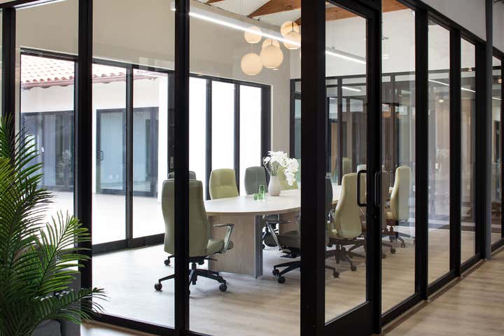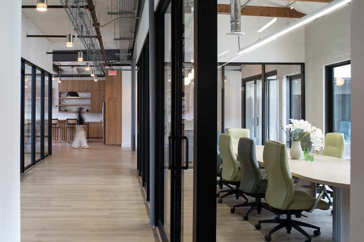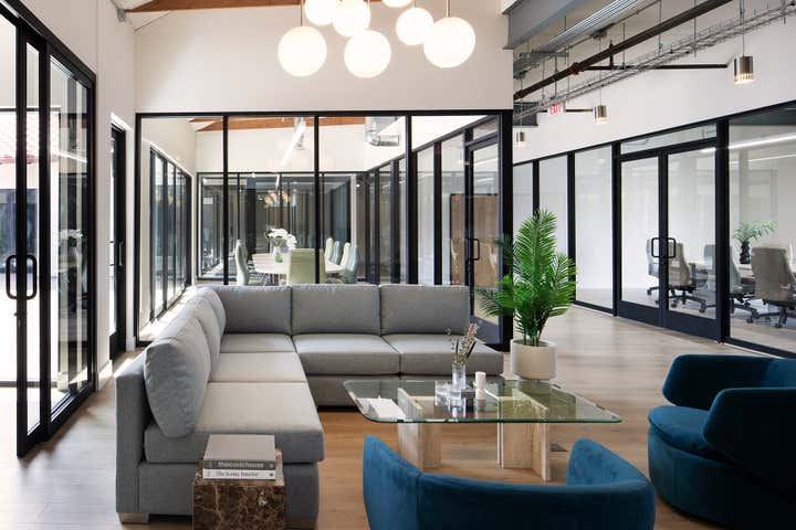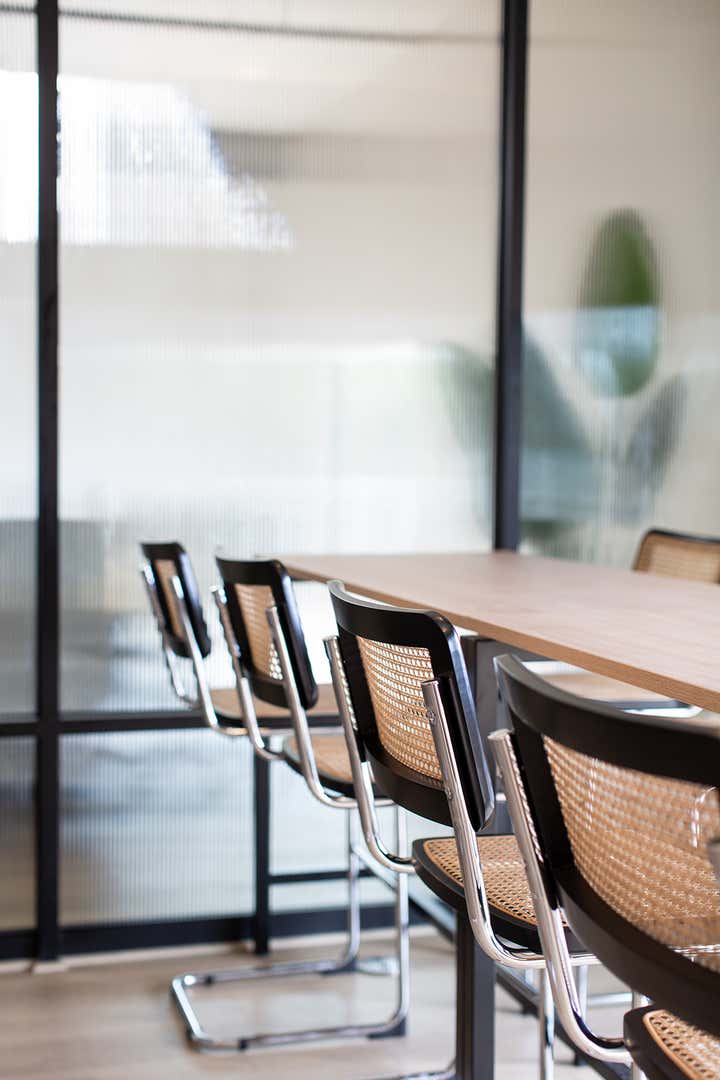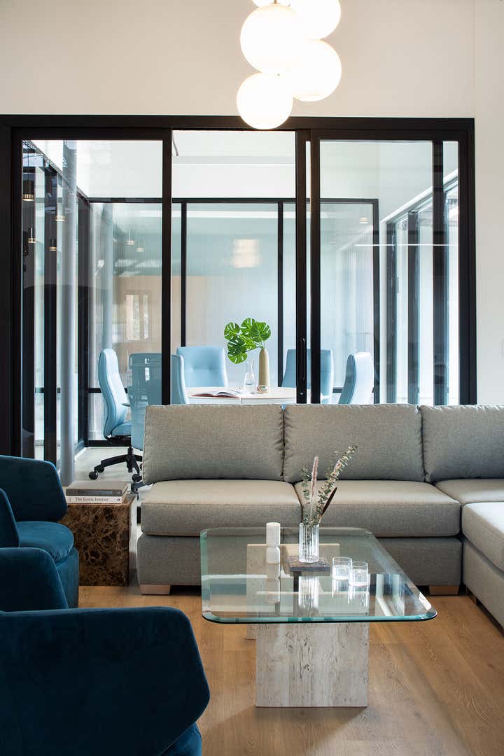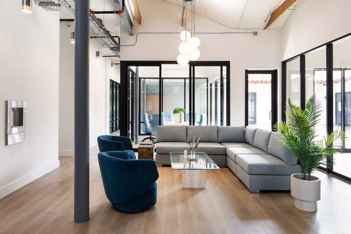 Our new minimalist office design on LA’s Pacific Coast Highway offers wide walkways, glass partitions and both private and public meeting spaces for small, large or individual work. The space was previously multiple closed units only accessible through a central courtyard. We created a more open plan with framed glass walls and doors that would better circulate light and air, and filled the space with a nod to design history in vintage sourced and influenced furnishings. Colors are inspired by local nature, muted and soft and complementary of water, clay, palms, succulents and the sun kissed California Coast. Textures and materials are comfortable and reminiscent of a home environment. The vision for the kitchen was to foster relationships and be a place of gathering and cooking with chef appliances and even kombucha and gold brew taps. As our world normalizes we hope the office, while a complex, evolving establishment still remains a place of connection, of personalities and of unforgettable action.
