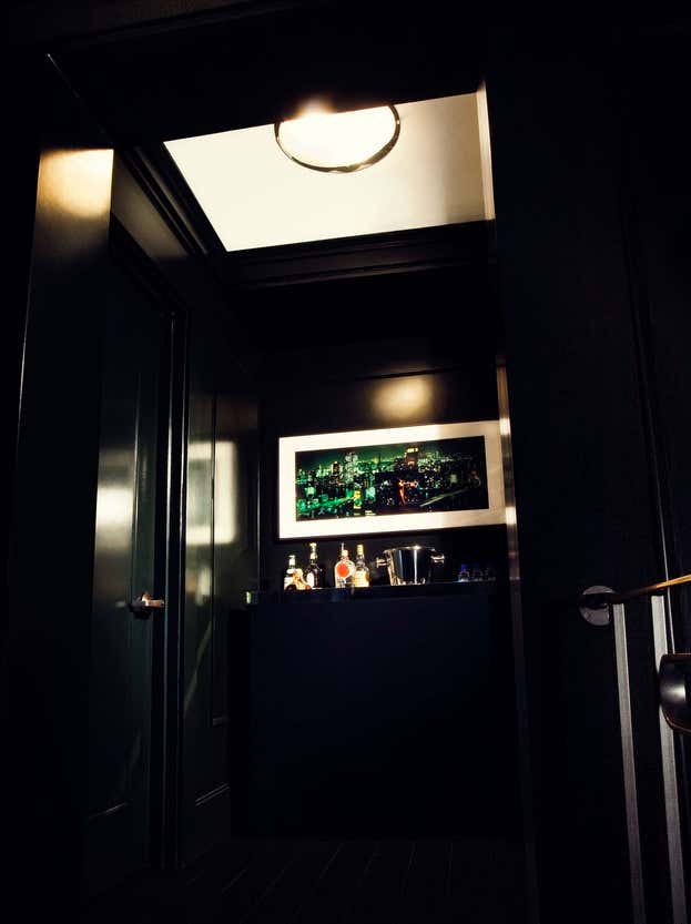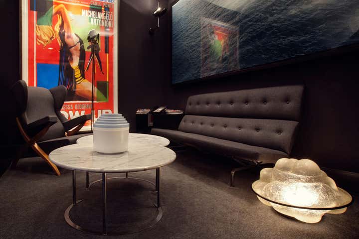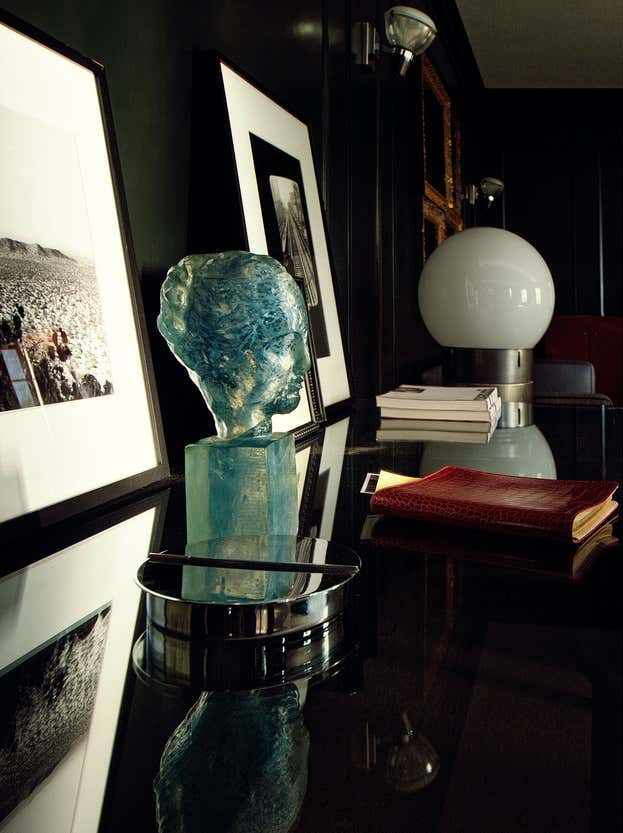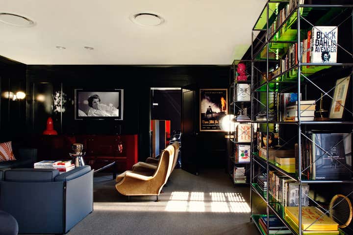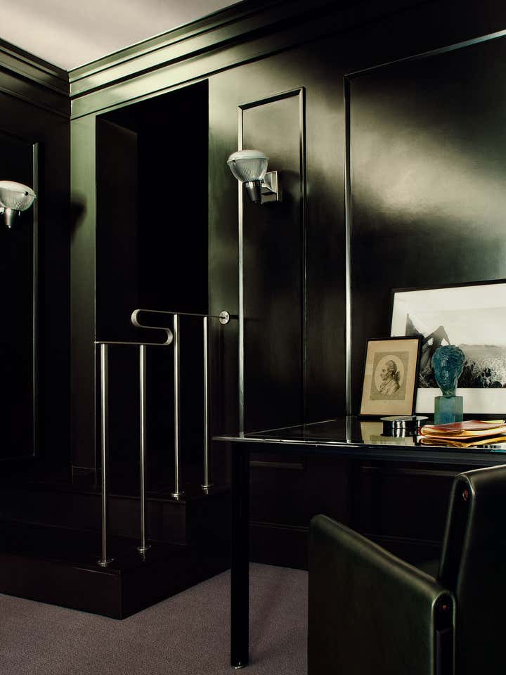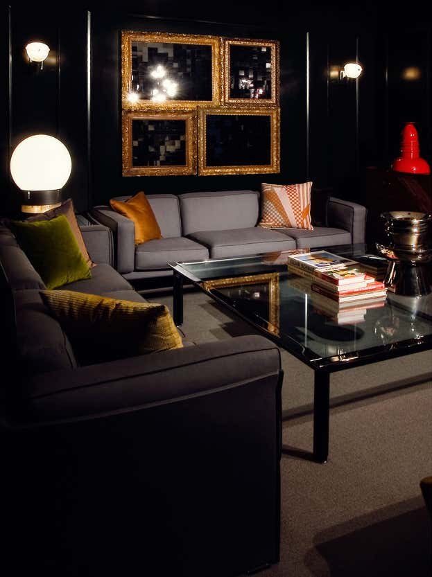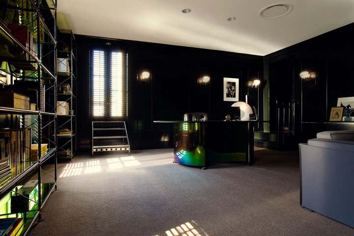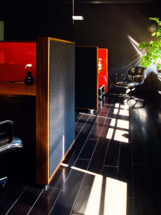 Designing for the president of a major film studio, our primary goal was to transform a series of boxy, beige, low-ceilinged rooms with Southern exposure into a stylish executive suite with a cinematic feel. Instead of wood paneling, we chose to lacquer the primary room s walls and new wood shutters a dark petrol green. Walnut framed cubicles for assistants have grey flannel exteriors with high-gloss tomato red laminate interiors.