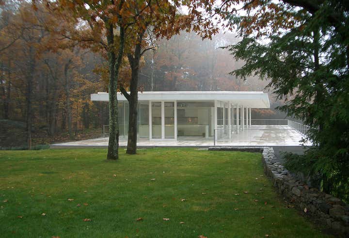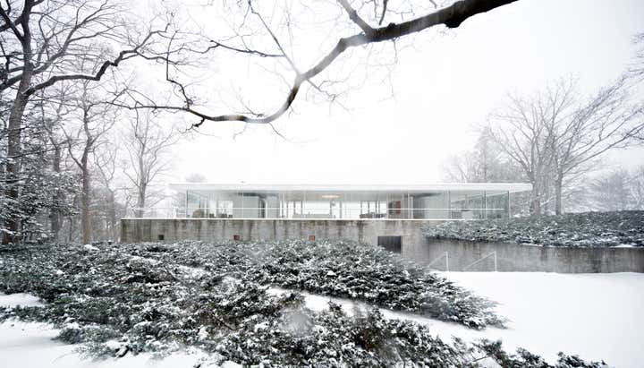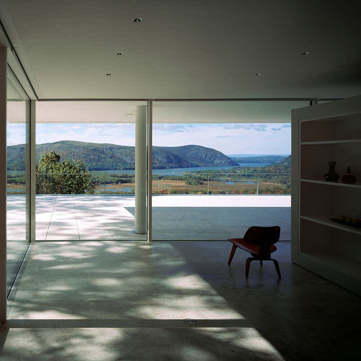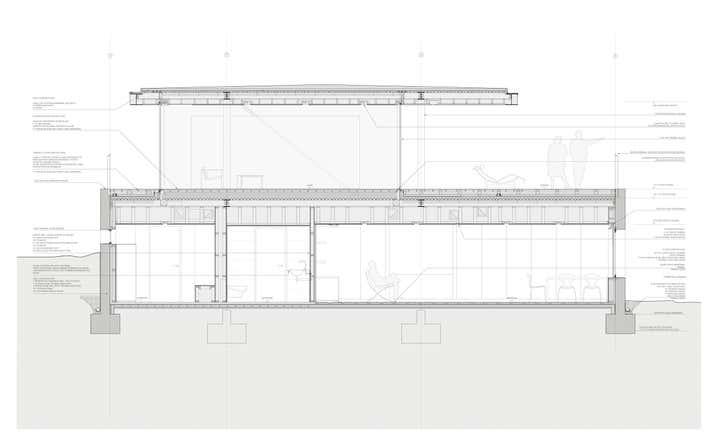 In a place of impressive beauty, Alberto Campo Baeza established a platform that underlines the landscape seeking to enhance it. A large long box is thus built, 122 feet long by 54 feet wide by 12 feet high, with sturdy concrete walls that accentuate its relationship to the land. This ground floor sits on the footprint of an old hunters shed, where the soil is mainly bedrock. Dynamiting and excavation was required to prepare the concrete footings. The ground floor structure is a mixed bearing concrete perimeter wall with interior metal columns; the exterior wall was formed with wood planks and poured in one time, with no construction joints. The roof of this box is flat, paved in stone, travertine, so that we may use it.