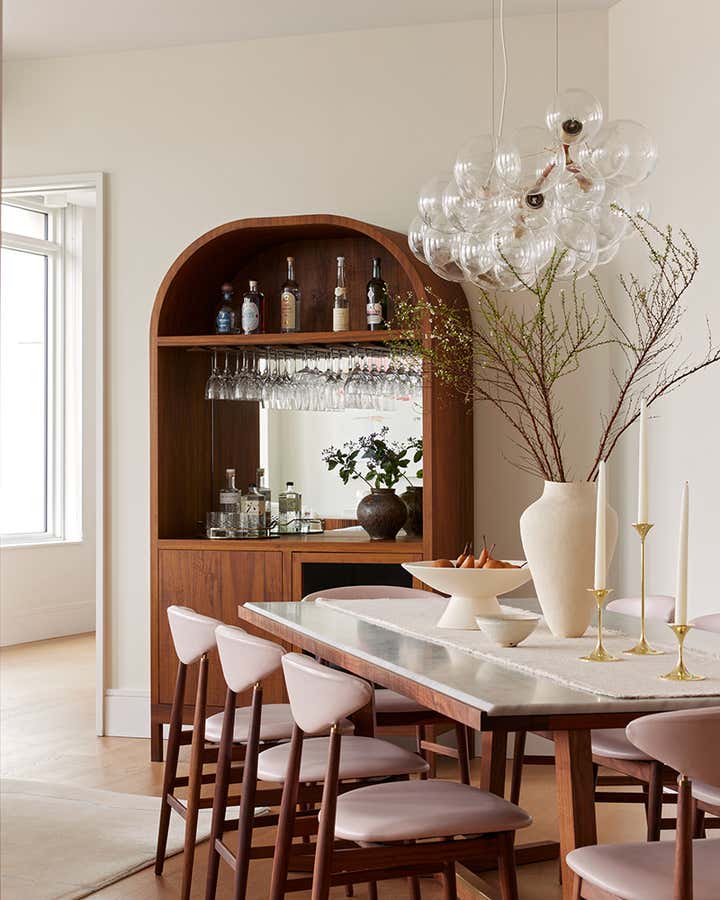 Bespoke bar designed by Laurie Blumenfeld Design. Ethereal marble and walnut dining table, custom blush leather chairs and Pelle chandelier create the perfect mood for fun-fulled dinner parties.