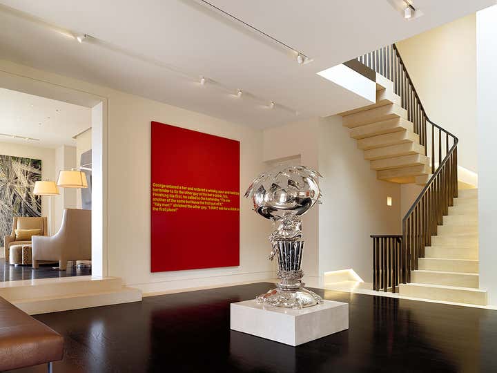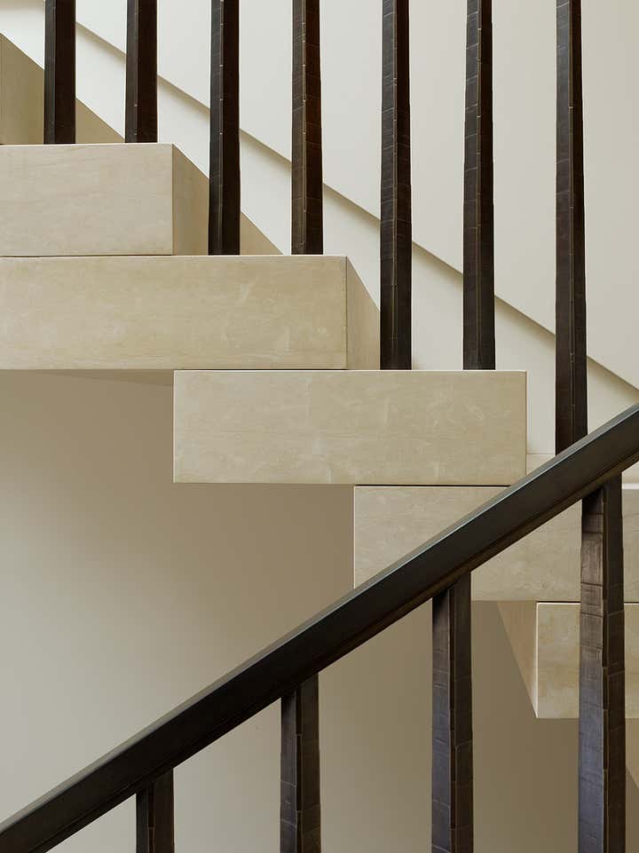 This Pacific Heights property, a historic landmark 1924 home designed and built by the architect G. Albert Lansburgh, is exceptional in that it runs completely through the block, from Pacific to Broadway. Our design for the renovation of the home was to accommodate a family and an extensive collection of modern art, using the contrast of the historic home and the modern interiors to highlight the benefits of both, and to be an elegant background for the client’s expansive modern art collection. Design features include a Donald Judd inspired, cantilevered stone staircase with hammered bronze railing adjacent to a large double height entry hall with skylight above.