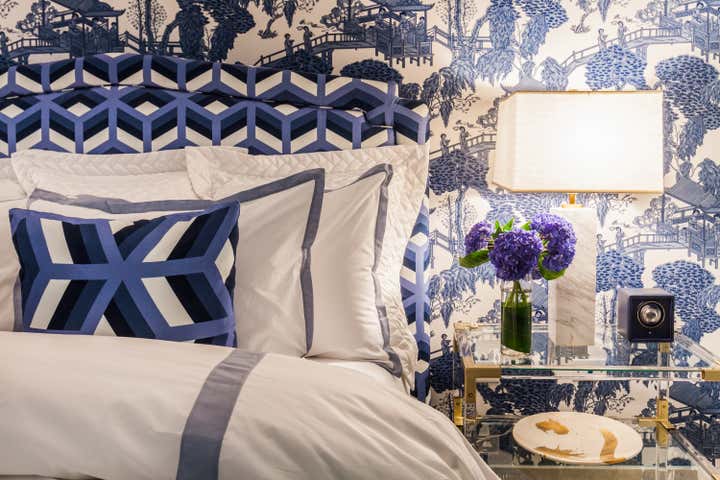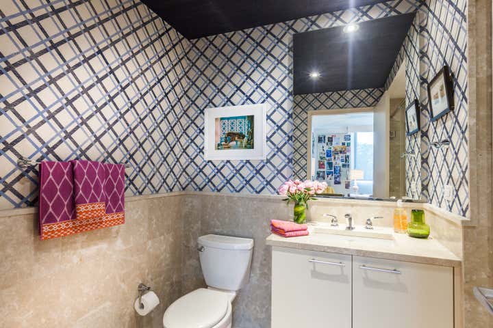 From the moment you step out of the elevator you know you are in for a treat. The fashion editorial photograph of the glass encased model sets the tone of whats behind the main door. Bold colors and art are the inspiration for this interior designers home. Fearless to kelly green walls that wrap the living room and dining room allow for the eclectic furniture pieces to come alive. The combination of a pink chair with the yellow sofa show how strong colors palettes can work perfectly in a space. The dining room is a stunning blend of modern with old romanticism. The "Study for La Grande Jatte , by Georges Seurat, 1884-5" in the National Gallery and the amazing fashion editorial piece of Alice in Wonderland by a Barcelona fashion photographer create a dining room to remember. The master bedroom chinoiserie wallpaper with the bold patterns on the upholstered bed make a bold move look peaceful and chic. This home is a great testament of living surrounded by the things you love...