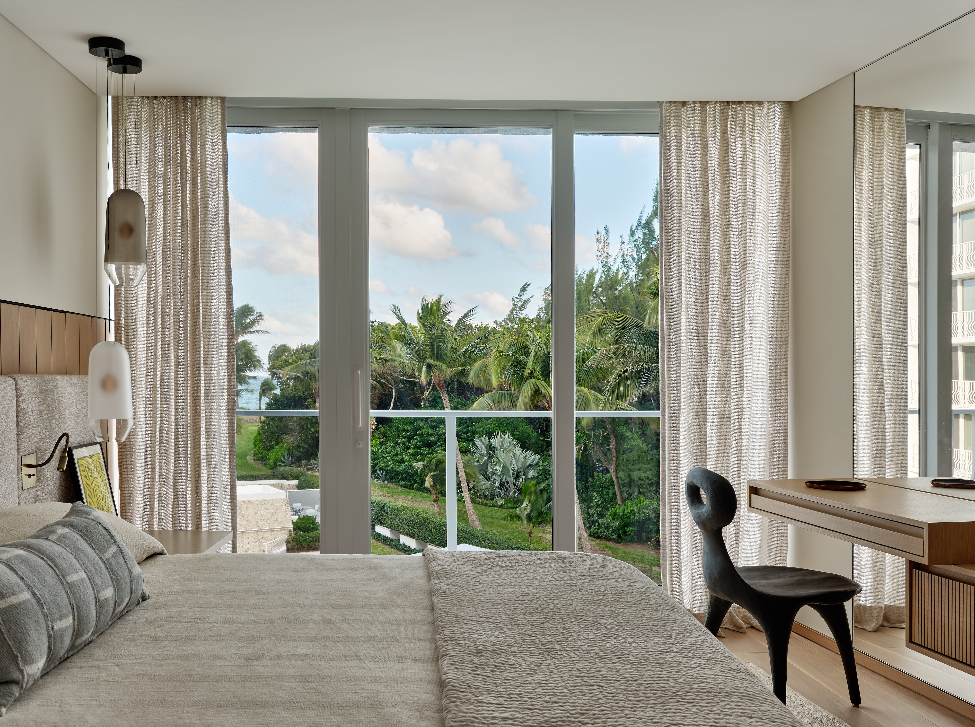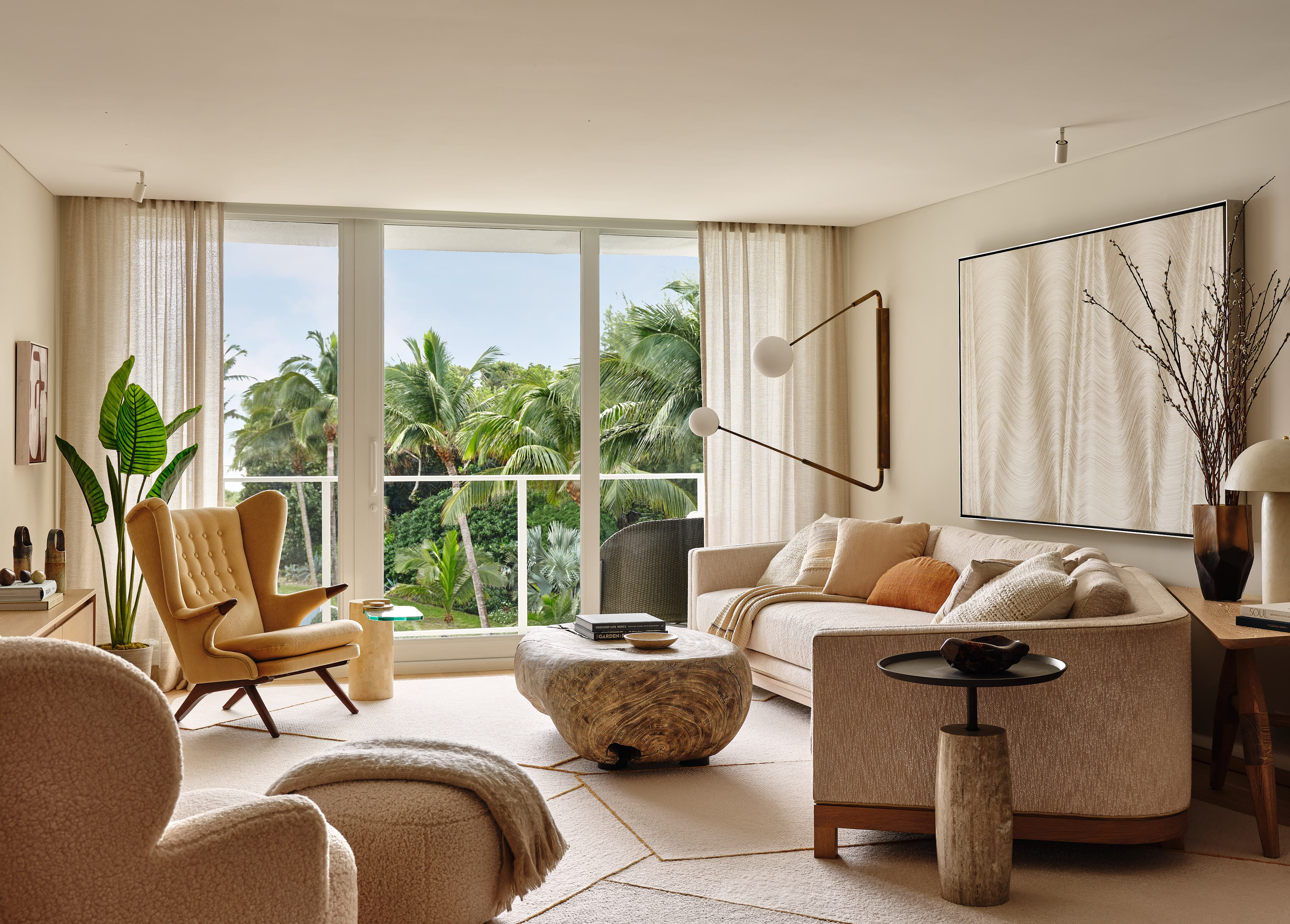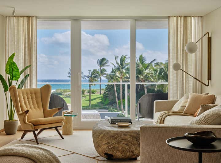 In Palm Beach, this 1,344-square-foot getaway for Workshop/APD founder and principal Andrew Kotchen and his family began as a total renovation challenge. Situated within a historic, s-shaped modernist building, no two walls are parallel, creating complex spatial conditions. Over 14 months, the space was gutted to bare concrete and carefully rebuilt with a focus on fluidity, softness, and connection.