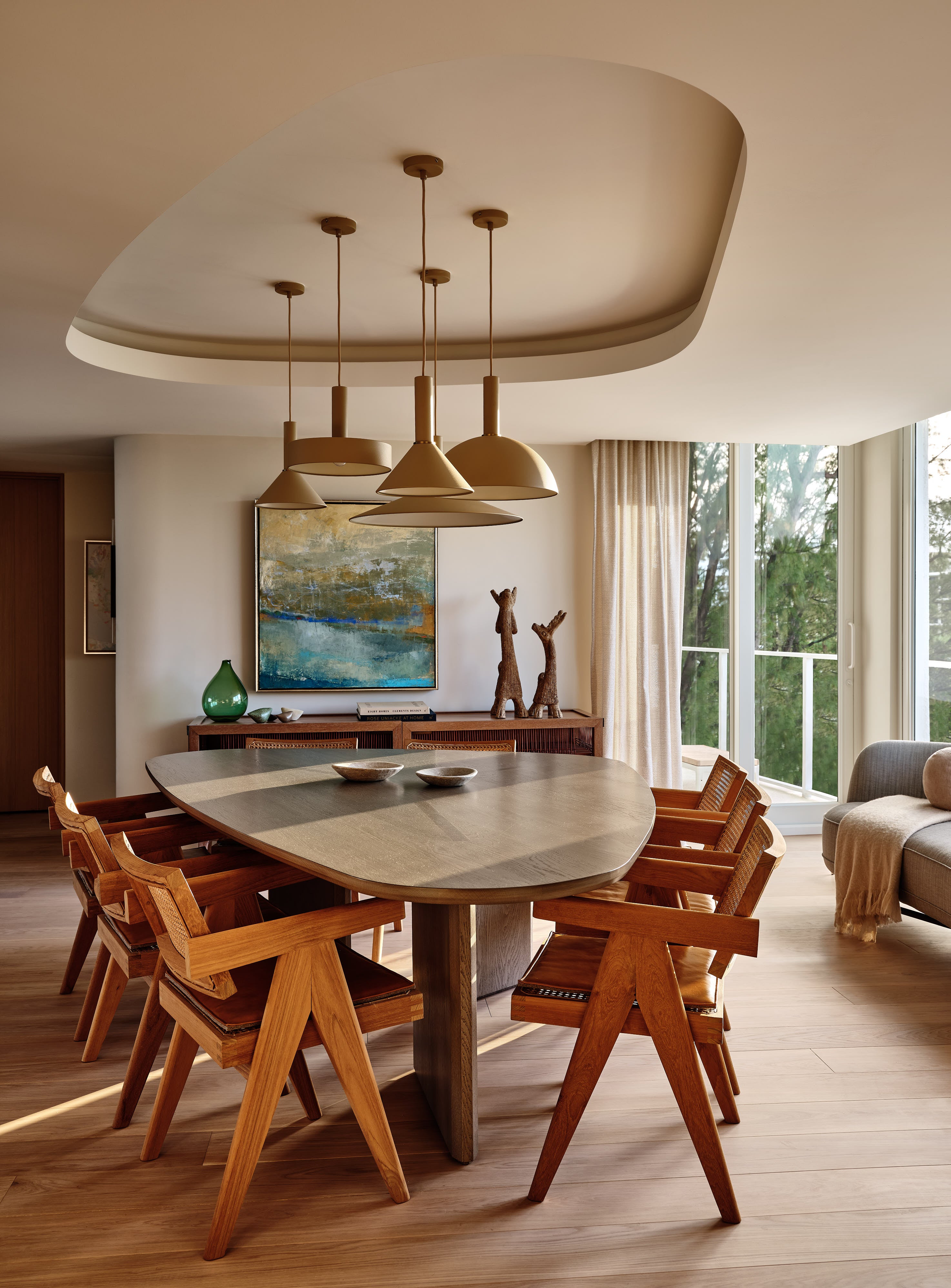 Ultimately, the home feels both soft and precise. It is a place where the boundaries between architecture, design, and nature dissolve. It stands as a personal refuge shaped by light, material, and the unique geometry of the building itself.