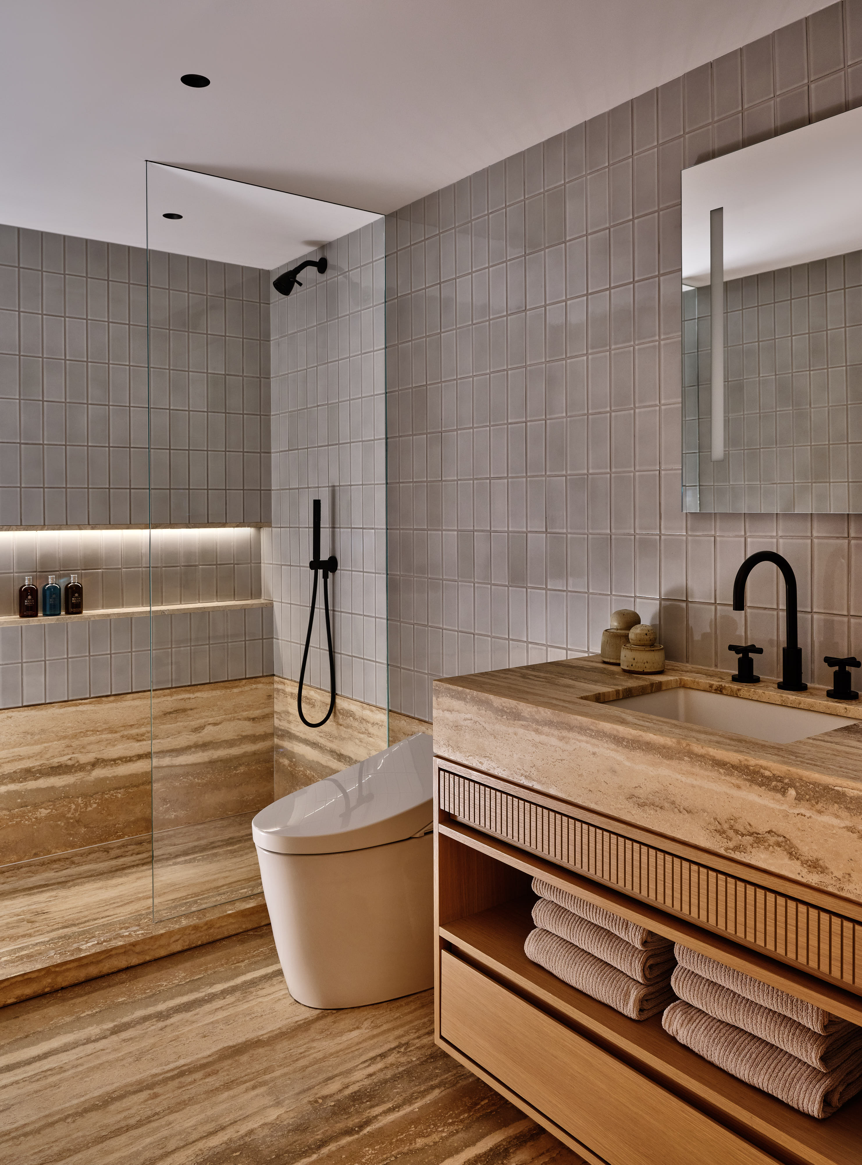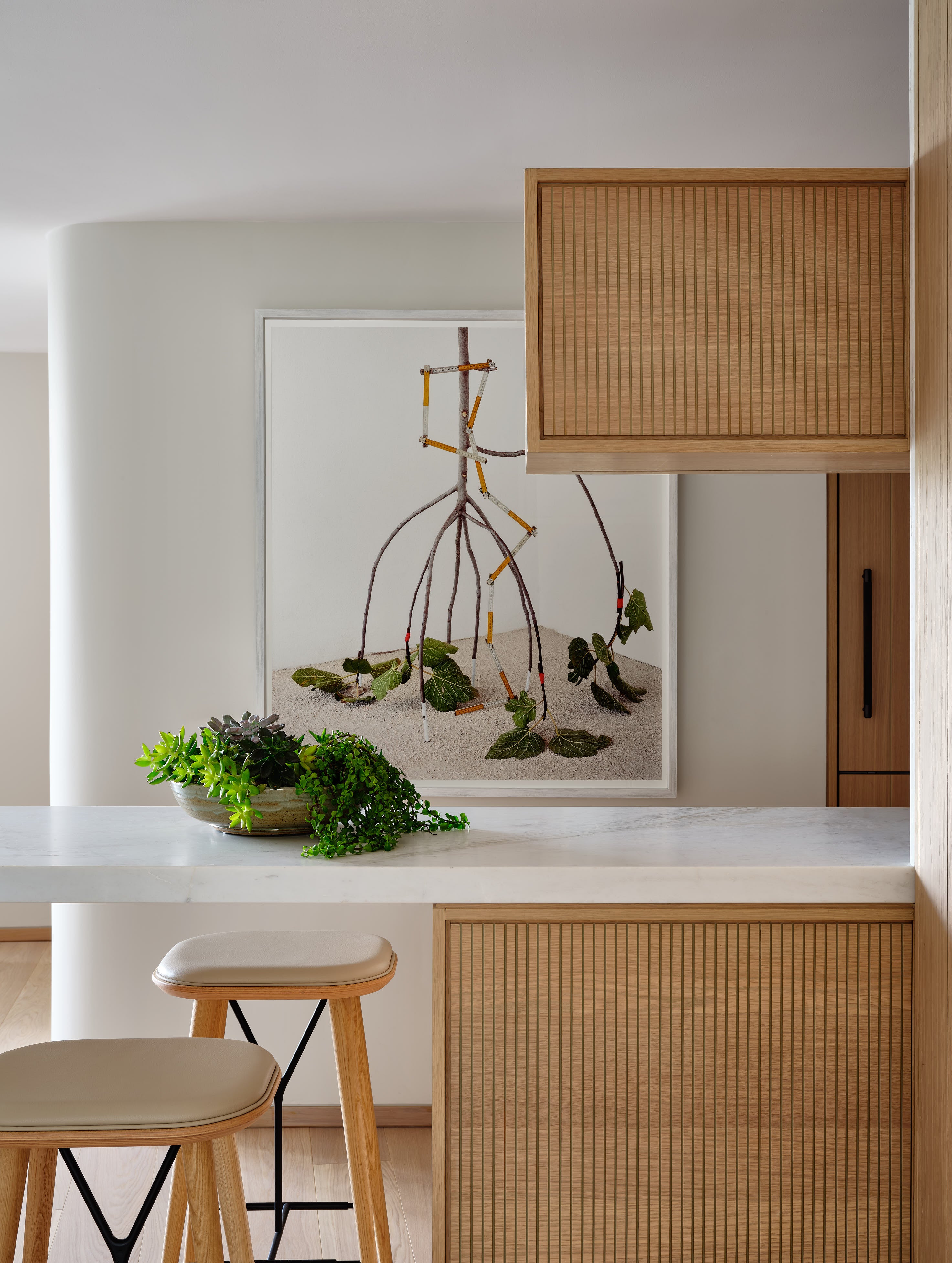 The design embraces subtle curves, from walls, to custom millwork, to furniture silhouettes, to smooth edges and create effortless transitions. Rounded forms balance the building’s angular geometry, allowing the interiors to flow naturally. A muted palette of plaster, warm oak, and layered textures adds warmth and tactility.